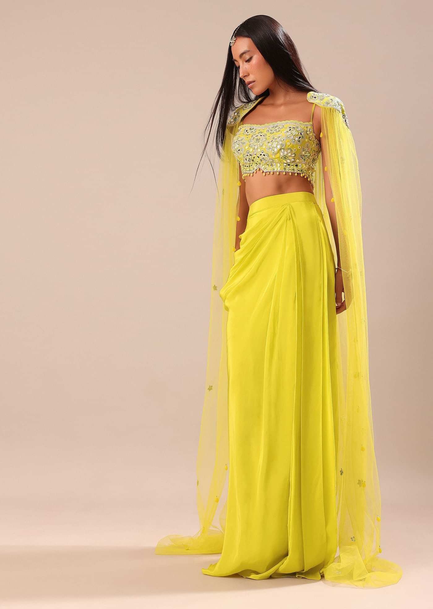 Citrus Green Draped Skirt With Embroidered Blouse And Cape
