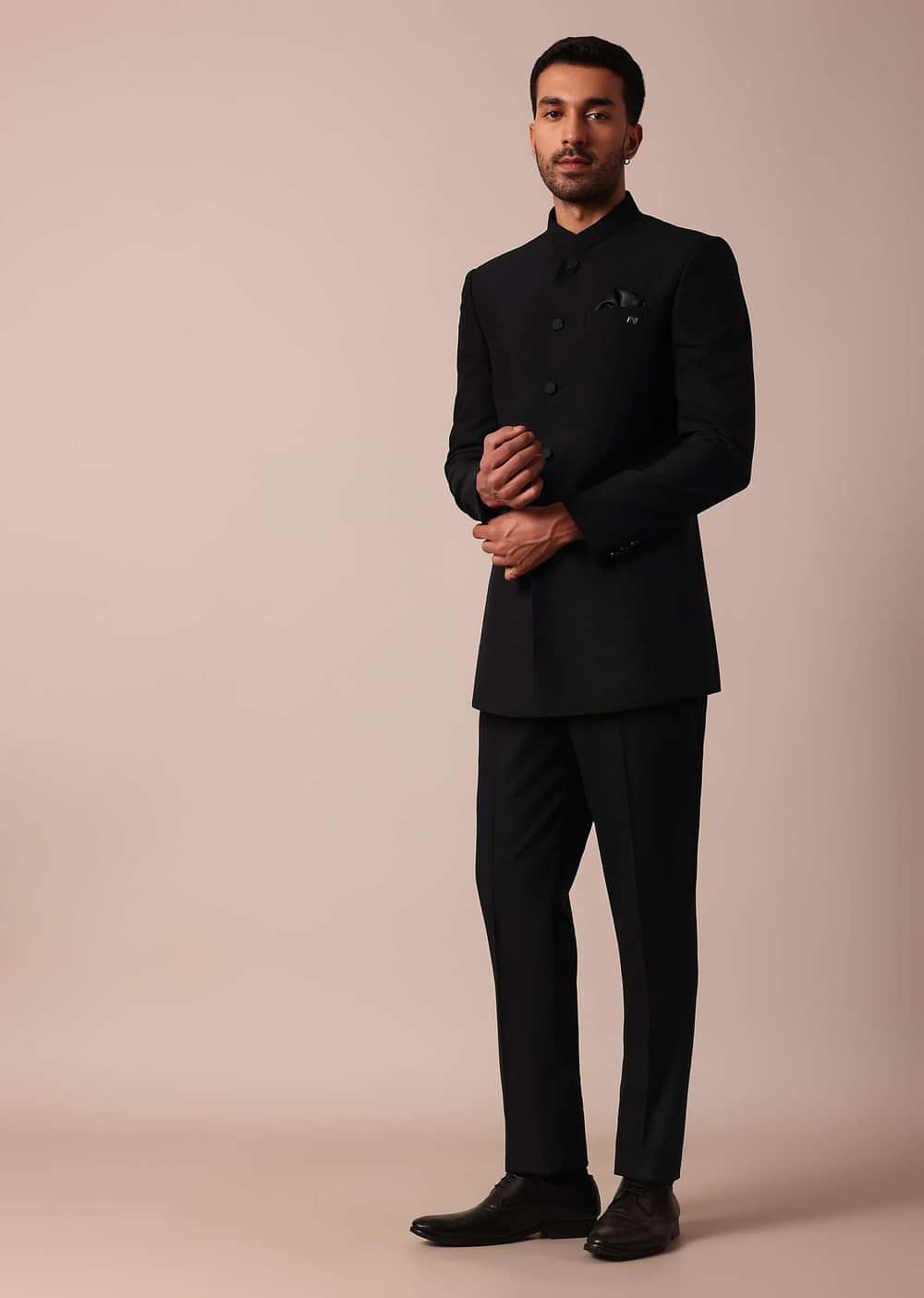 Elevate your wedding or reception look with our Classic Black Bandhgala Jodhpuri Suit, crafted in luxurious Terry Rayon. This sherwani features a timeless mandarin collar and no additional work. This outfit ideal for wedding ceremonies and receptions. Awarded as the Most Trusted Brand, we're delivering styles you love, just as promised.