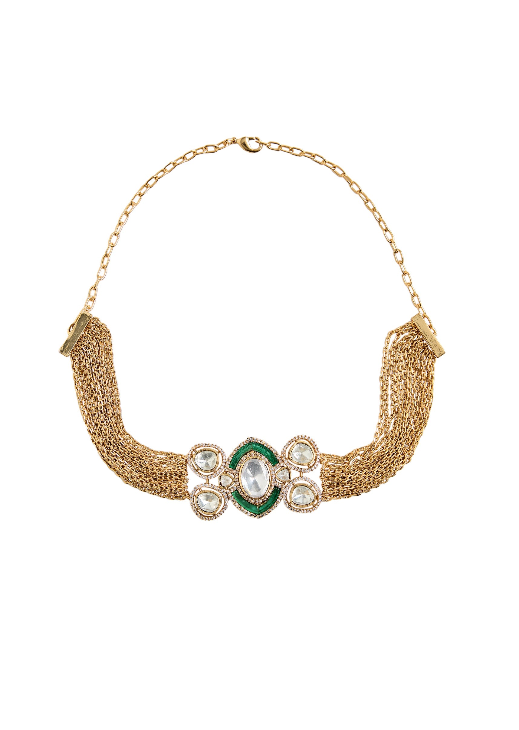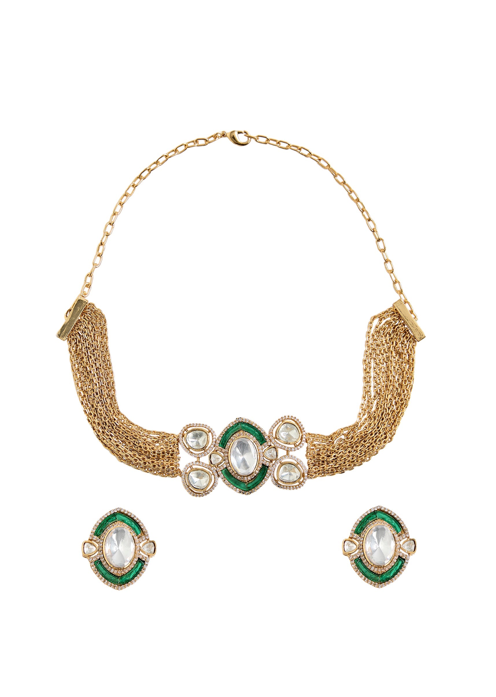 This classic kundan choker necklace set with matching stud earrings showcases green and white stones in a timeless floral motif. Perfect for adding elegance to weddings, festive occasions, or parties.... More Product Details
