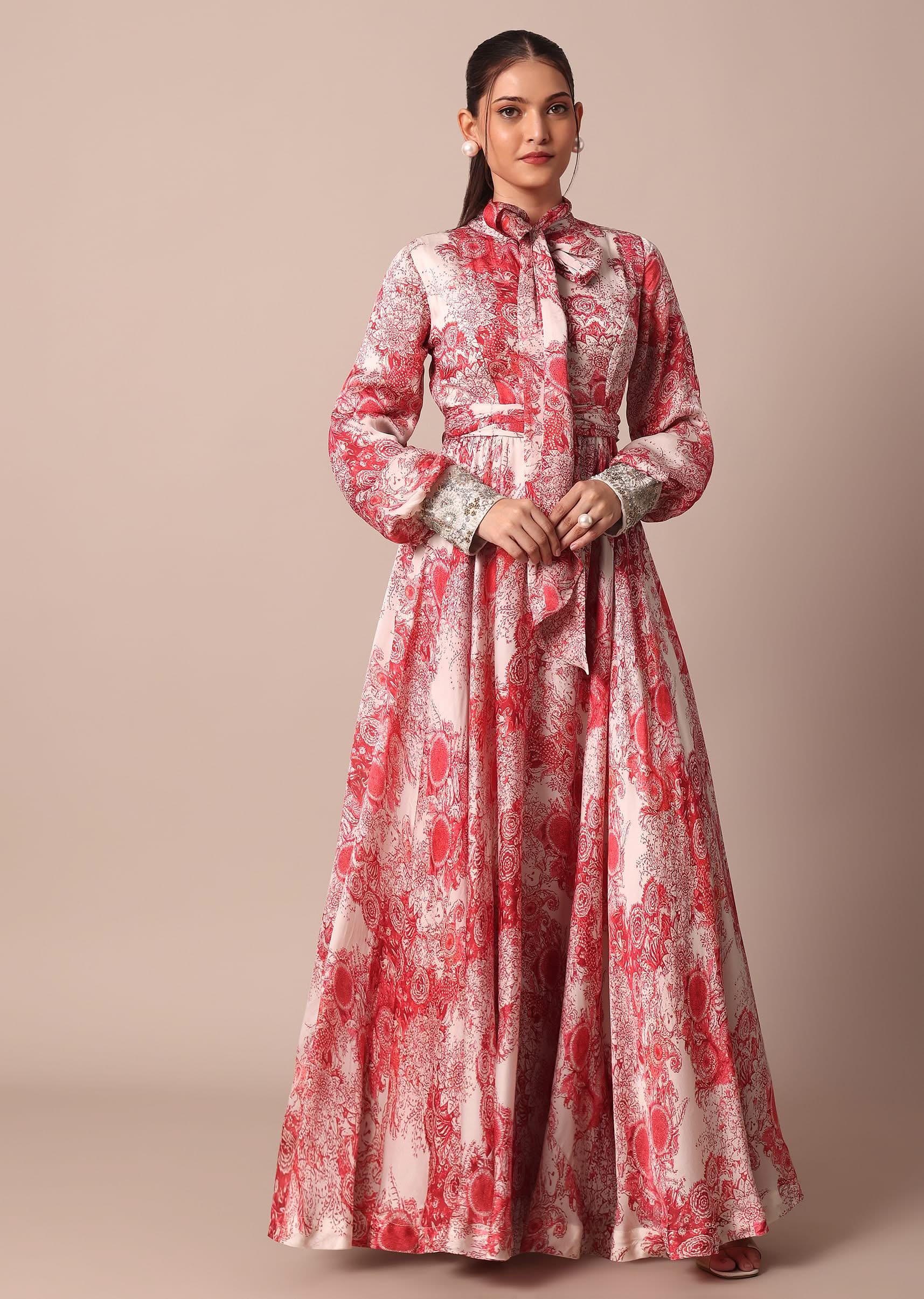 Make a casual statement with our Printed Indogown featuring exquisite embroidery on full sleeves. It is adorned with zari moti beads and cut dana detailing. The high neckline and Vneck design ensure a perfect blend of comfort and style. This pack includes one gown in a vibrant red hue with offwhite accents. Awarded as the Most Trusted Brand, we're delivering styles you love, just as promised.