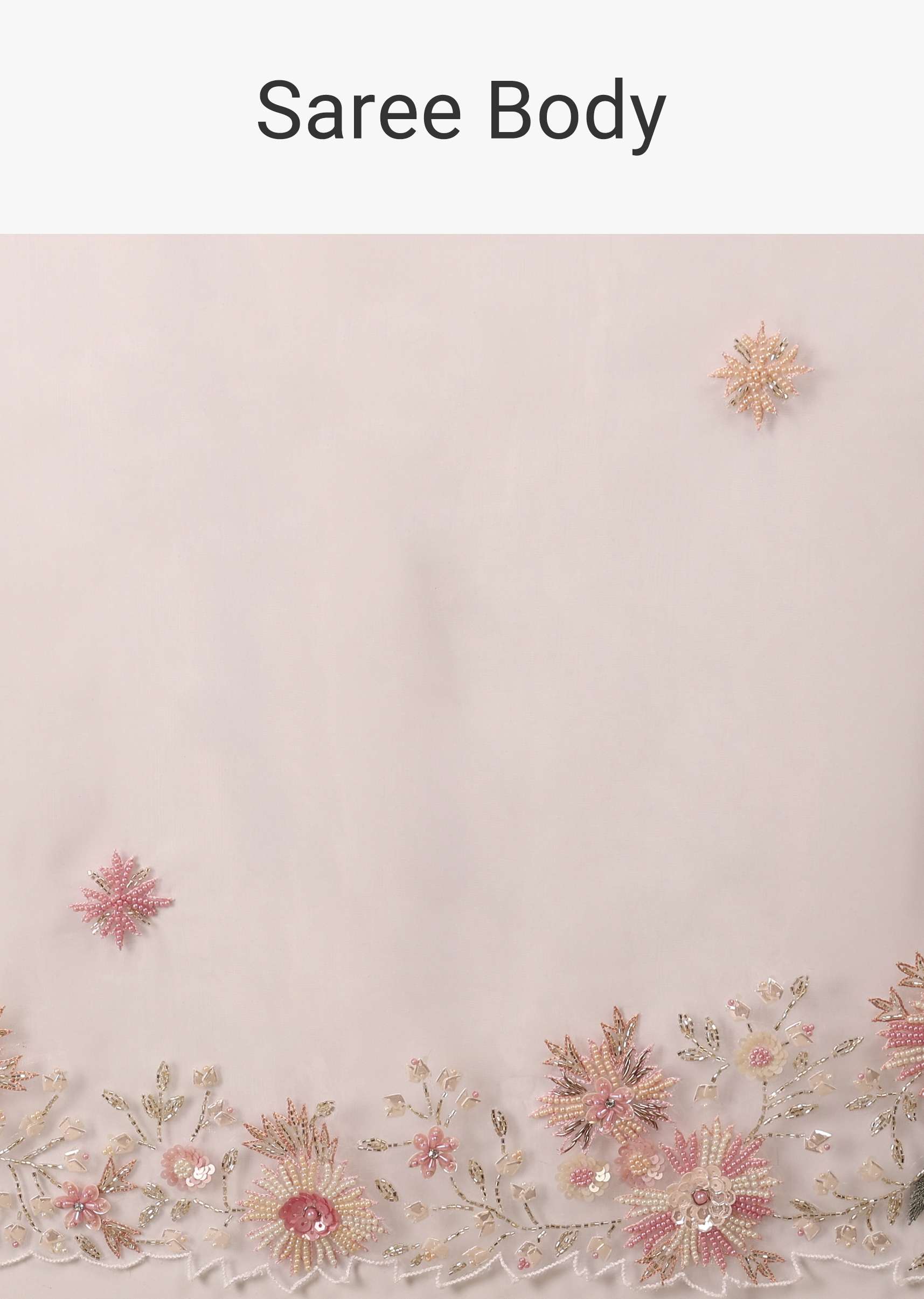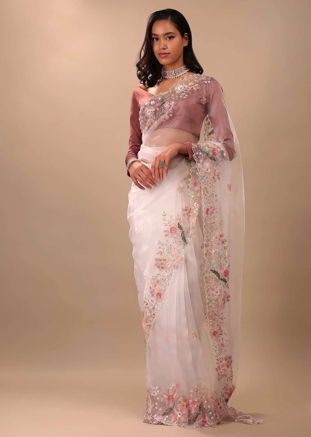 Feel as if you're on the 9th cloud with our Cloud dancer white saree. The saree is fabricated in white organza with floral embroidery in pink. The saree comes with a decently embroidered border in moti, cut dana, sequins, and zardosi. Floral motifs in zardosi and moti are crafted all over the saree. The saree comes with an unstitched blouse piece. Walk down in sheer elegance wearing our stunning white saree, crafted ESPECIALLY FOR YOU. NOTE - The saree does not come with a fall finishing. The blouse worn by the model is designed by our team for styling purposes. You can get your hands on the designer blouses by clicking on the blouse link. Awarded as the Most Trusted Brand, we're delivering styles you love, just as promised.