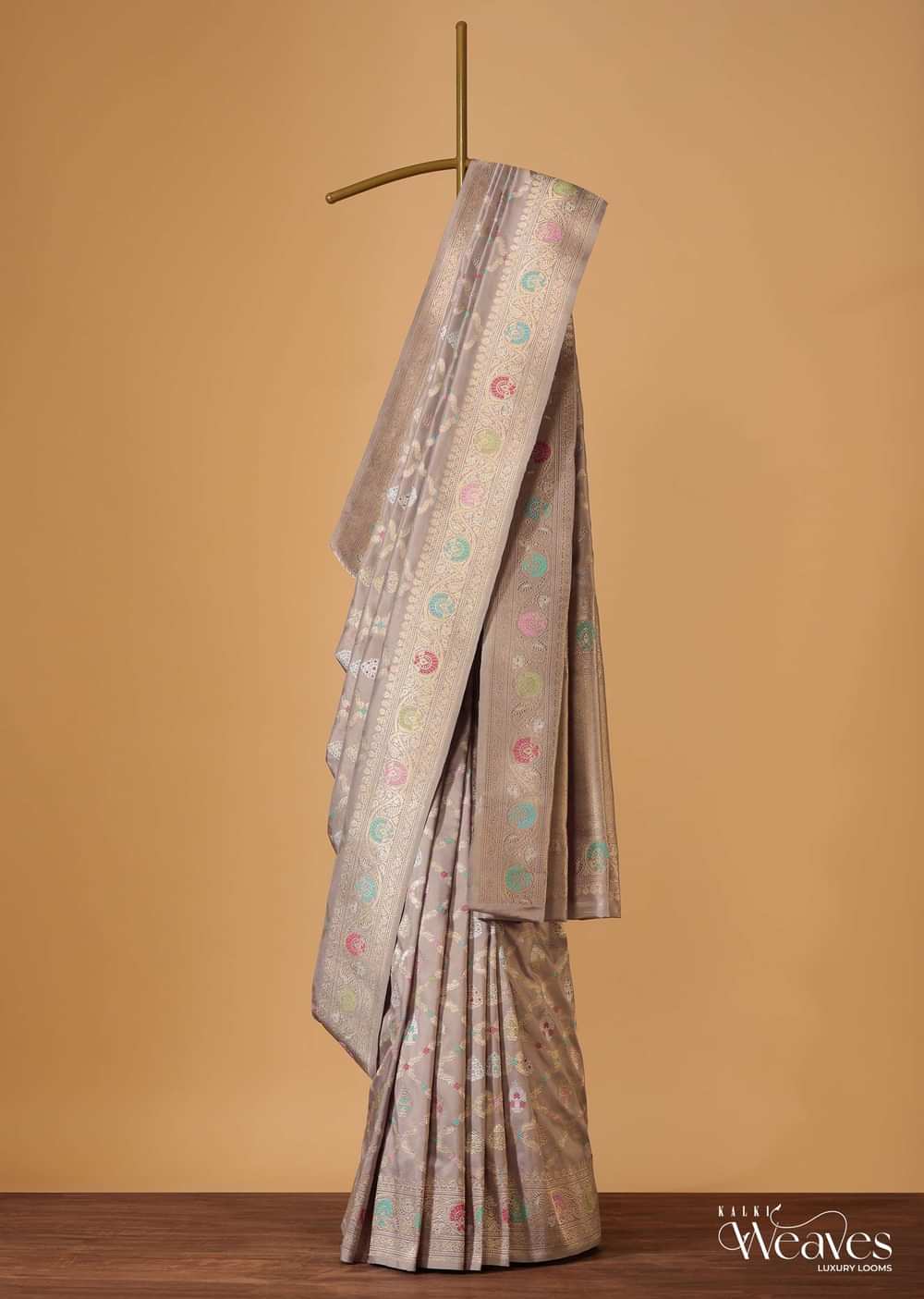 Cloud Grey Handloom Banarasi Saree In Katan Silk With 3-Gram Real Zari Weave And Unstitched Blouse