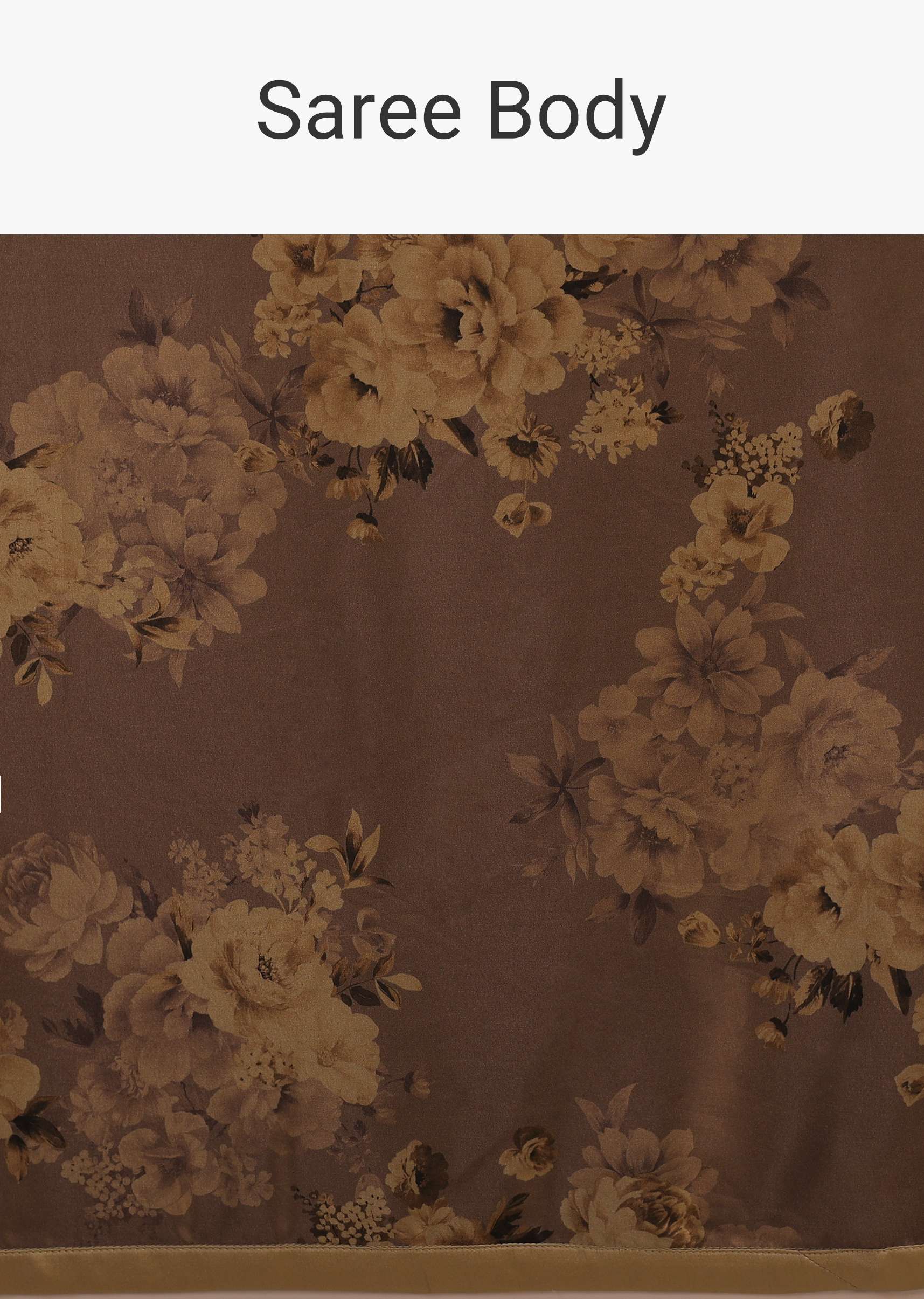 Coffee Brown Satin Saree With Floral Print And Blouse With Stone Work