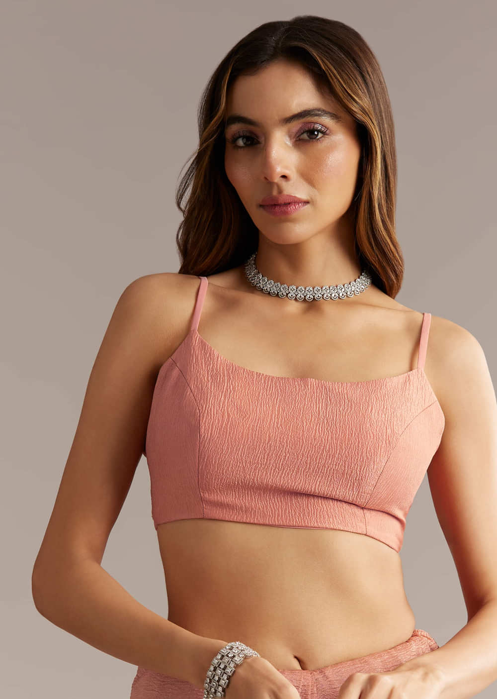 Rich copper tones make this tissue saree stand out with festive charm. Cutdana, sequins, and stones highlight the scallop border with detailed work. It is designed for celebratory moments when... More Product Details
