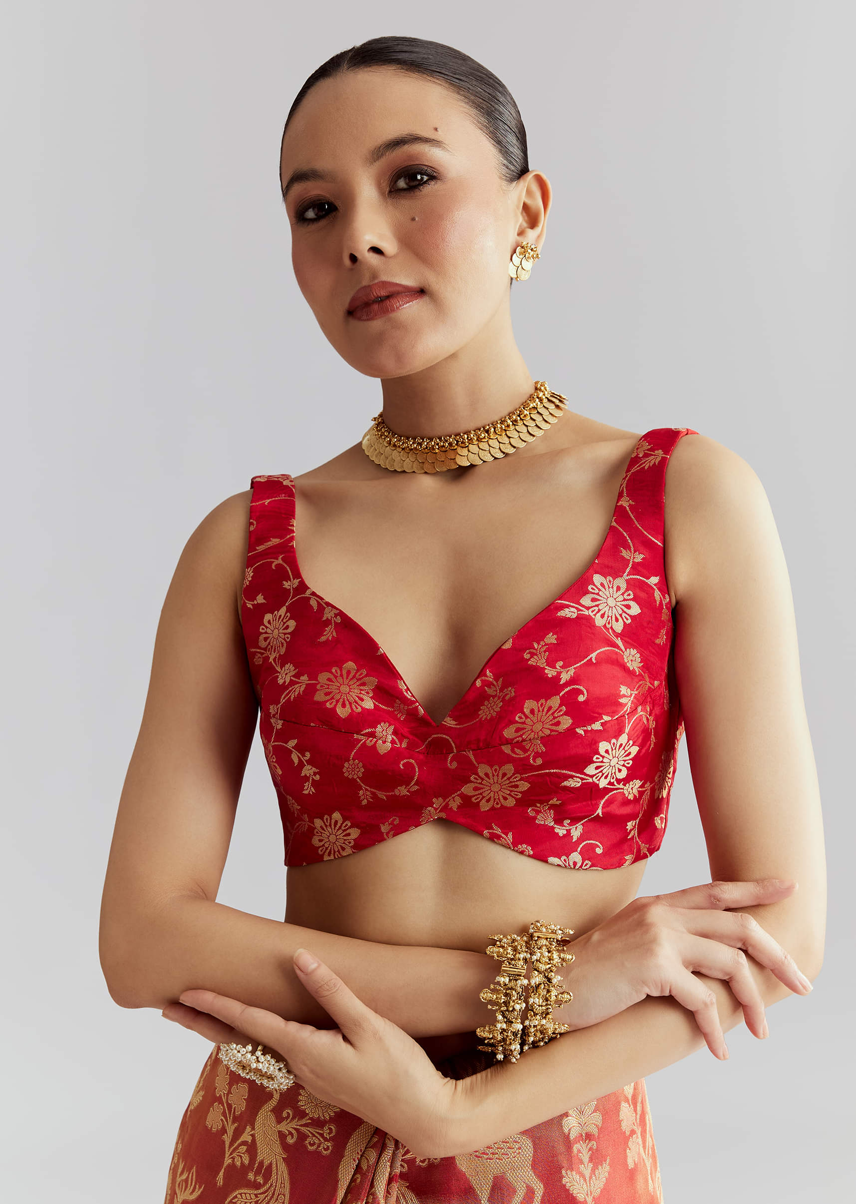 Confident and celebratory, this coral red silk woven saree scatters varied zari motifs across the body and finishes with a deep red broad border on one side. A brocade blouse adds a ceremonial note so the set feels dressed without extra effort. You feel vibrant and ready for pooja, festive and karwa chauth. Awarded as the Most Trusted Brand, we're delivering styles you love, just as promised.