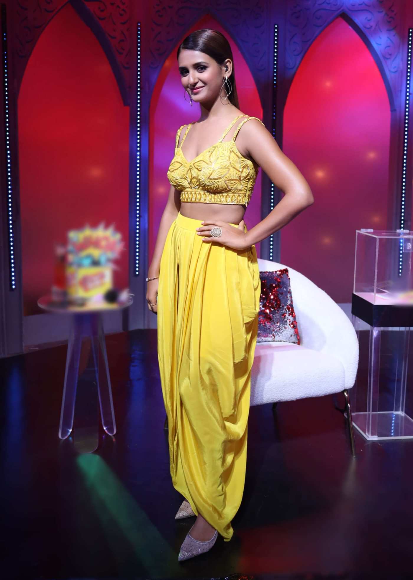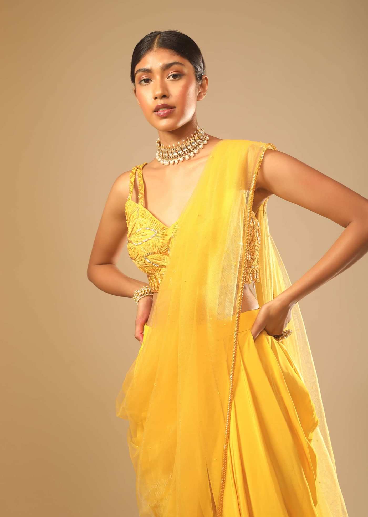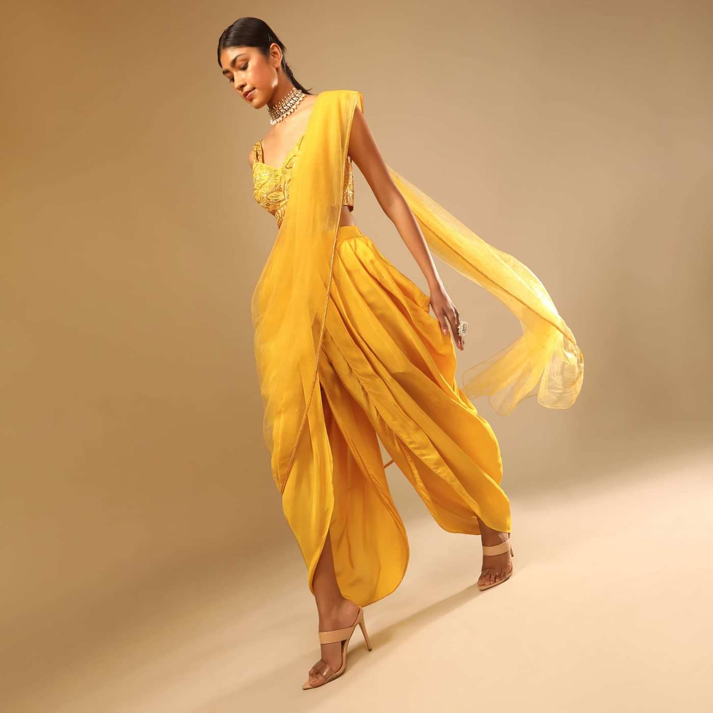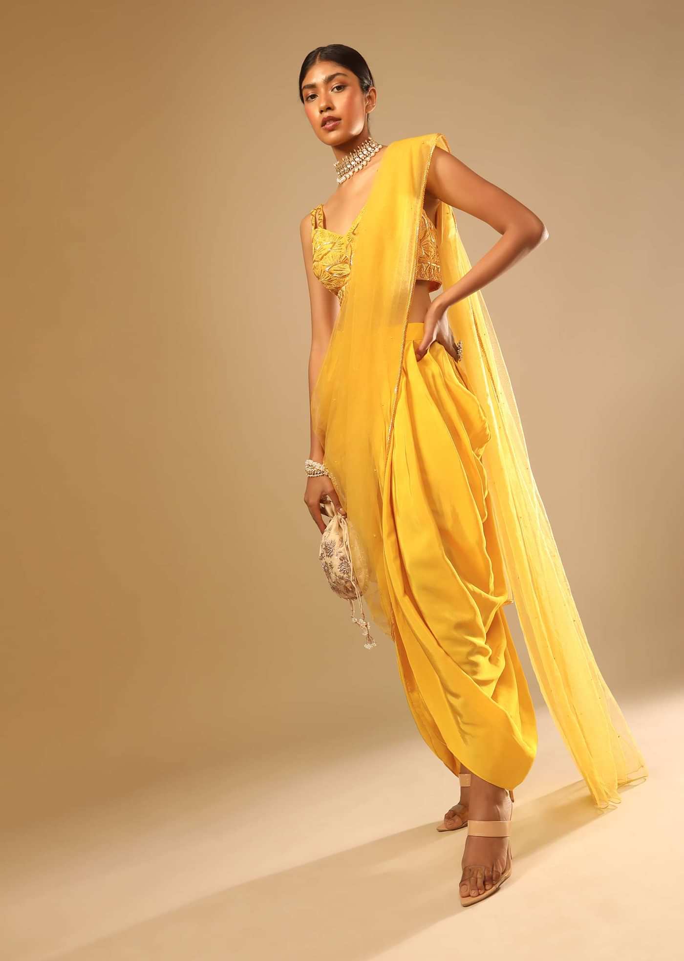 Corn yellow dhoti suit in satin crepe with a raw silk crop top. The crop top is embroidered with resham, beads and cut dana work in leaf motifs. It is... More Product Details