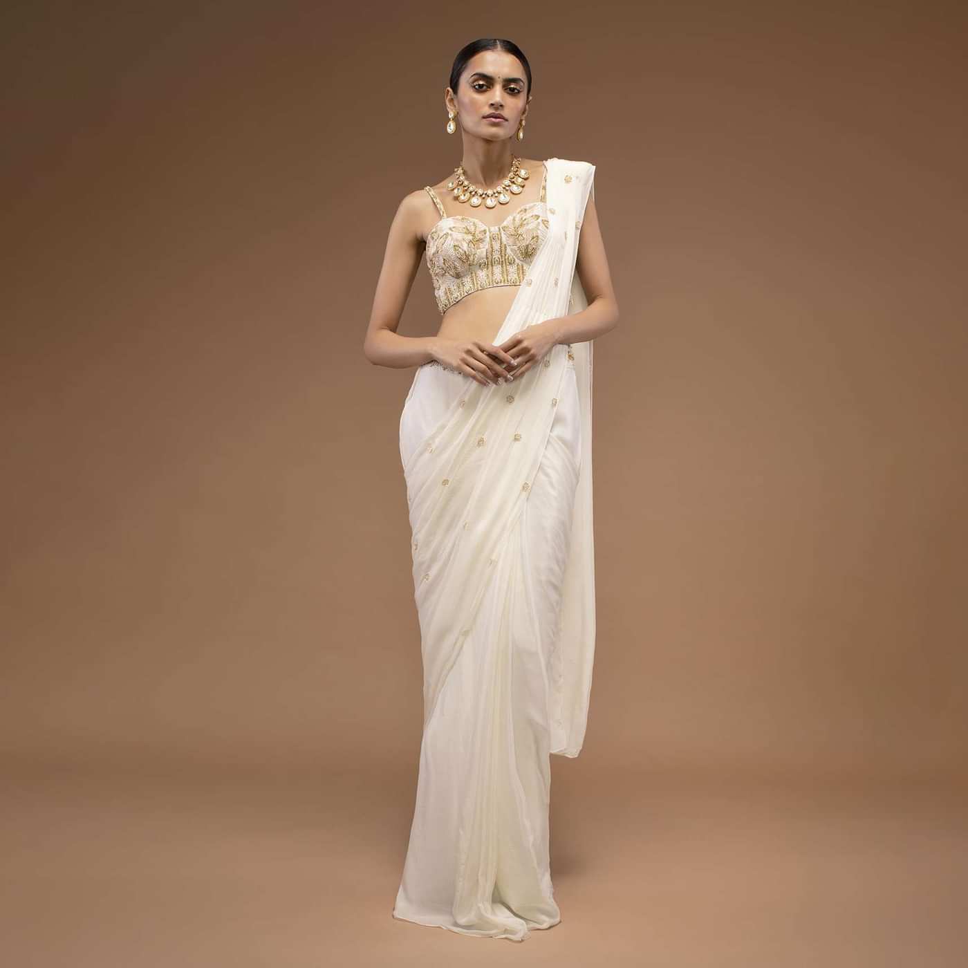 Cotton White Ready Pleated Saree With A Crop Top Set In Cut Dana Embroidery, Paired With The Spaghetti Straps With A Corset Neckline