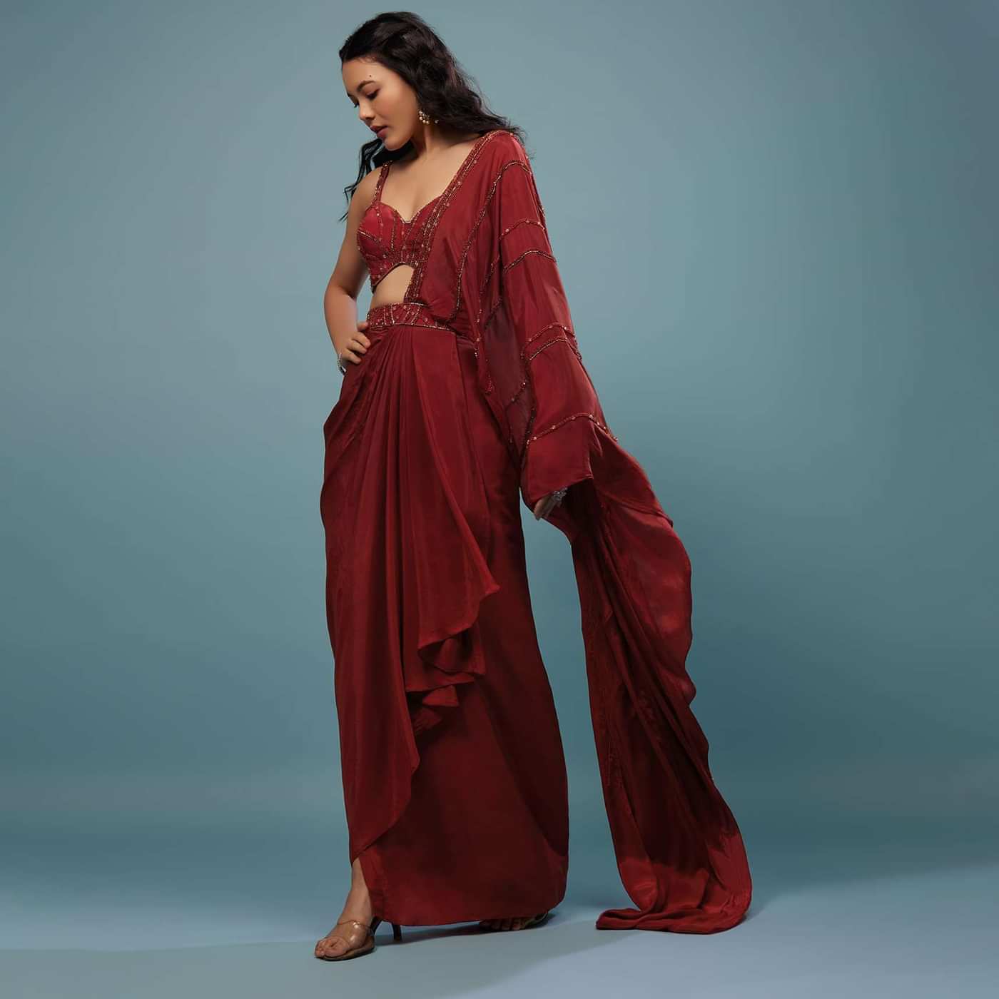 Cranberry red ready-pleated saree embroidered in stones and beads. The outfit is fabricated in crepe. The saree is a perfect touch of contemporary fashion to your wardrobe and has a... More Product Details