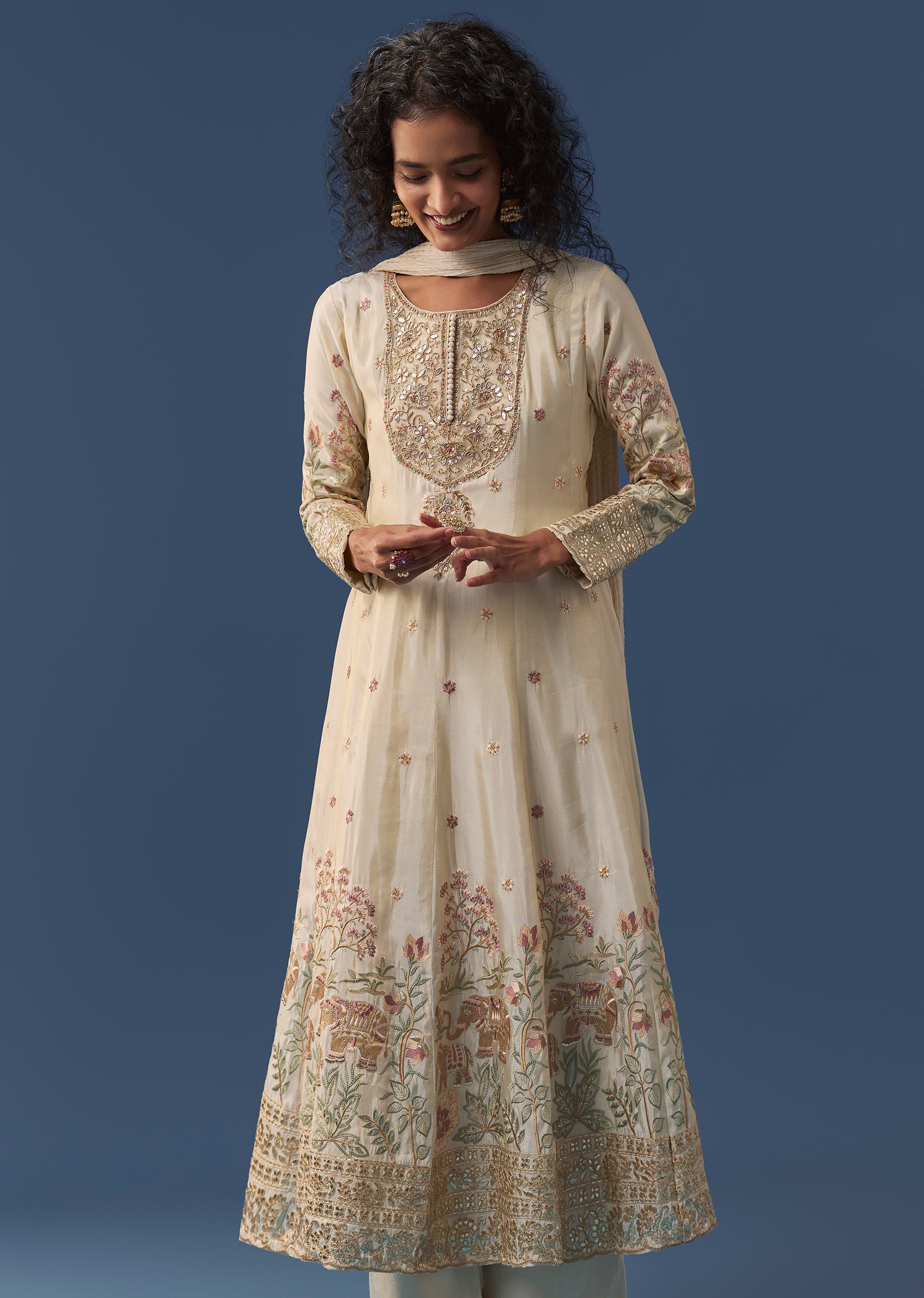Timeless and graceful, this A line resham and gotta lace work anarkali set is a classic addition to festive wardrobes. Crafted in elegant tissue fabric, the anarkali features intricate thread... More Product Details