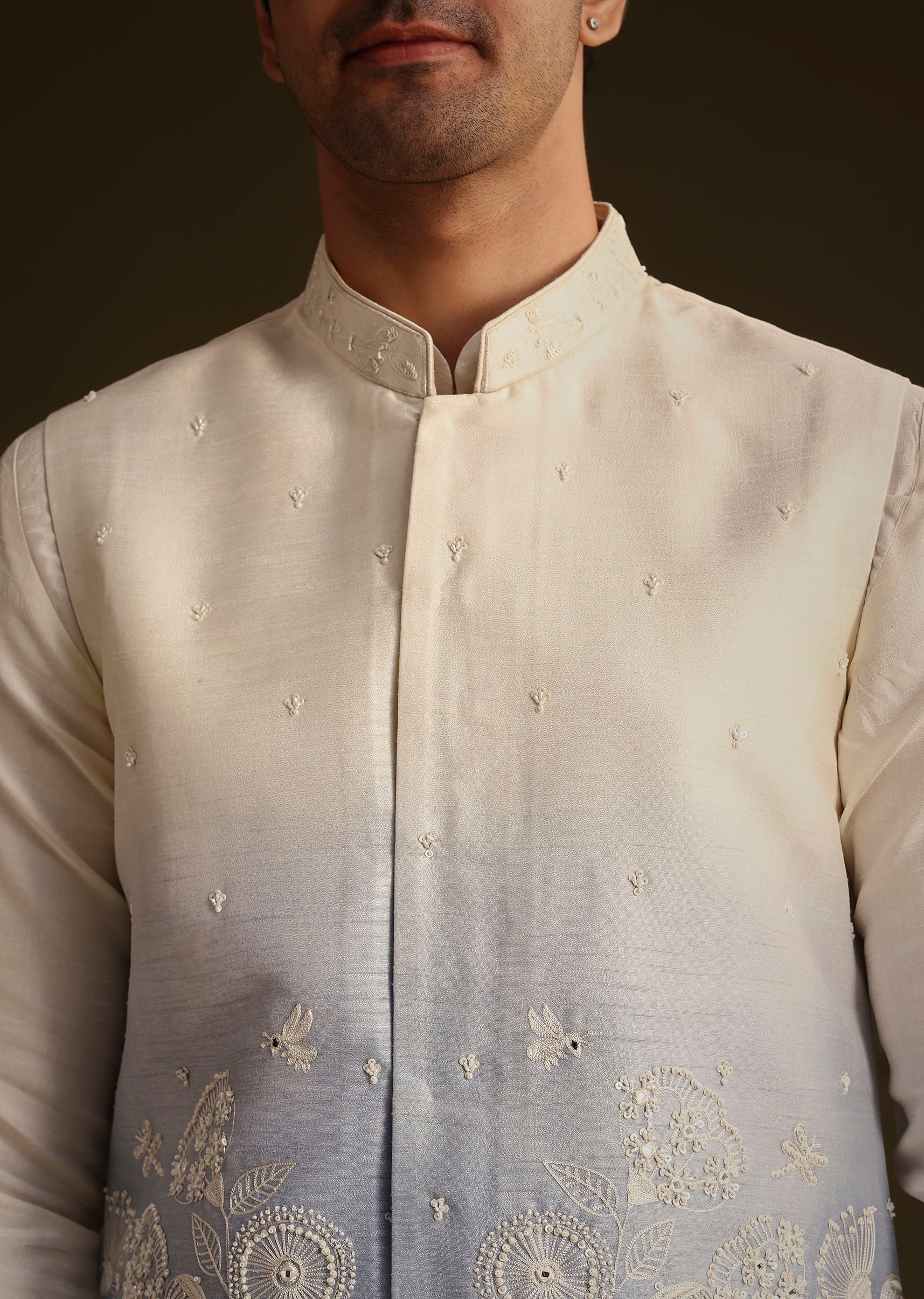 Elevate your ethnic style with this cream and blue ombre embroidered silk jacket set, showcasing a delicate gradient and intricate embroidered patterns. The soft silk fabric paired with a classic kurta and tailored bottom exudes understated sophistication, making it perfect for weddings, engagements, and festive celebrations. This ensemble blends serene hues with modern tailoring for a timeless yet contemporary look. Awarded As The Most Trusted Brand We'Re Delivering Styles You Love Just As Promised.