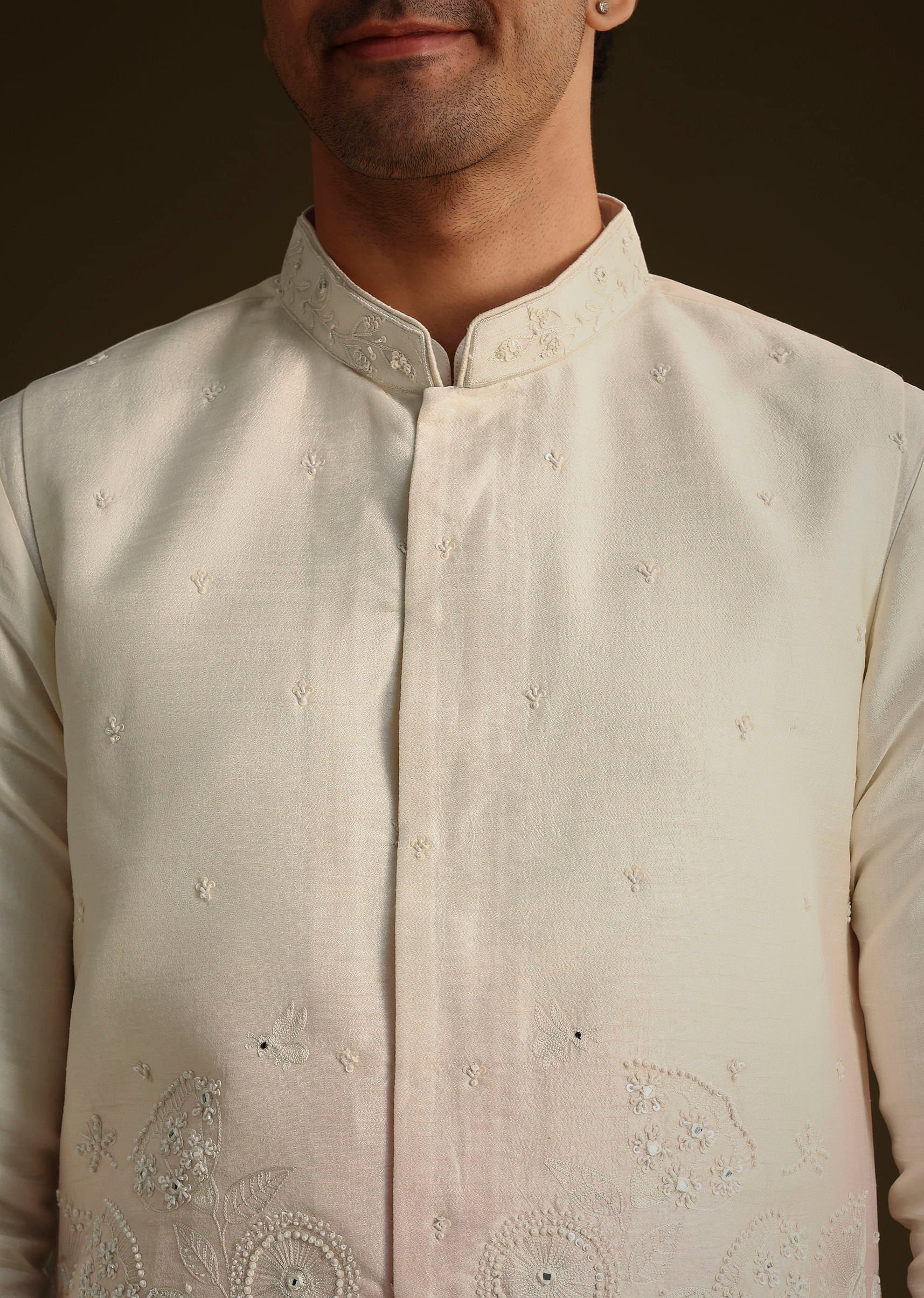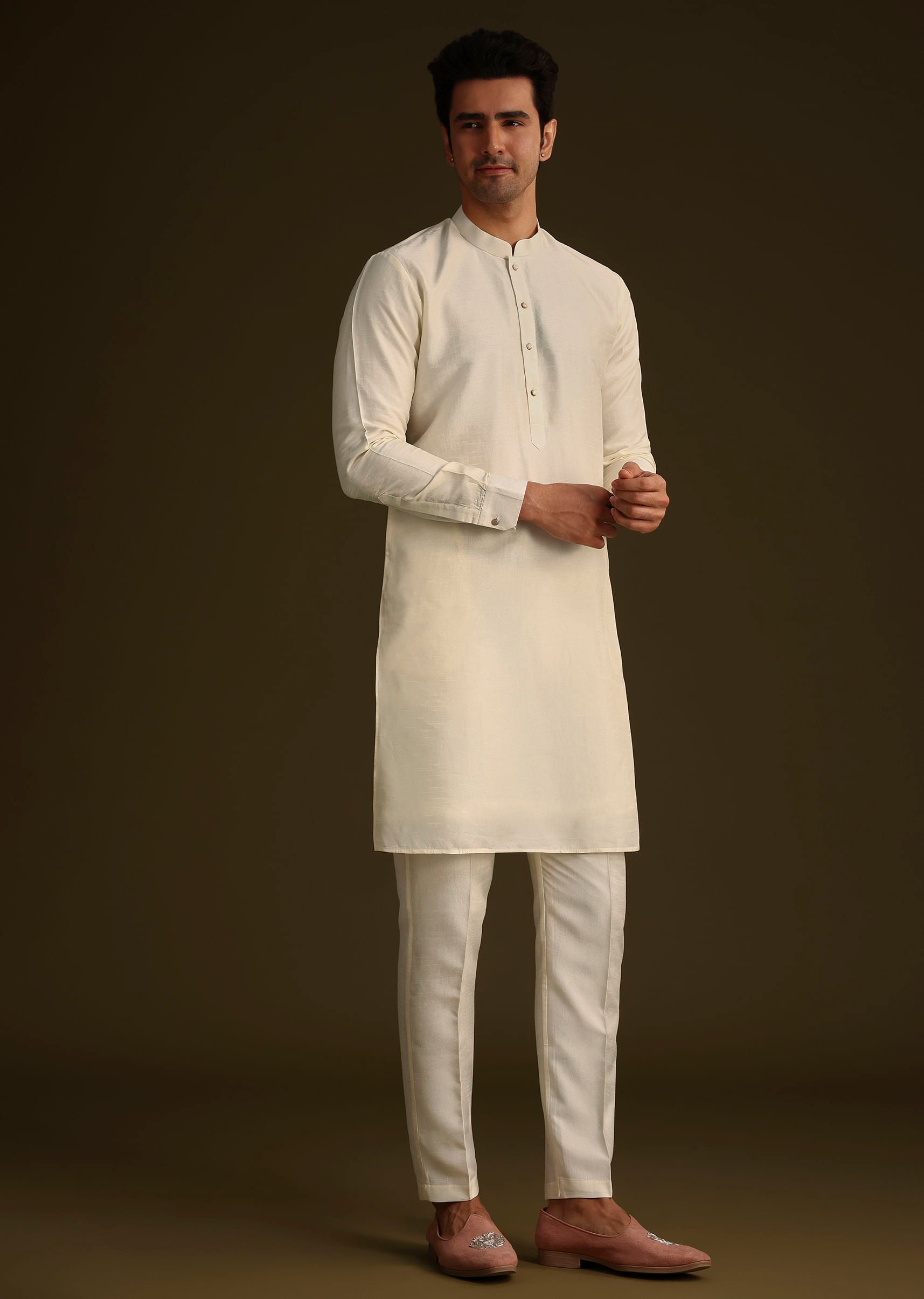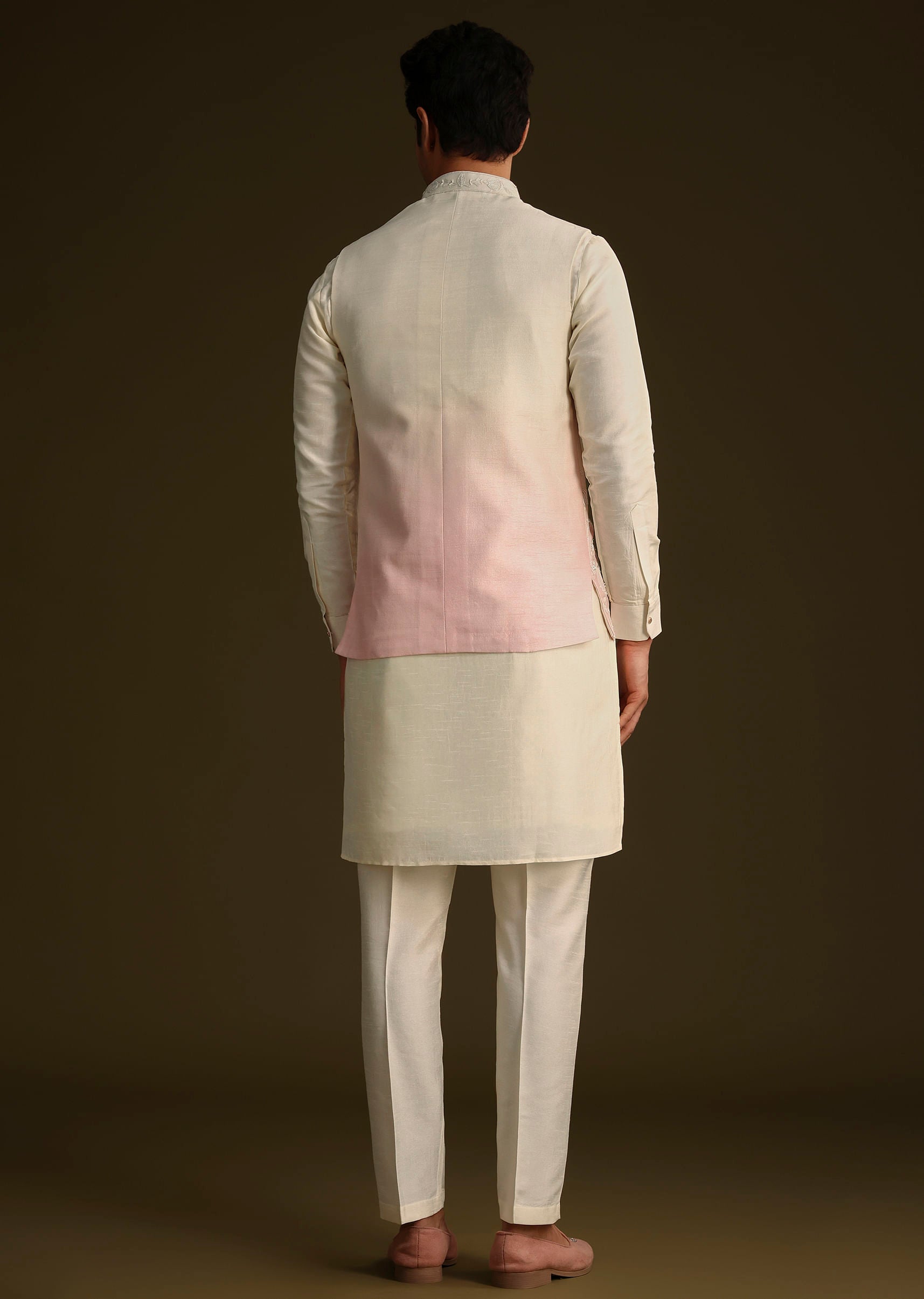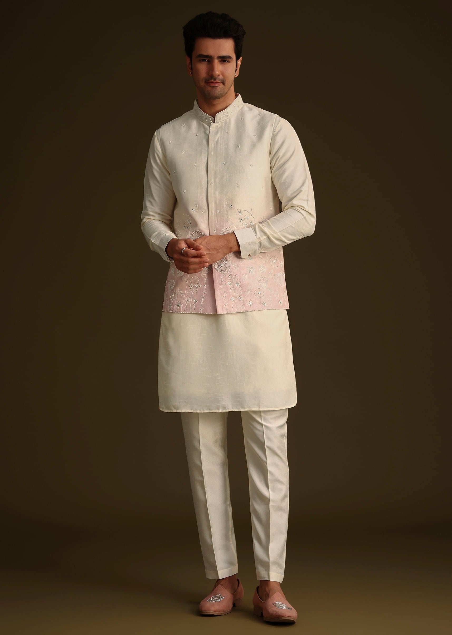 Embrace soft elegance with this cream and pink silk jacket set, adorned with delicate embellishments for a timeless appeal. Paired with a classic kurta and tailored bottom, this ensemble exudes... More Product Details