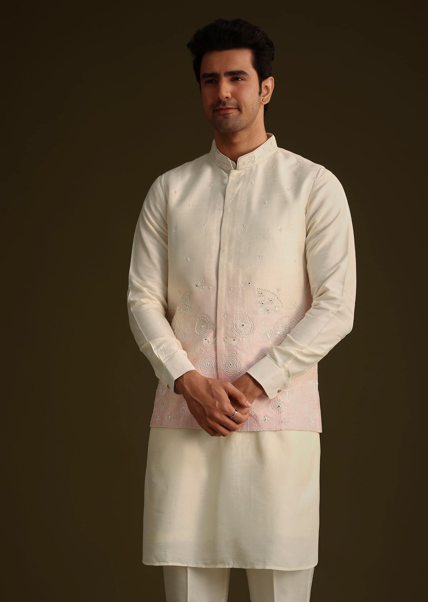 Embrace soft elegance with this cream and pink silk jacket set, adorned with delicate embellishments for a timeless appeal. Paired with a classic kurta and tailored bottom, this ensemble exudes sophistication and charm, making it ideal for engagement ceremonies, festive gatherings, and daytime weddings. The luxurious silk fabric and pastel tones create a perfect blend of tradition and contemporary style. Awarded As The Most Trusted Brand We'Re Delivering Styles You Love Just As Promised.