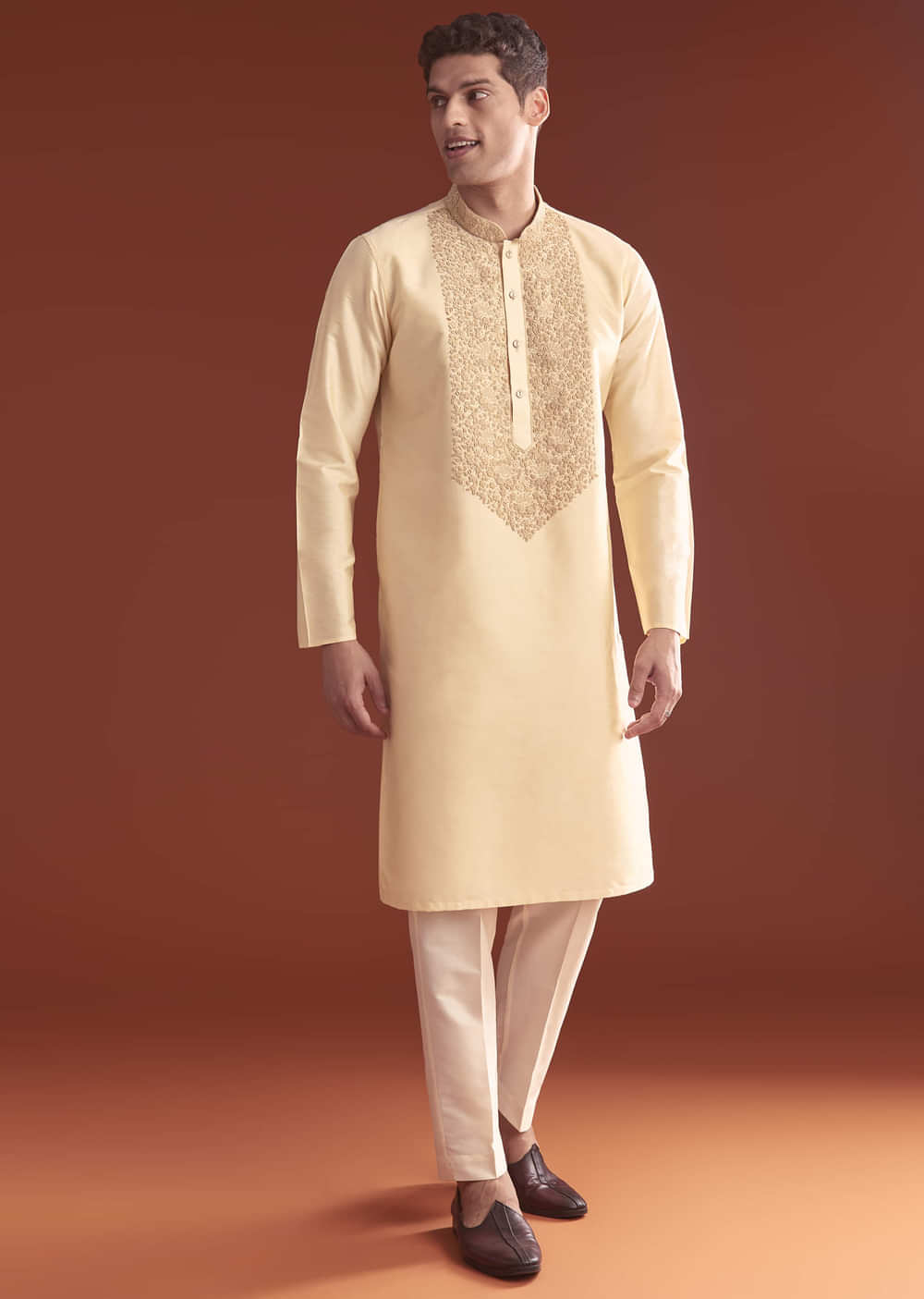 Fine craft leads the look as this cream banarasi silk men’s kurta set showcases Kashmiri work that raises subtle texture across the front. The cream base keeps everything refined for day or evening. You feel poised and photo ready for festive gatherings. Awarded as the Most Trusted Brand, we're delivering styles you love, just as promised.