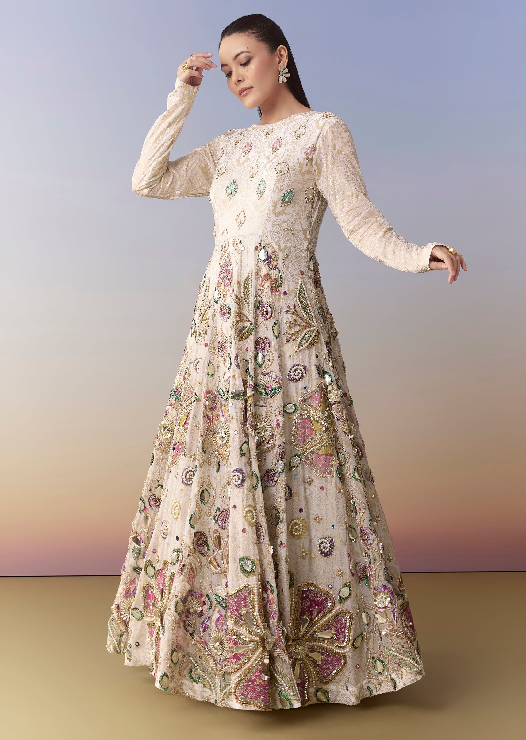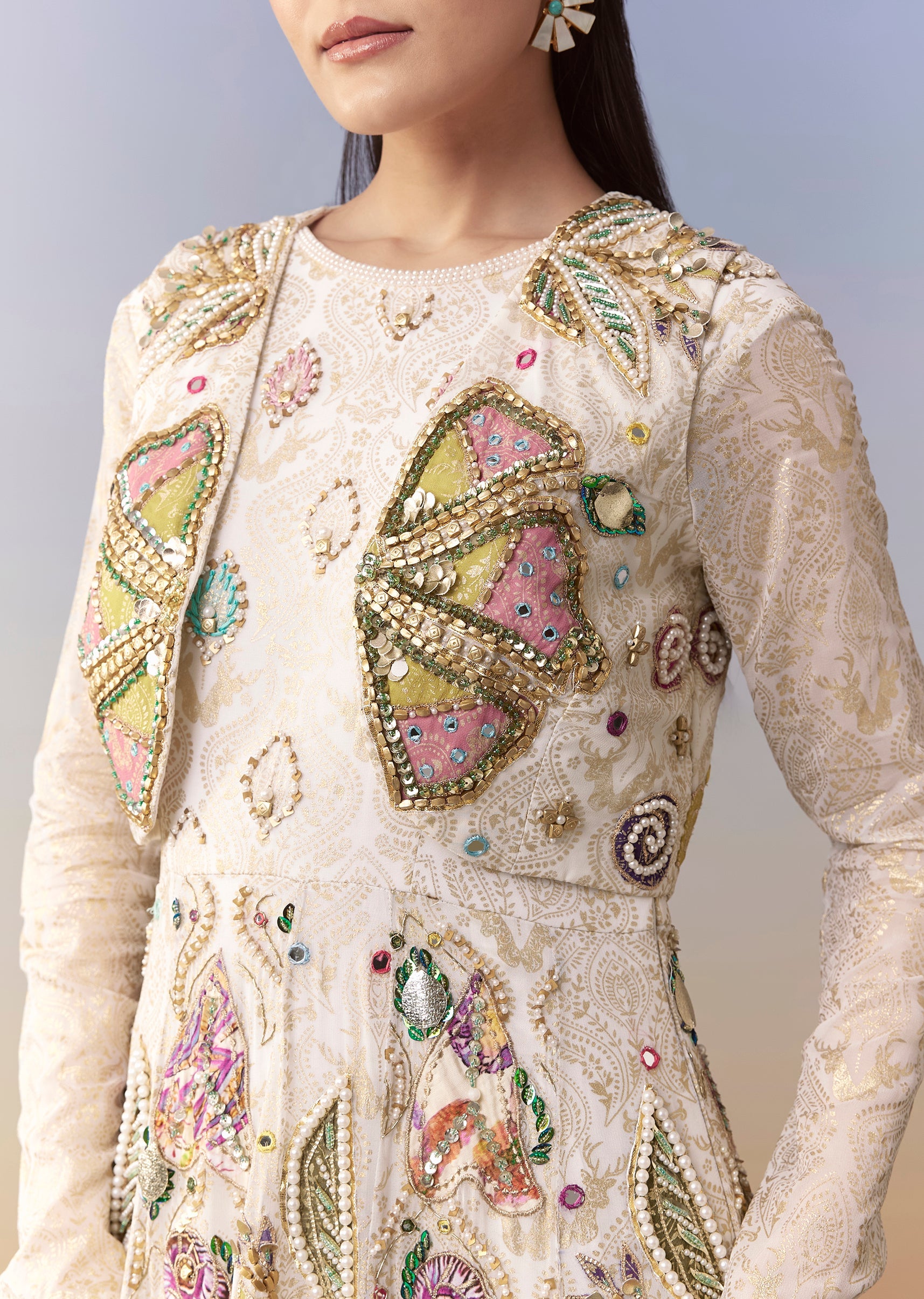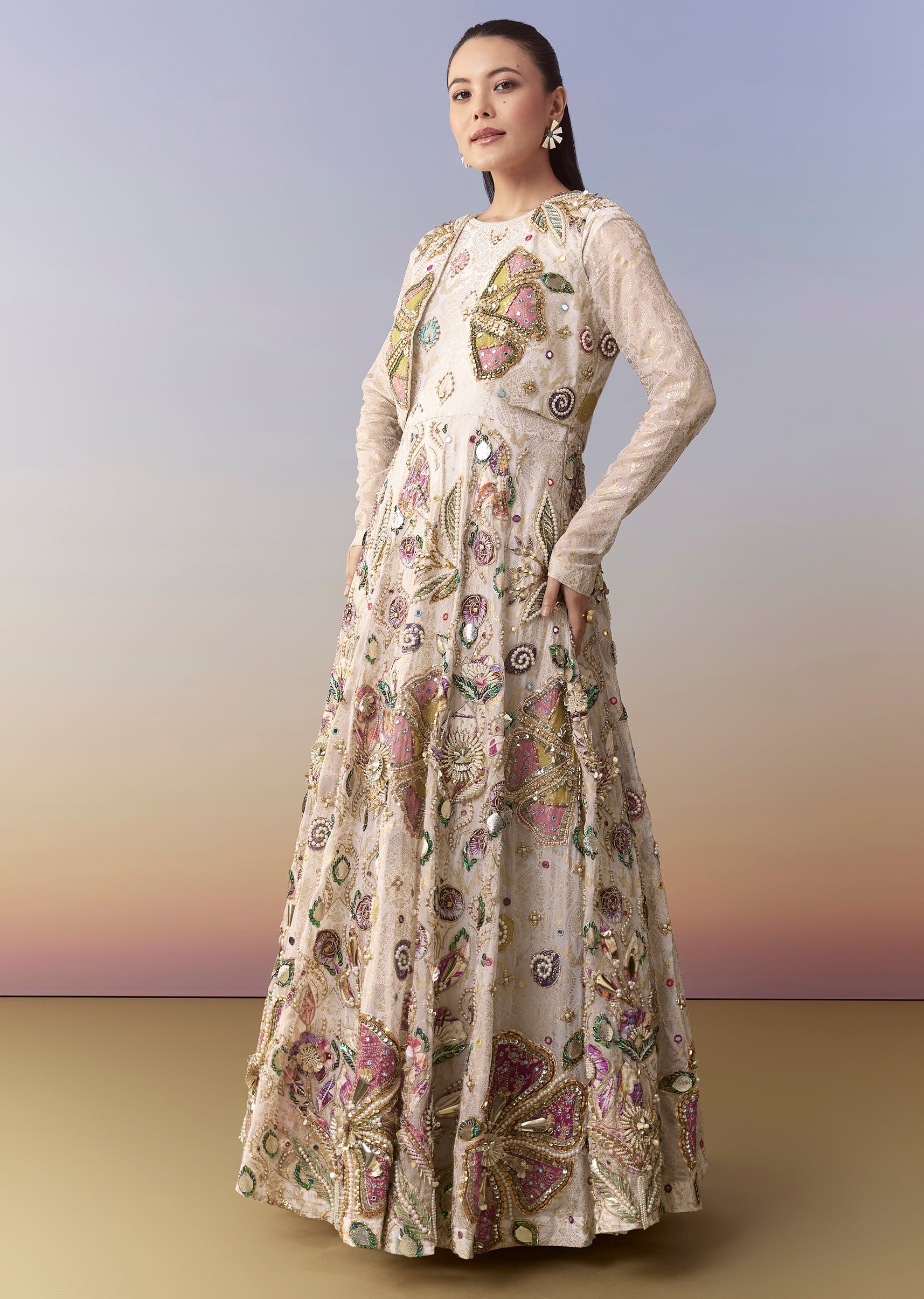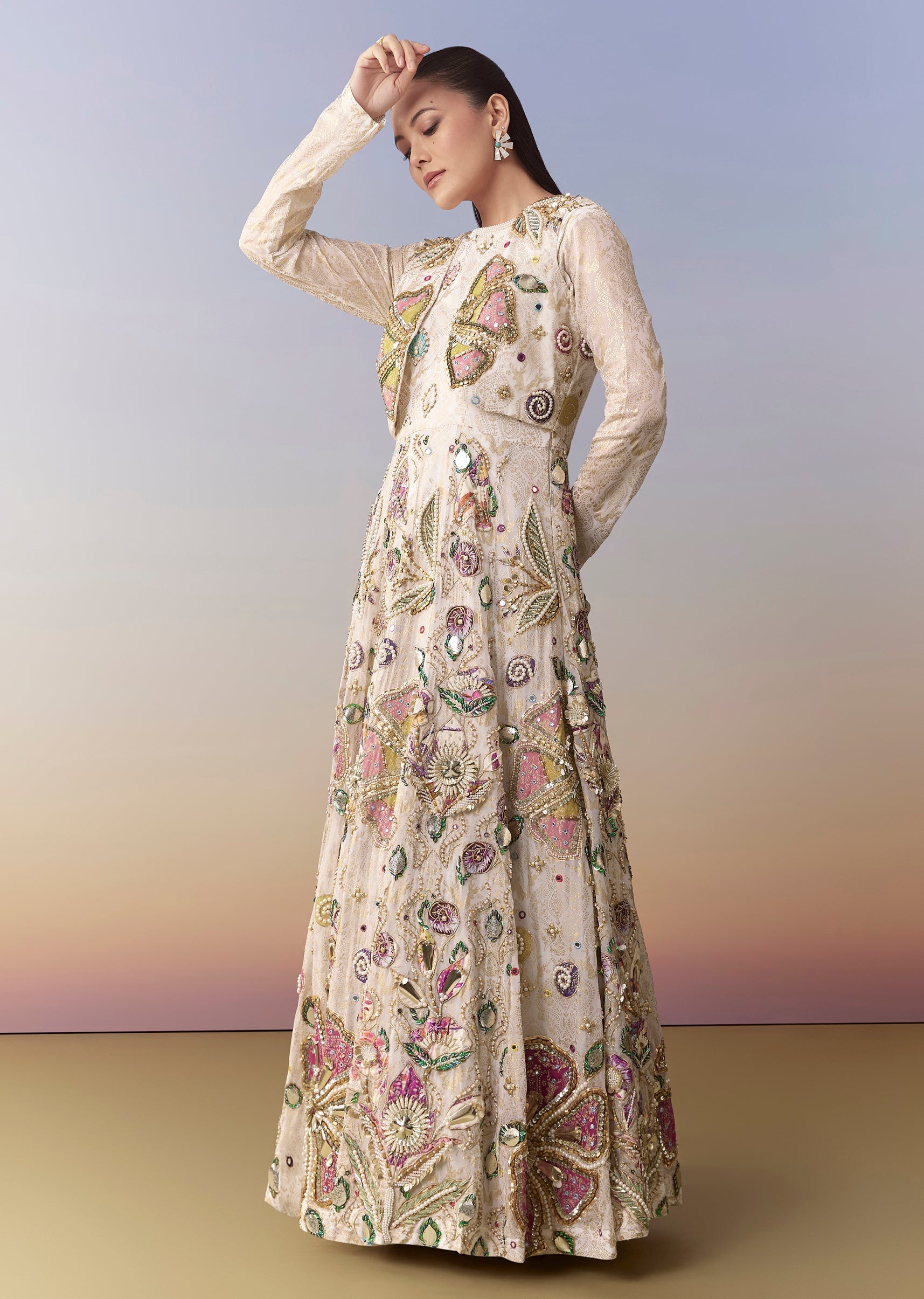 Embrace refined elegance with this cream gown set, paired with a beautifully crafted jacket featuring intricate patchwork enhanced with beads and gota detailing. The flowing gown offers a graceful, contemporary silhouette, while the embellished jacket adds festive richness and texture. Perfect for weddings, receptions, or special celebrations, this ensemble blends classic craftsmanship with modern sophistication. Awarded as the Most Trusted Brand, we're delivering styles you love, just as promised.