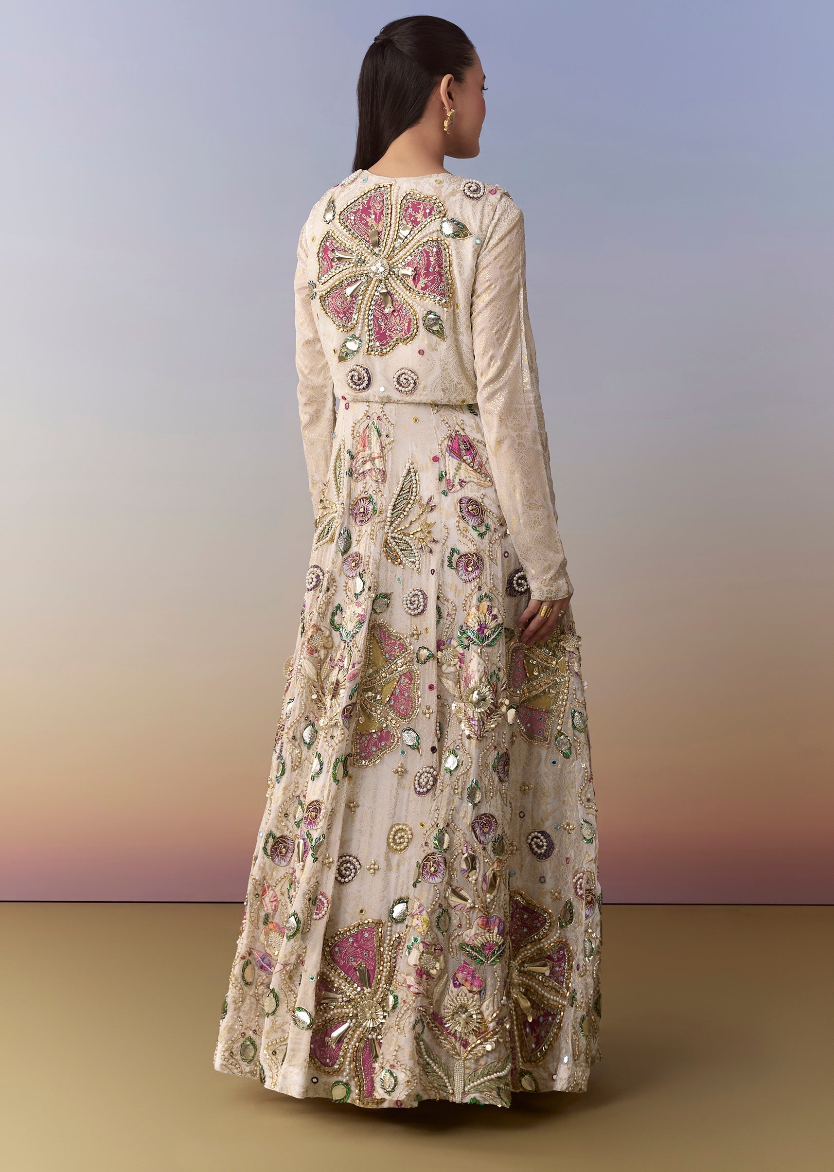 Embrace refined elegance with this cream gown set, paired with a beautifully crafted jacket featuring intricate patchwork enhanced with beads and gota detailing. The flowing gown offers a graceful, contemporary... More Product Details