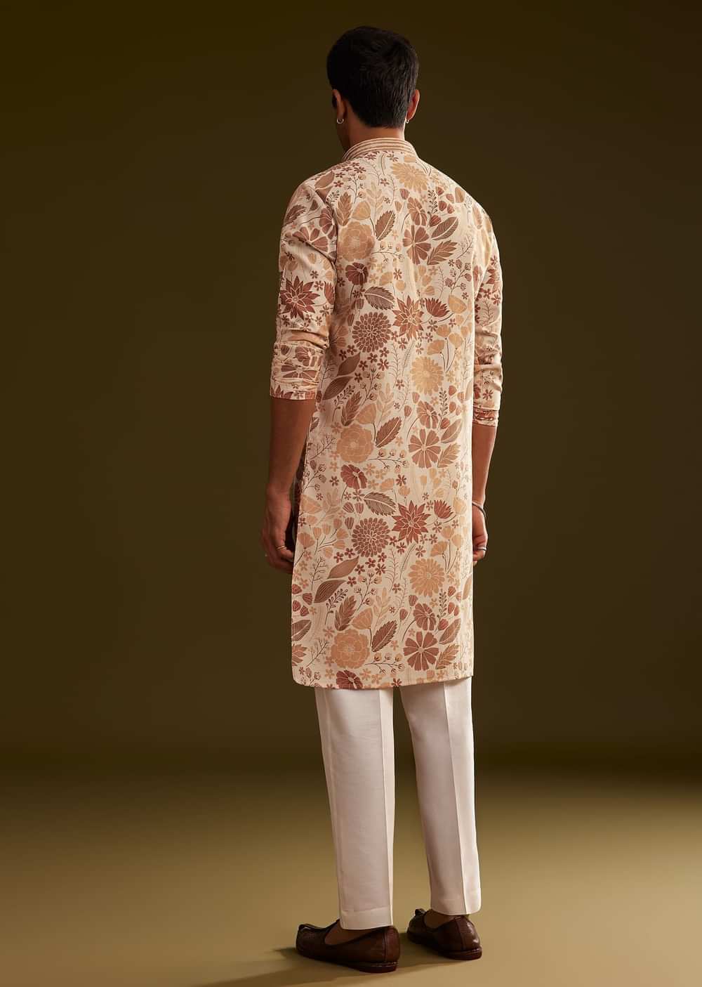 Embrace timeless elegance with this Cream Brown Silk Floral Printed Kurta Set. Crafted from luxurious silk, it features a sophisticated floral print that exudes subtle charm and grace. The harmonious blend of cream and brown hues beautifully enhances the intricate floral motifs, reflecting masterful craftsmanship. Perfect for daytime festivities and cultural celebrations, this kurta set seamlessly blends traditional aesthetics with modern sophistication. Awarded as the Most Trusted Brand, we're delivering styles you love, just as promised.