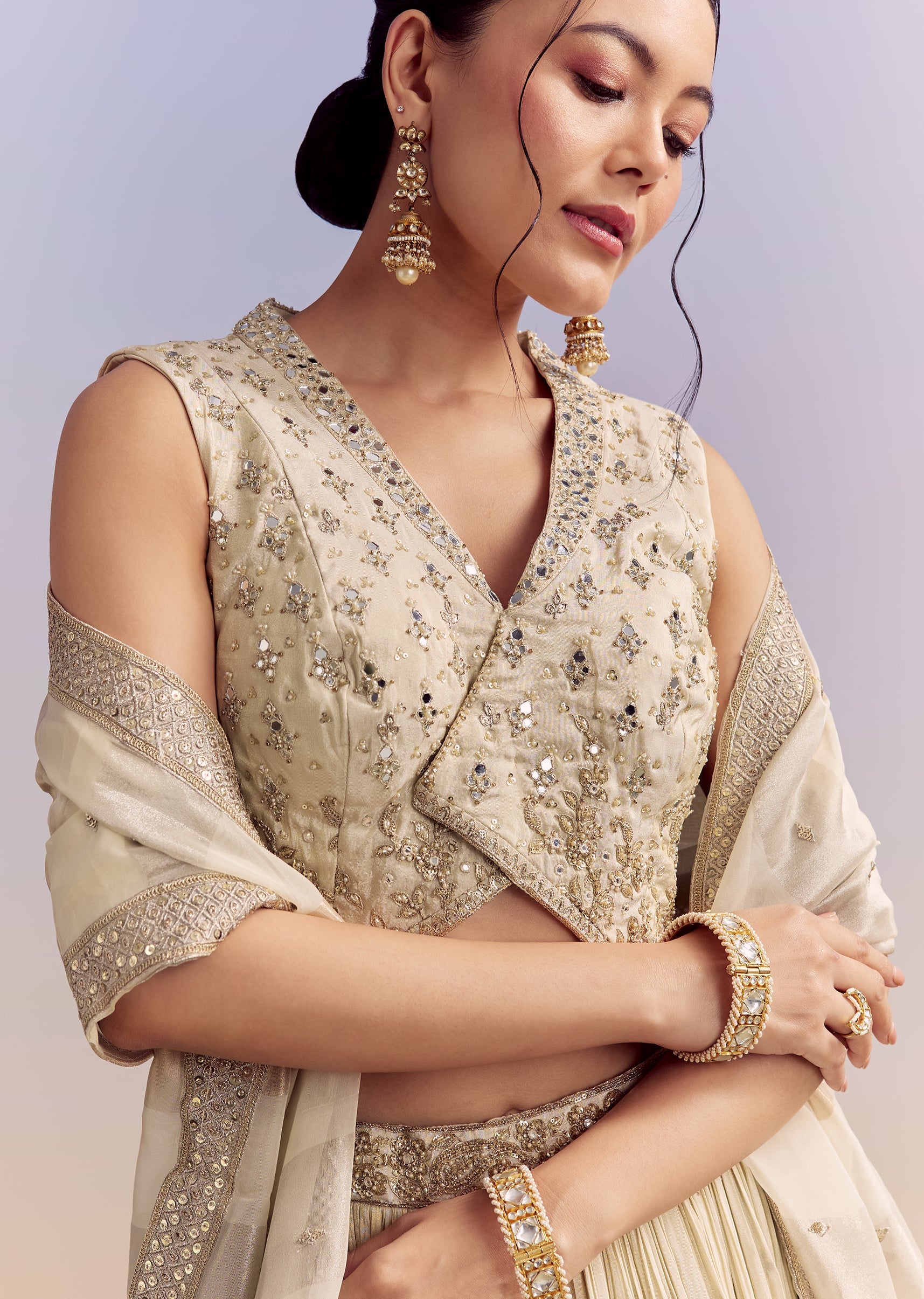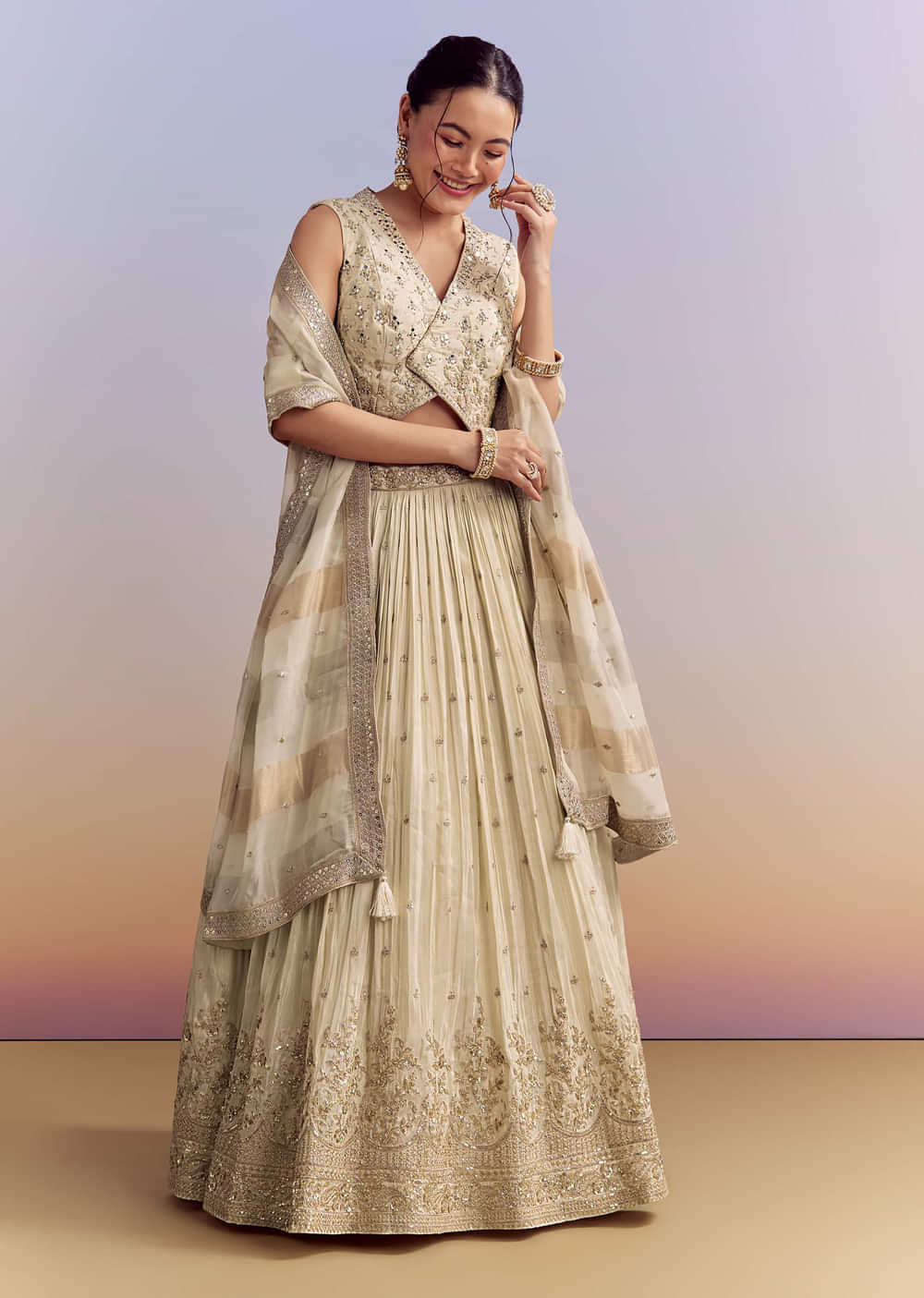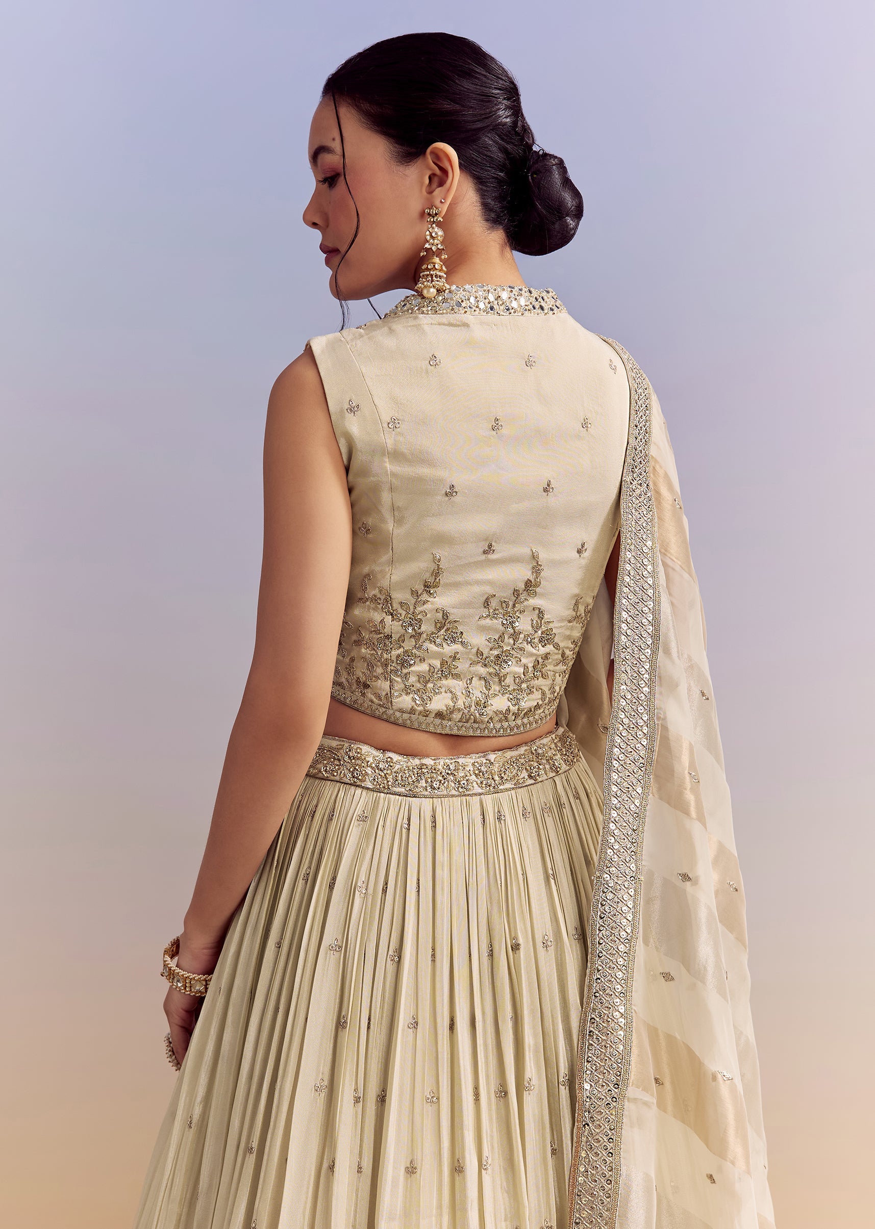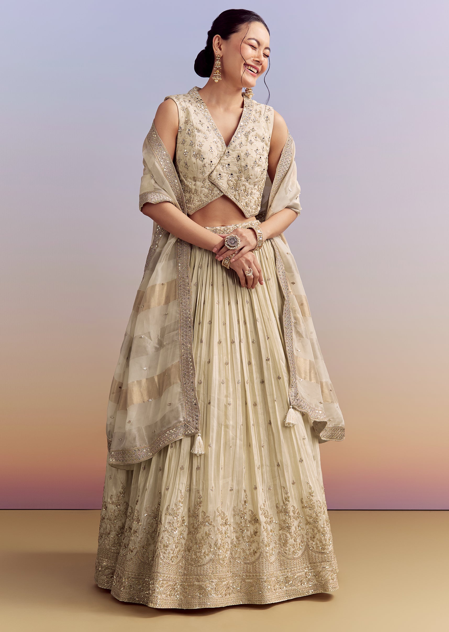 Subtle charm defines this cream chinon bridesmaid lehenga that feels refined and graceful. Mirror, sequins, and zardosi embroidery are highlighted with a tissue dupatta for a soft yet elevated appeal.... More Product Details