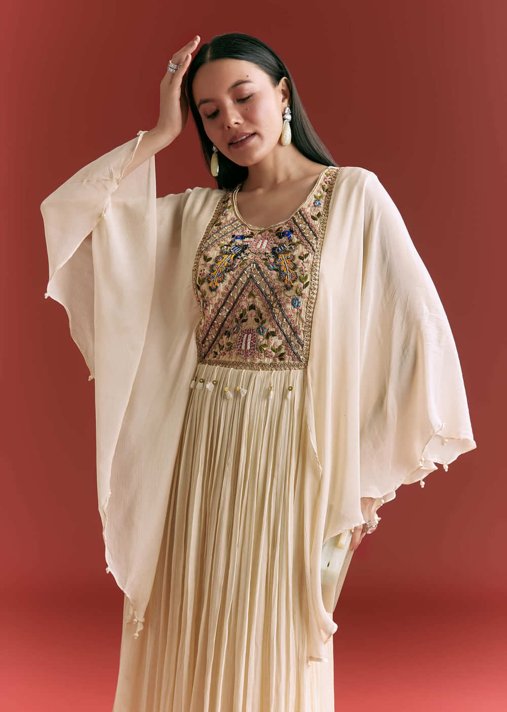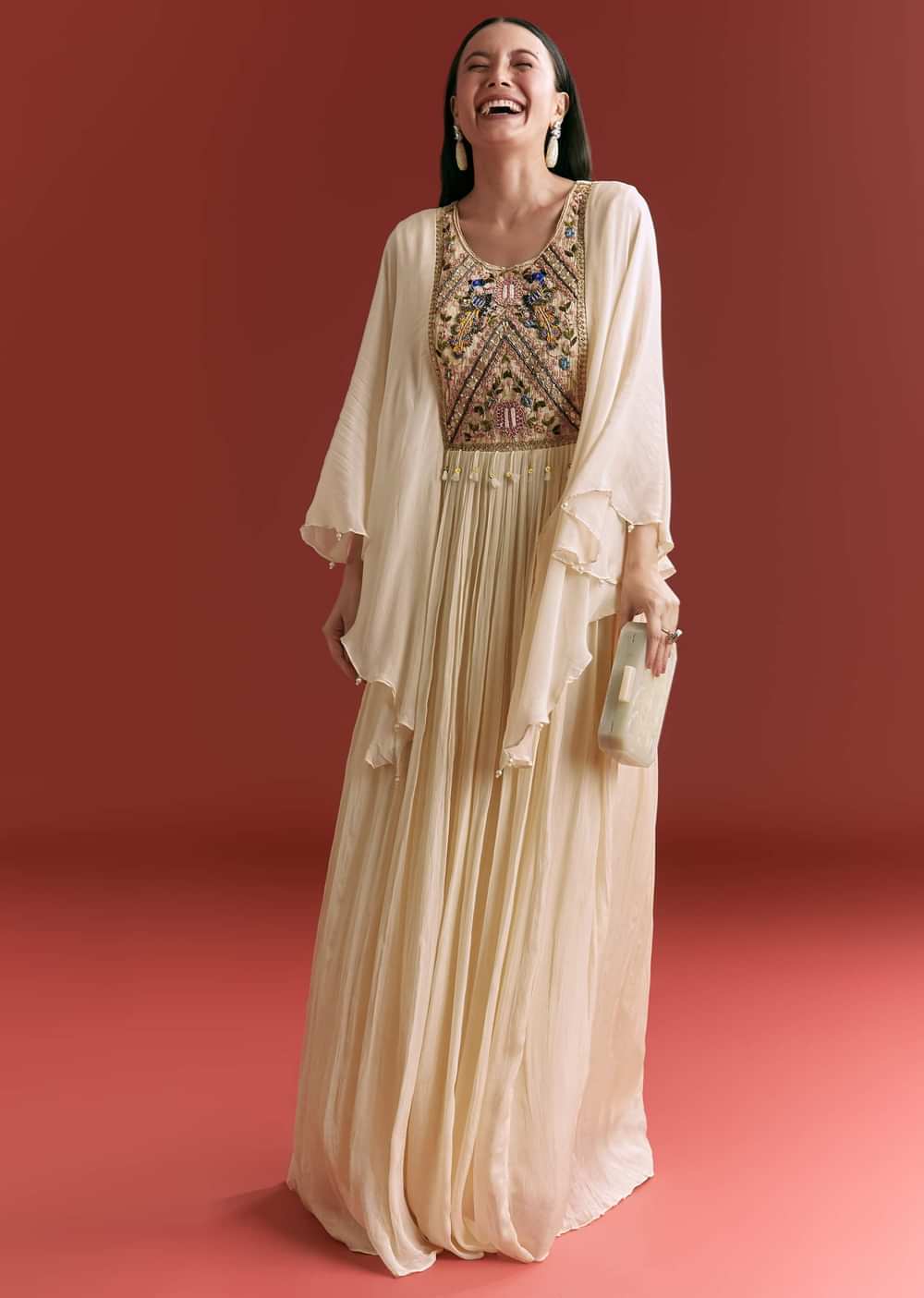 Cream Chinon Embroidered Gown With Flared Sleeves