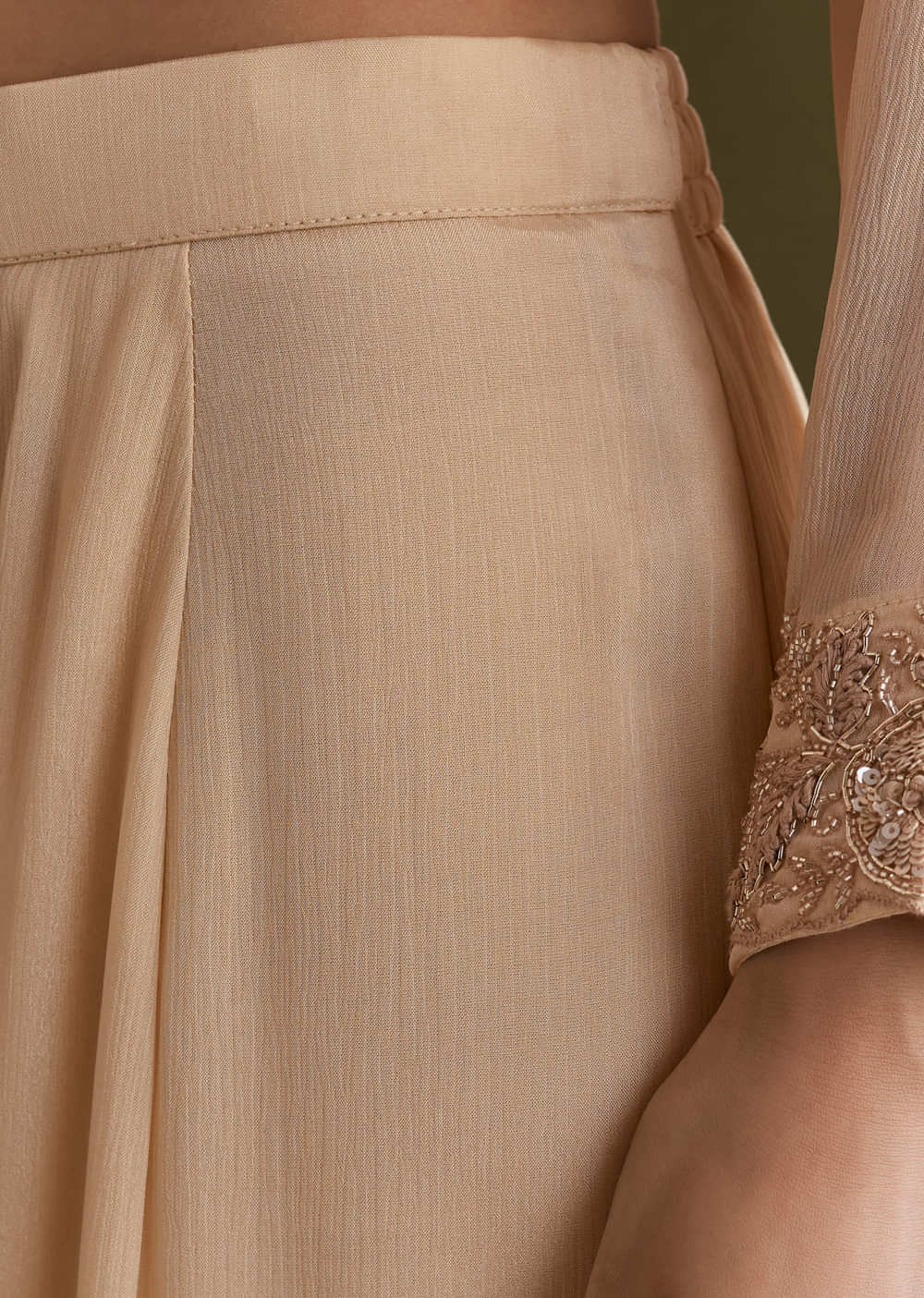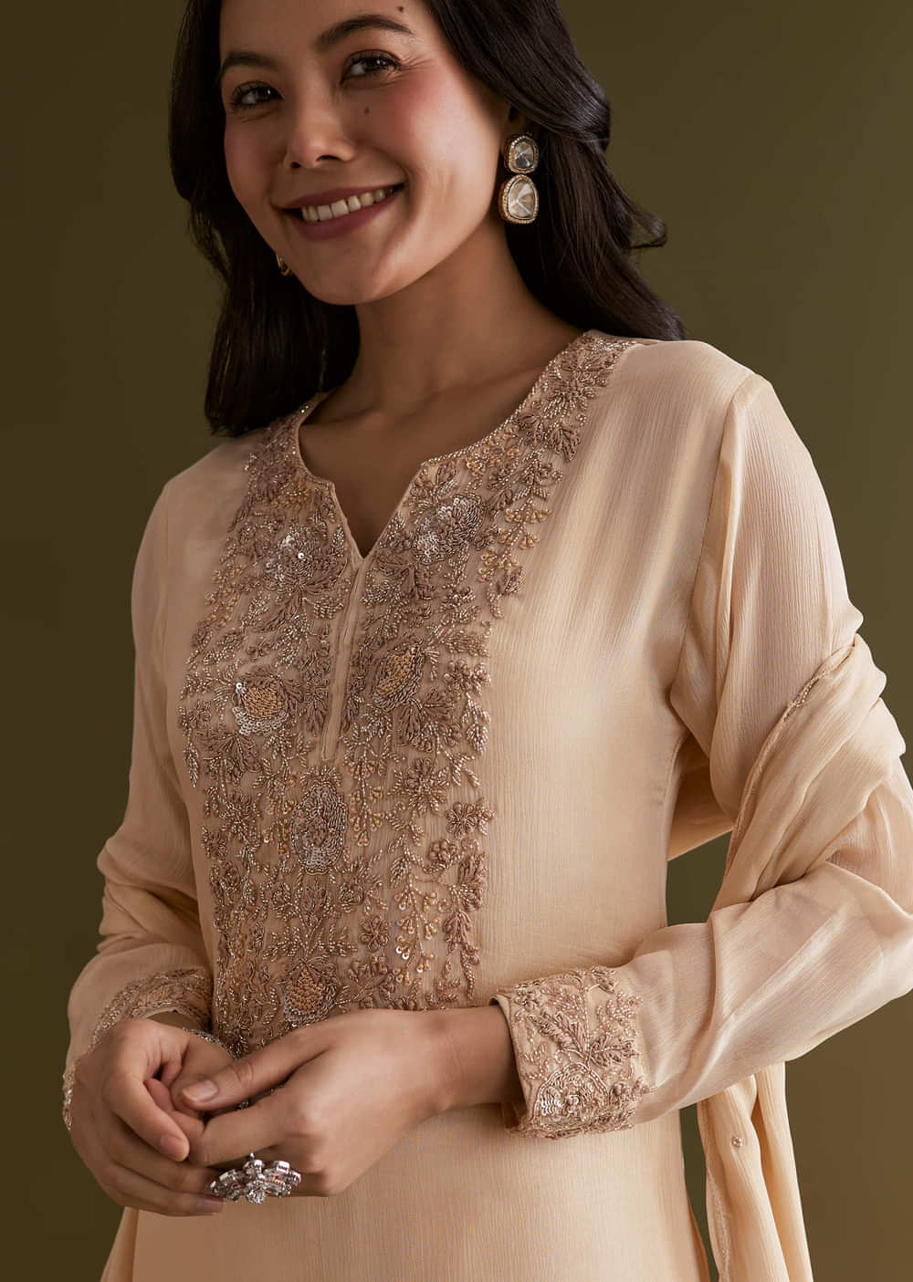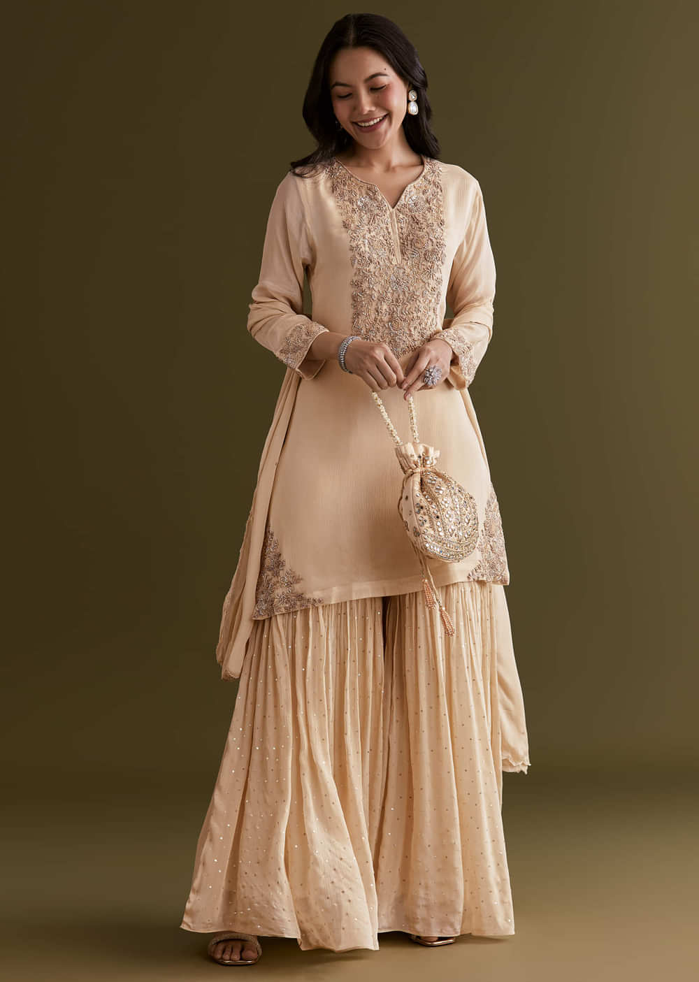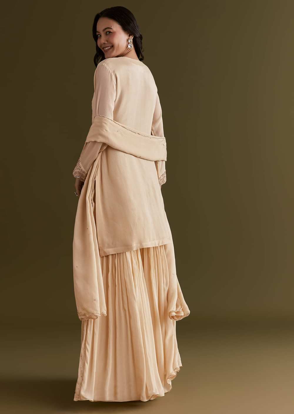 Cream Chinon Kurta Sharara Suit With Embroidered Dupatta