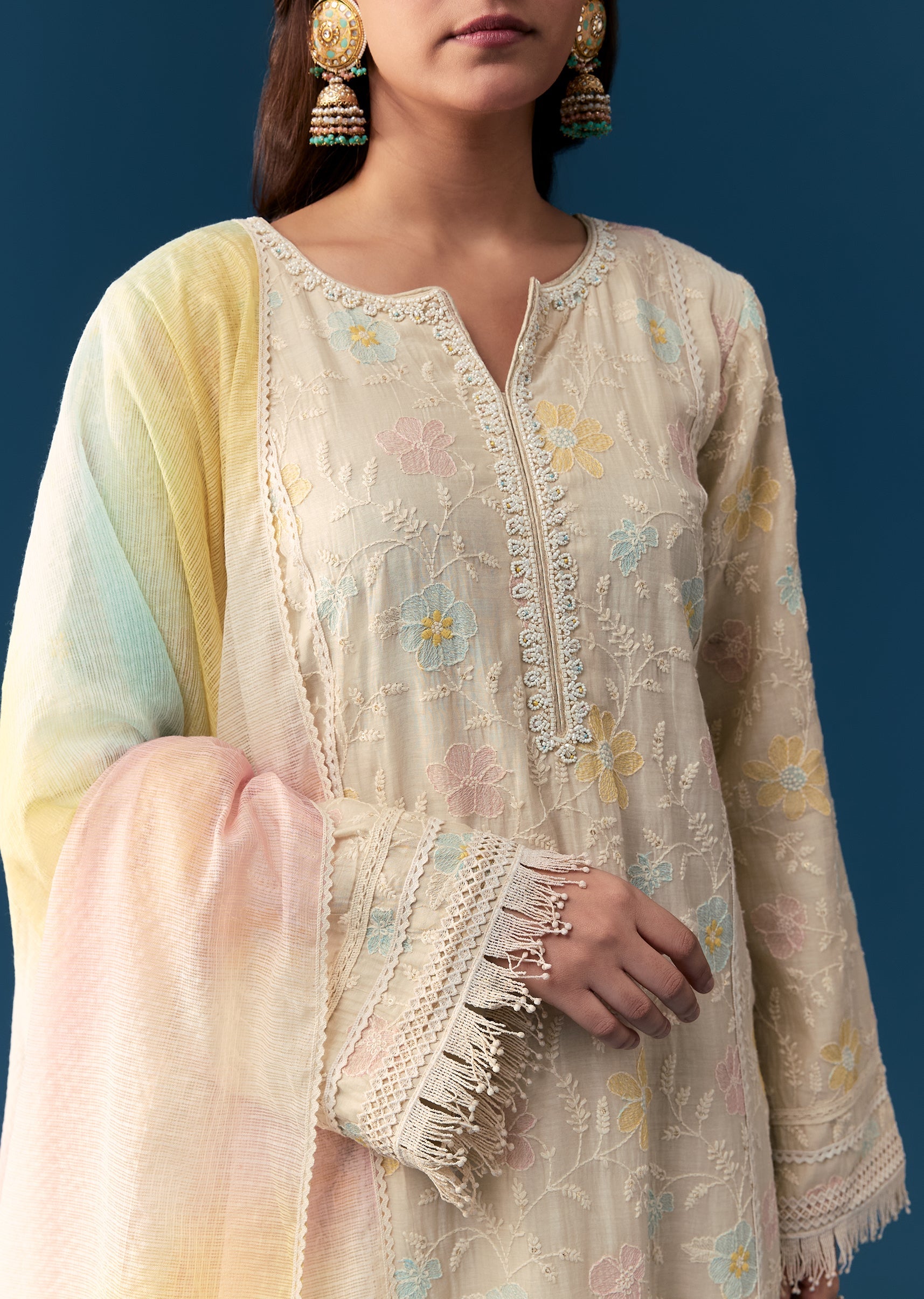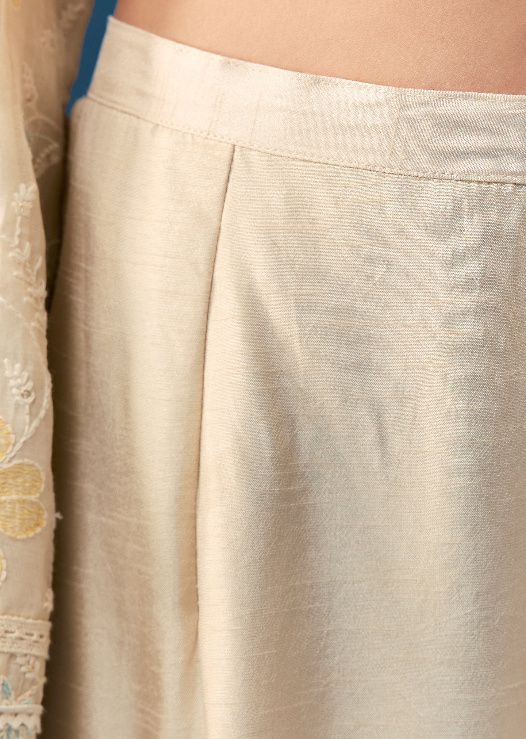 Exude effortless charm with this pastel cream kurta set crafted in classic Pakistani style. Made from soft cotton fabric, the kurta features delicate thread embroidery along the flared sleeves and... More Product Details