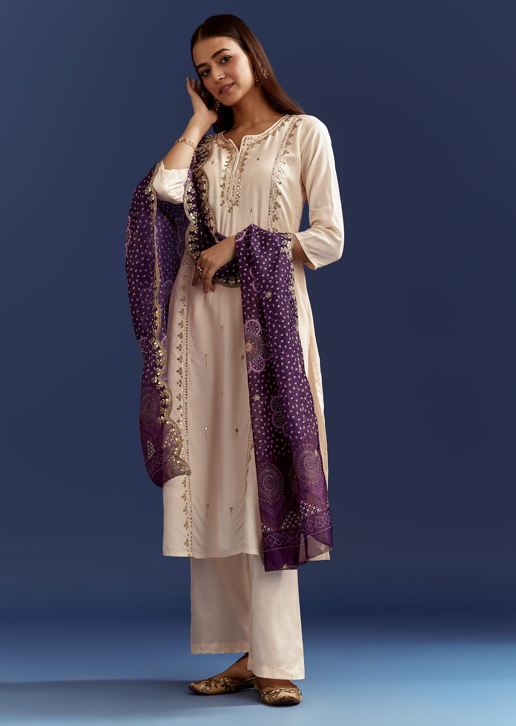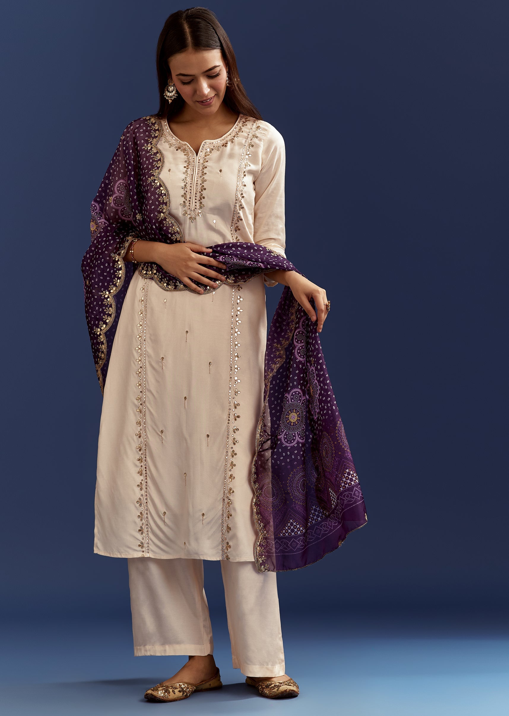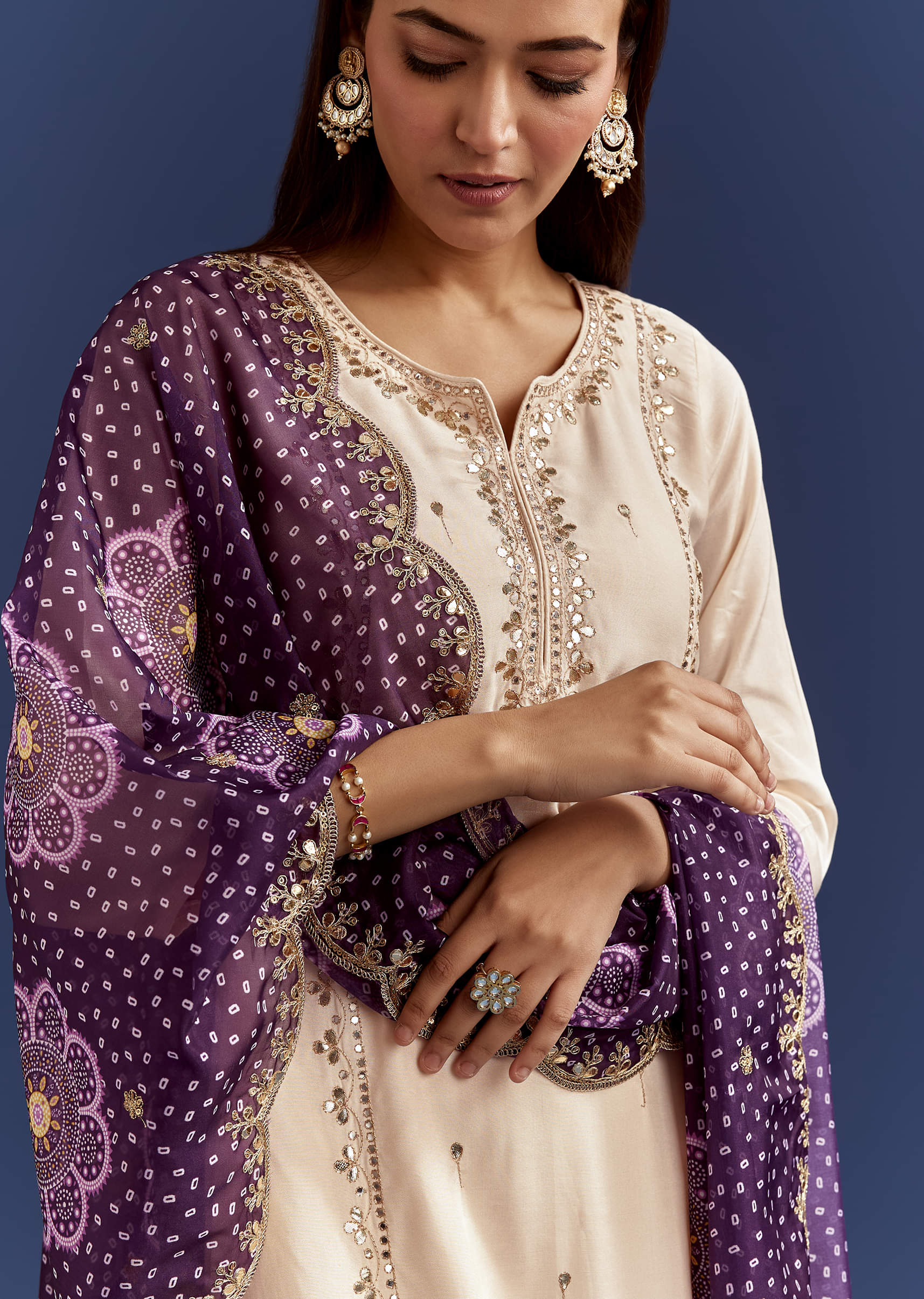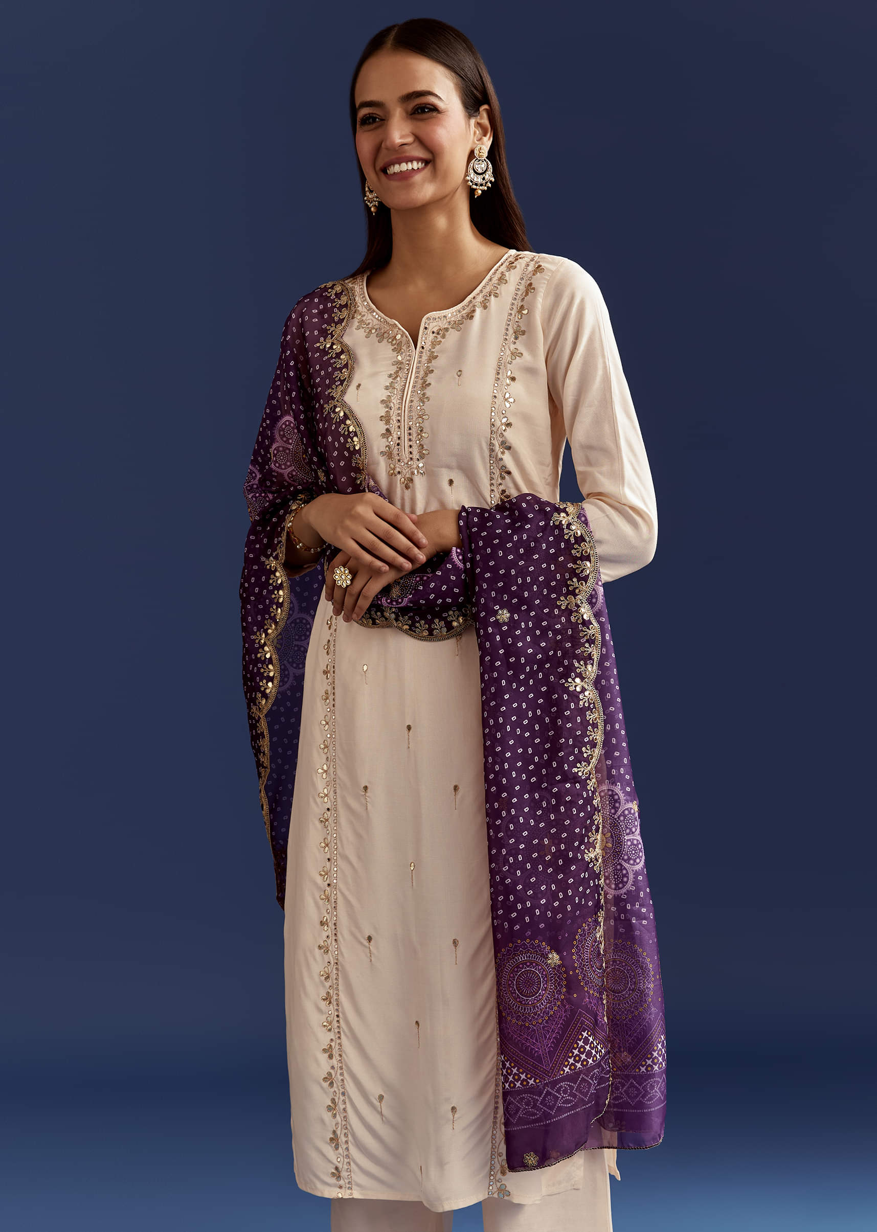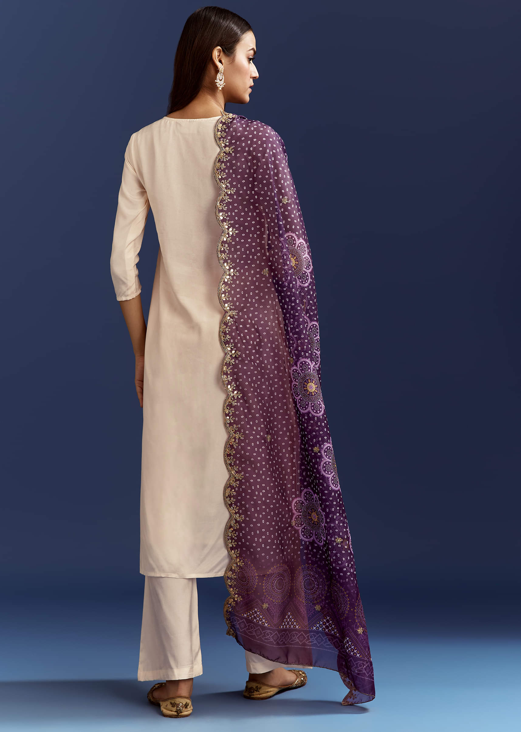 Cream Dola Silk Kurta With Gotta Work And Bandhani Purple Dupatta