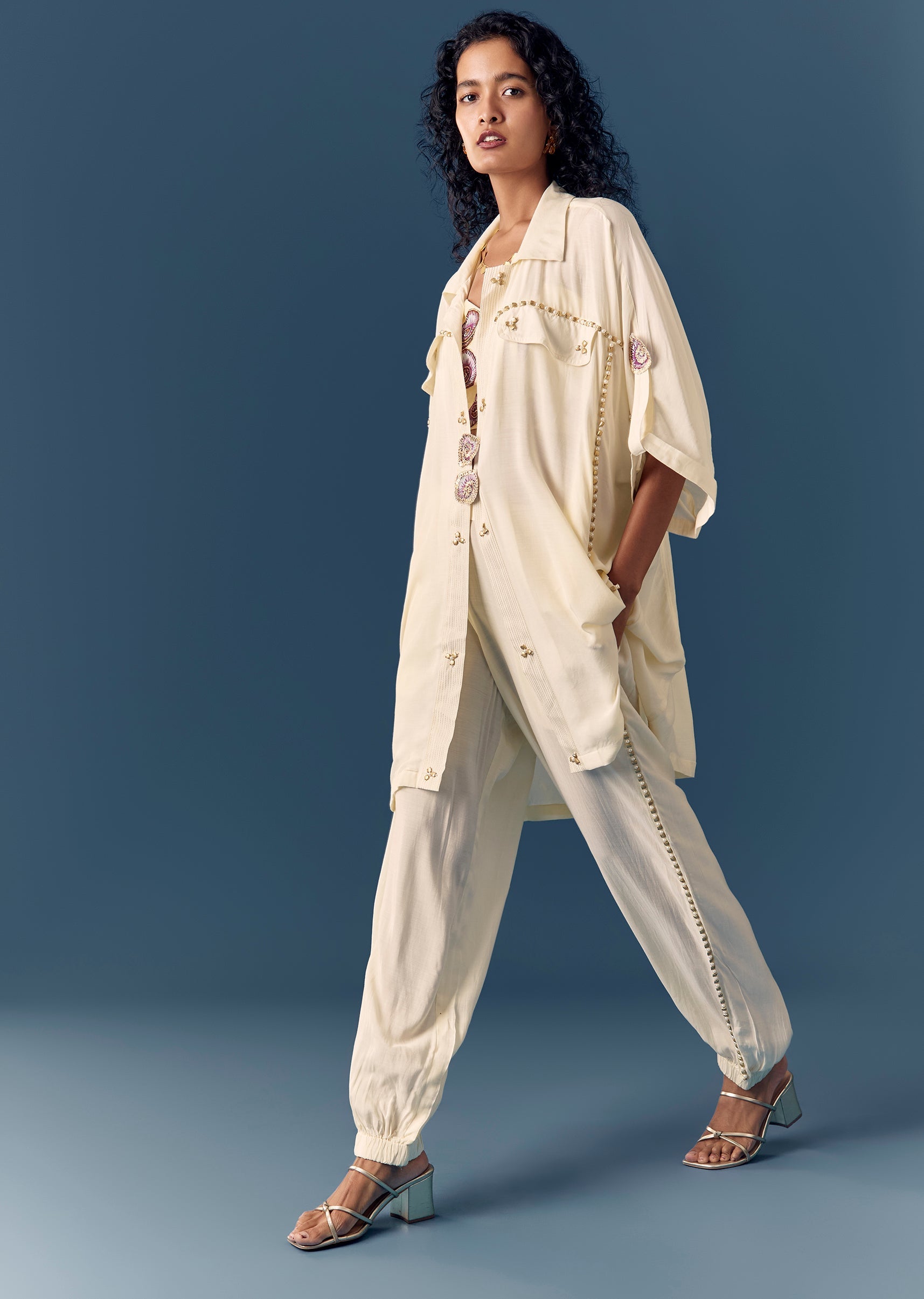 Cream Embellished Shirt Co ord Set