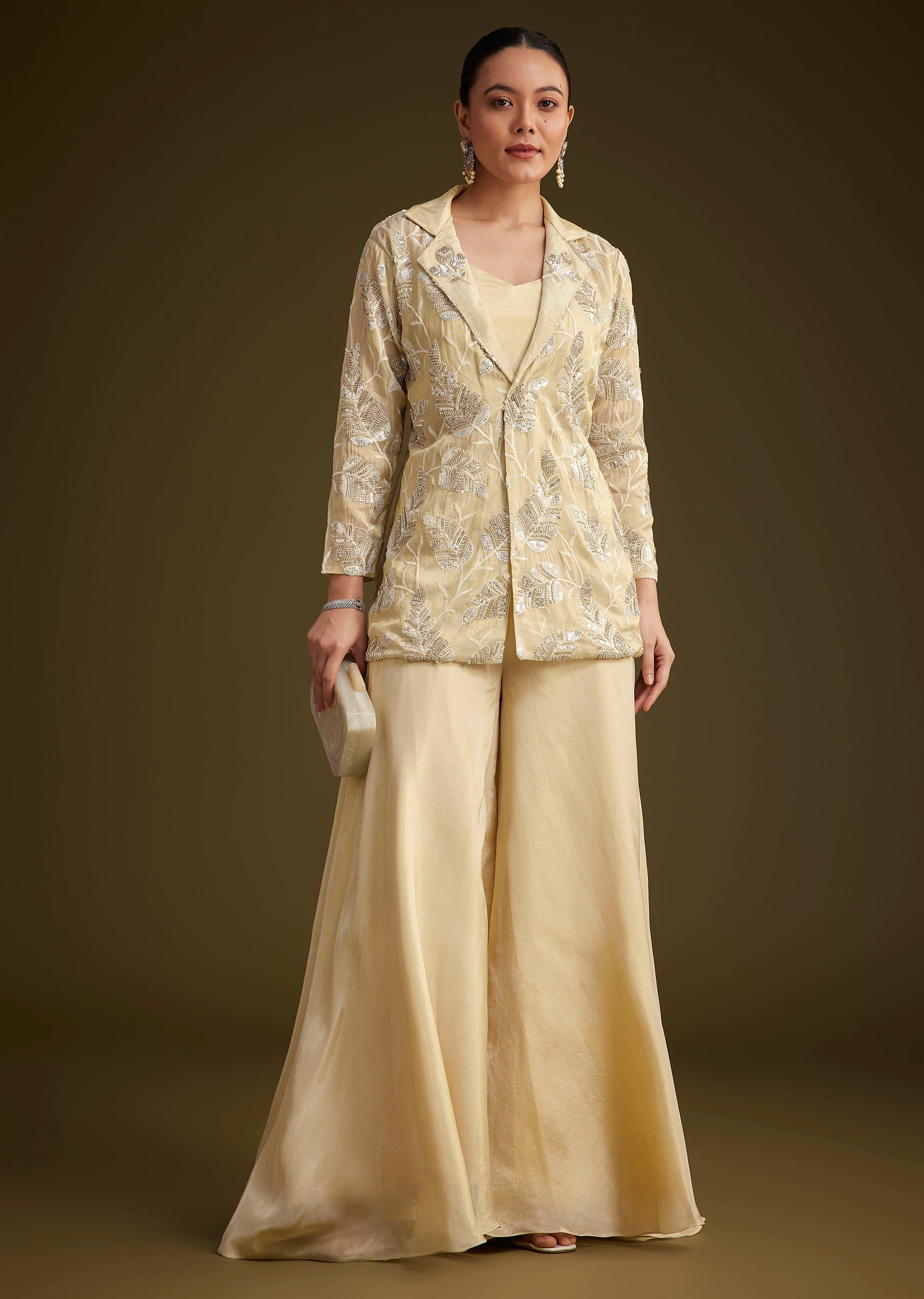 Radiate Sophistication With This Cream Tissue Croptop Palazzo And Jacket Set Intricately Adorned With Beads Sequins Cut Dana And Delicate Thread Work. The Timeless Embroidery Elevates The Ensemble Making It Perfect For Formal Celebrations Festive Gatherings Or Cocktail Evenings. The Fluid Silhouette Adds Charm And Comfort Ensuring Effortless Elegance. Awarded as the Most Trusted Brand, we're delivering styles you love, just as promised.