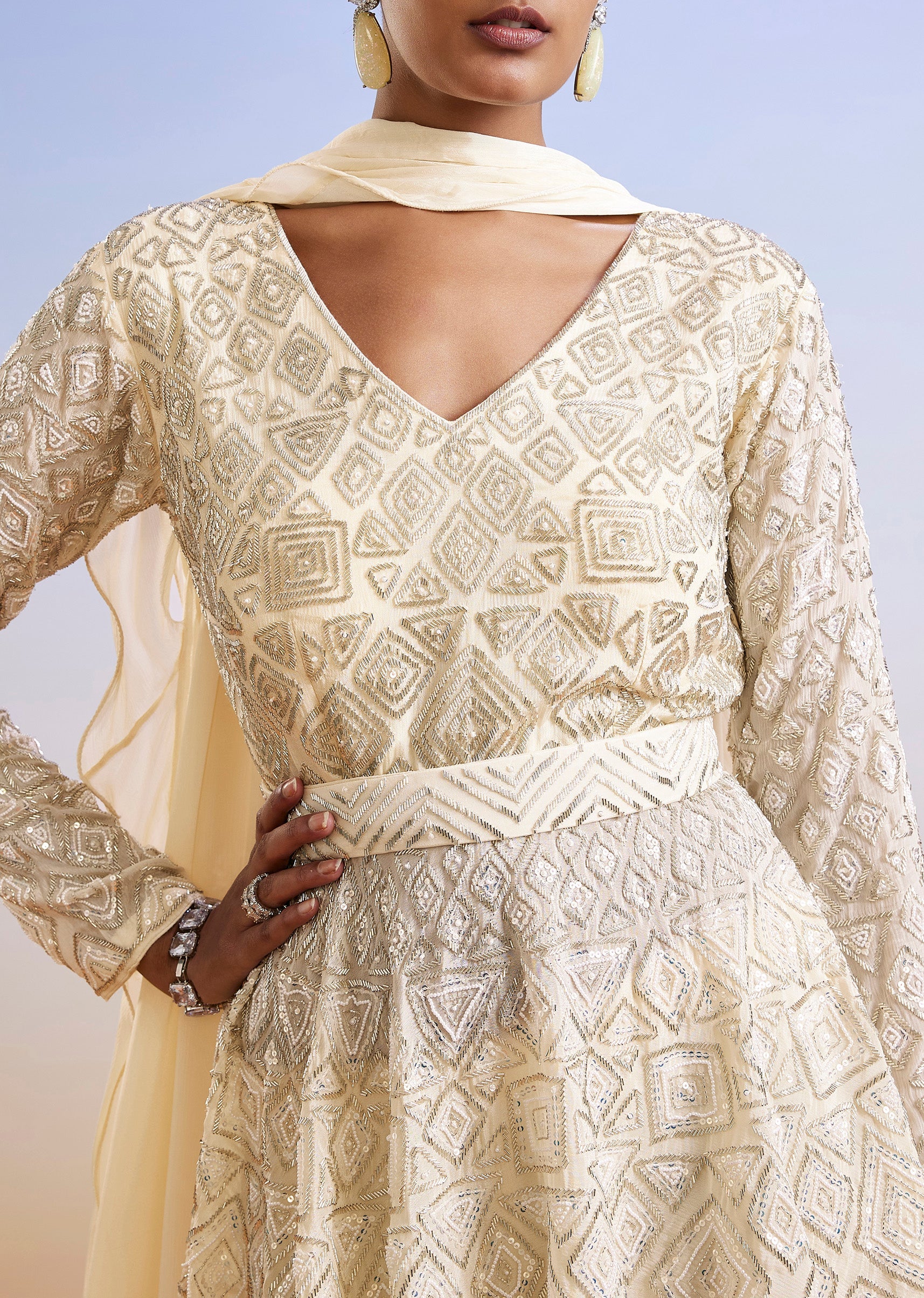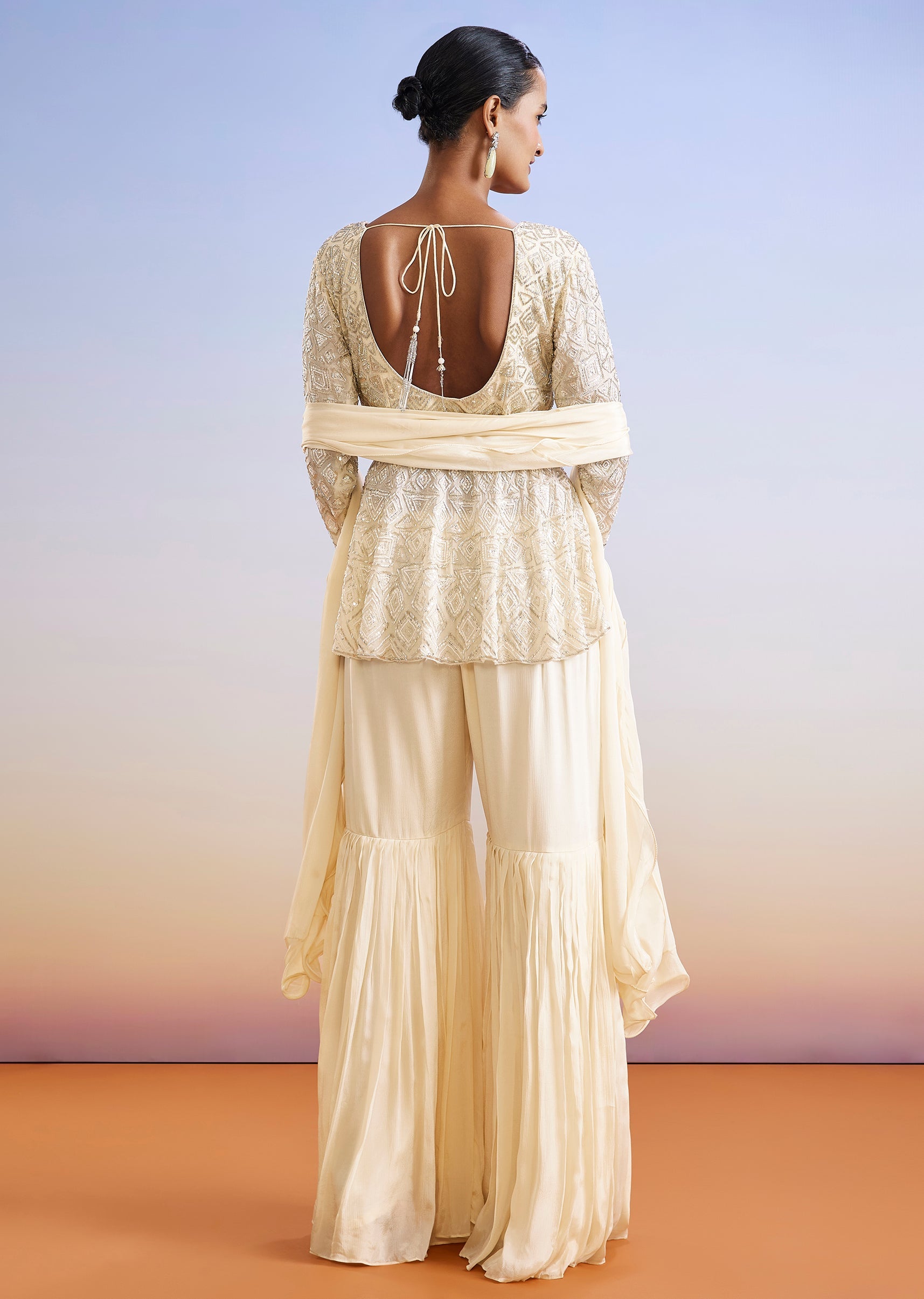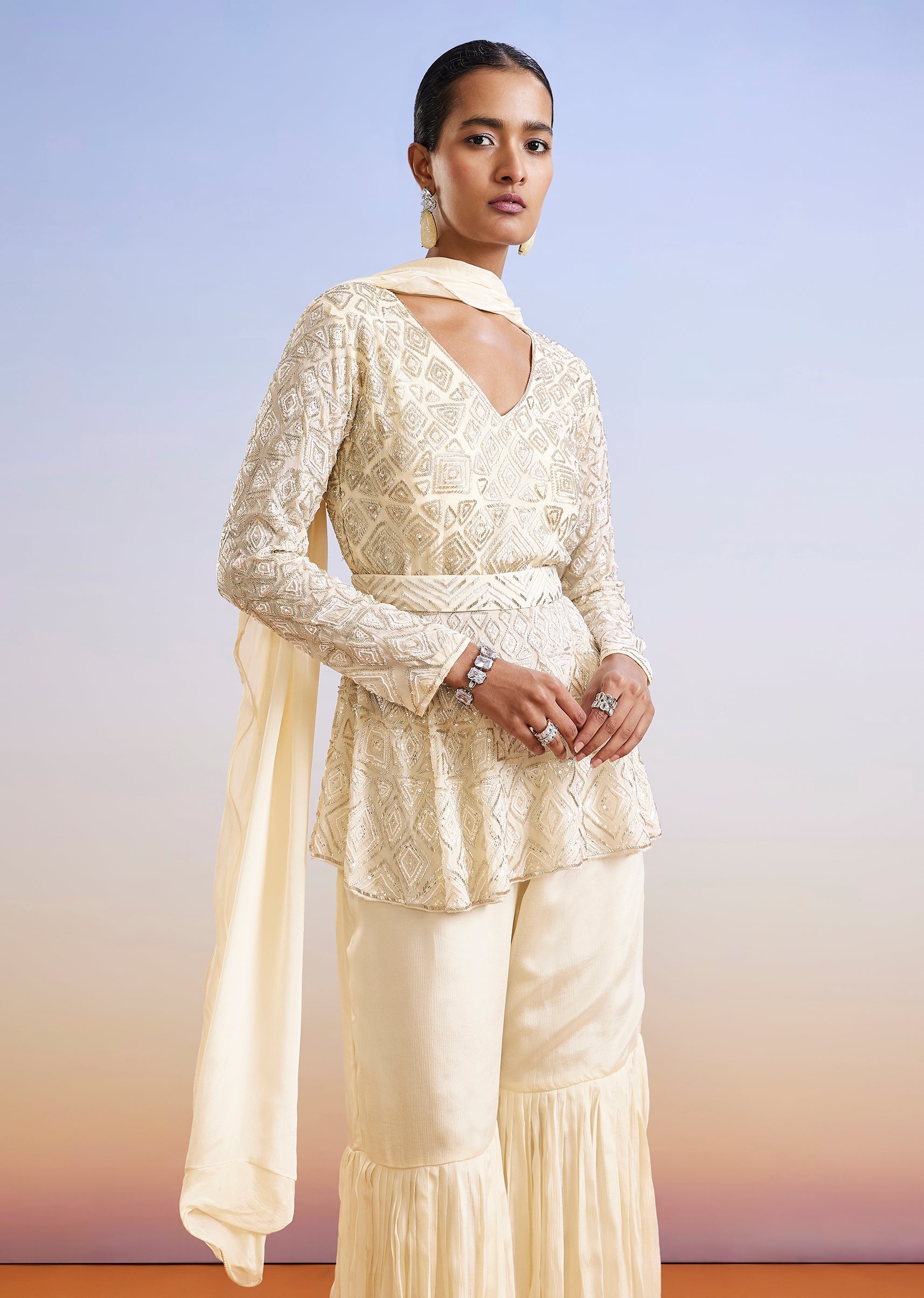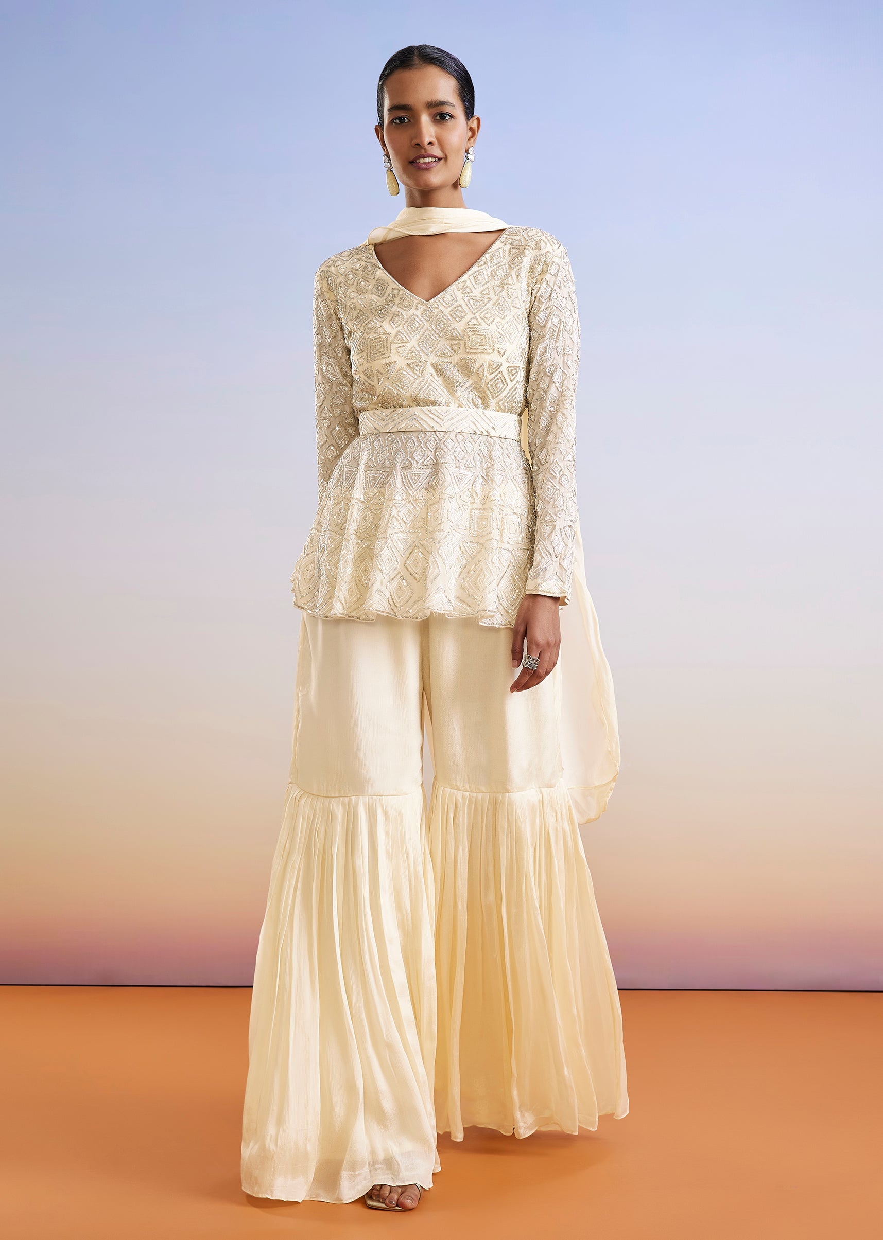 Cream Embroidered Peplum Sharara Suit With Dupatta And Belt