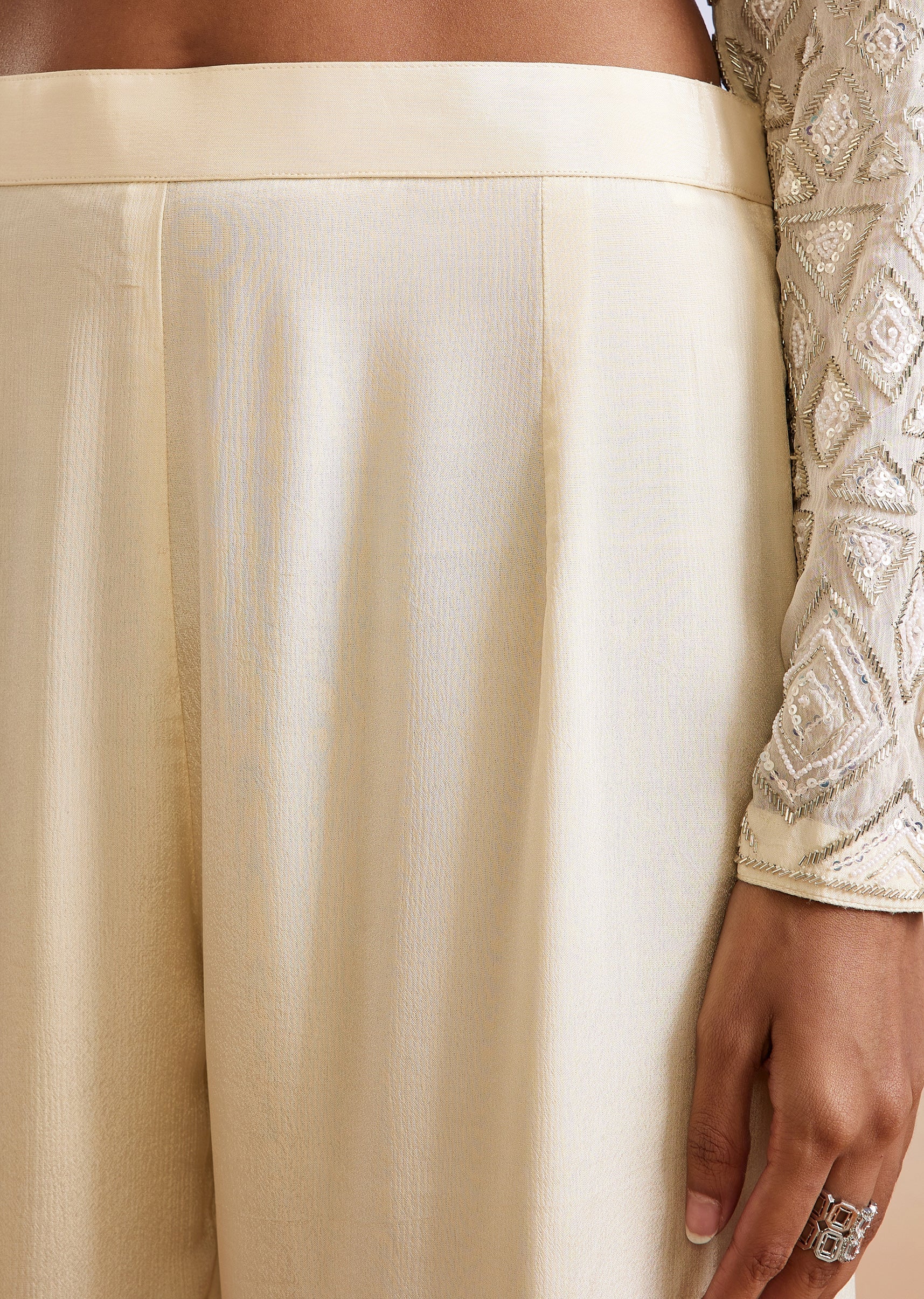 A refined cream sharara suit featuring a peplum-style kurta embellished with cut dana embroidery. Paired with a flared sharara, dupatta and a coordinating belt, this ensemble blends modern elegance with... More Product Details