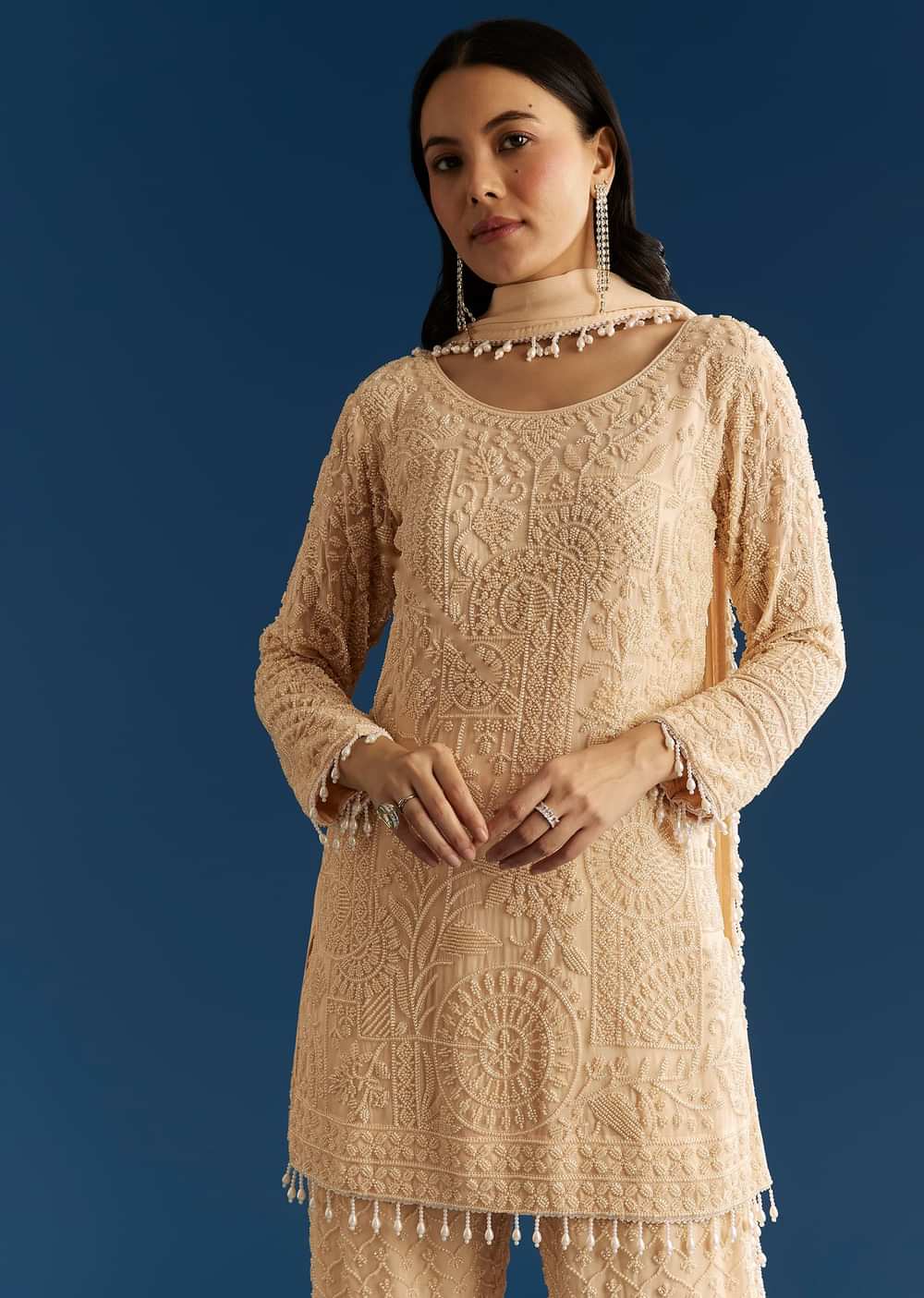 Crafted for both comfort and celebration, this cream georgette kurta and pant set is embellished with refined beads work for a minimalist festive statement—ideal for low-key yet chic mehendi looks.... More Product Details