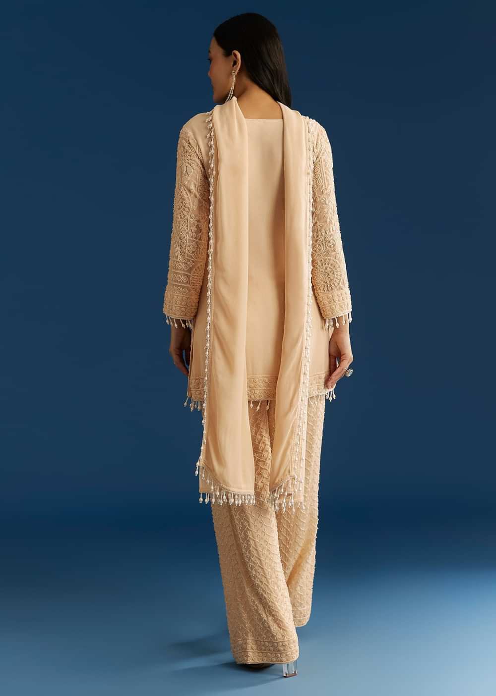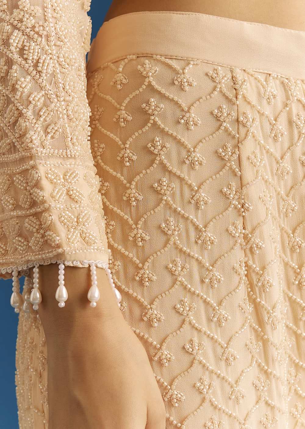 Cream Georgette Kurta Pant Set With Beaded Dupatta