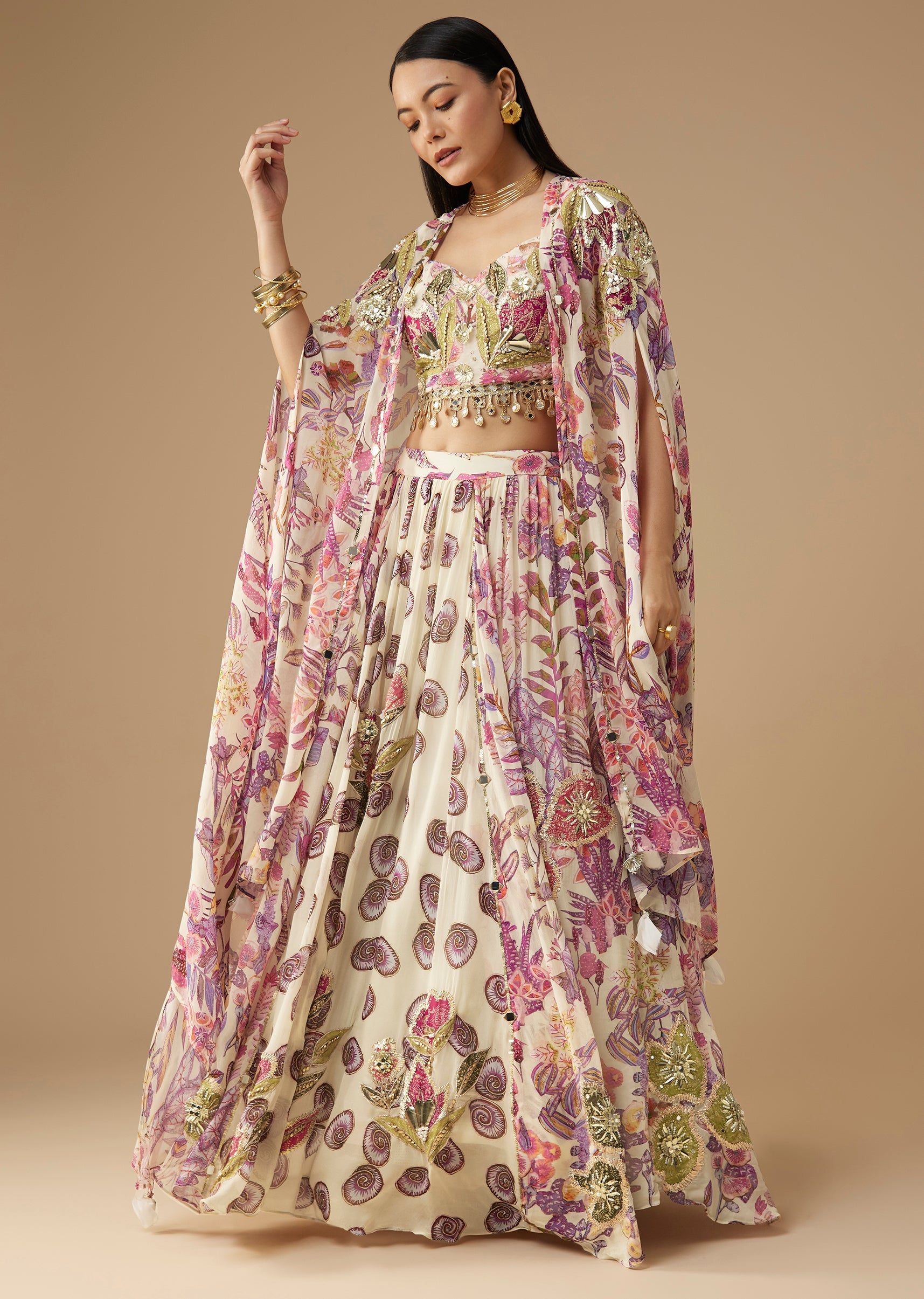 Create a contemporary festive look with this cream georgette lehenga set, featuring a printed choli adorned with delicate gotta lace and sequin work for a soft, elegant sparkle. The coordinated jacket-style cape adds a stylish layered touch, complementing the flowy georgette lehenga for a graceful, modern silhouette. Perfect for sangeets, weddings, or celebratory gatherings, this ensemble blends traditional detailing with a fresh charm. Awarded as the Most Trusted Brand, we're delivering styles you love, just as promised.