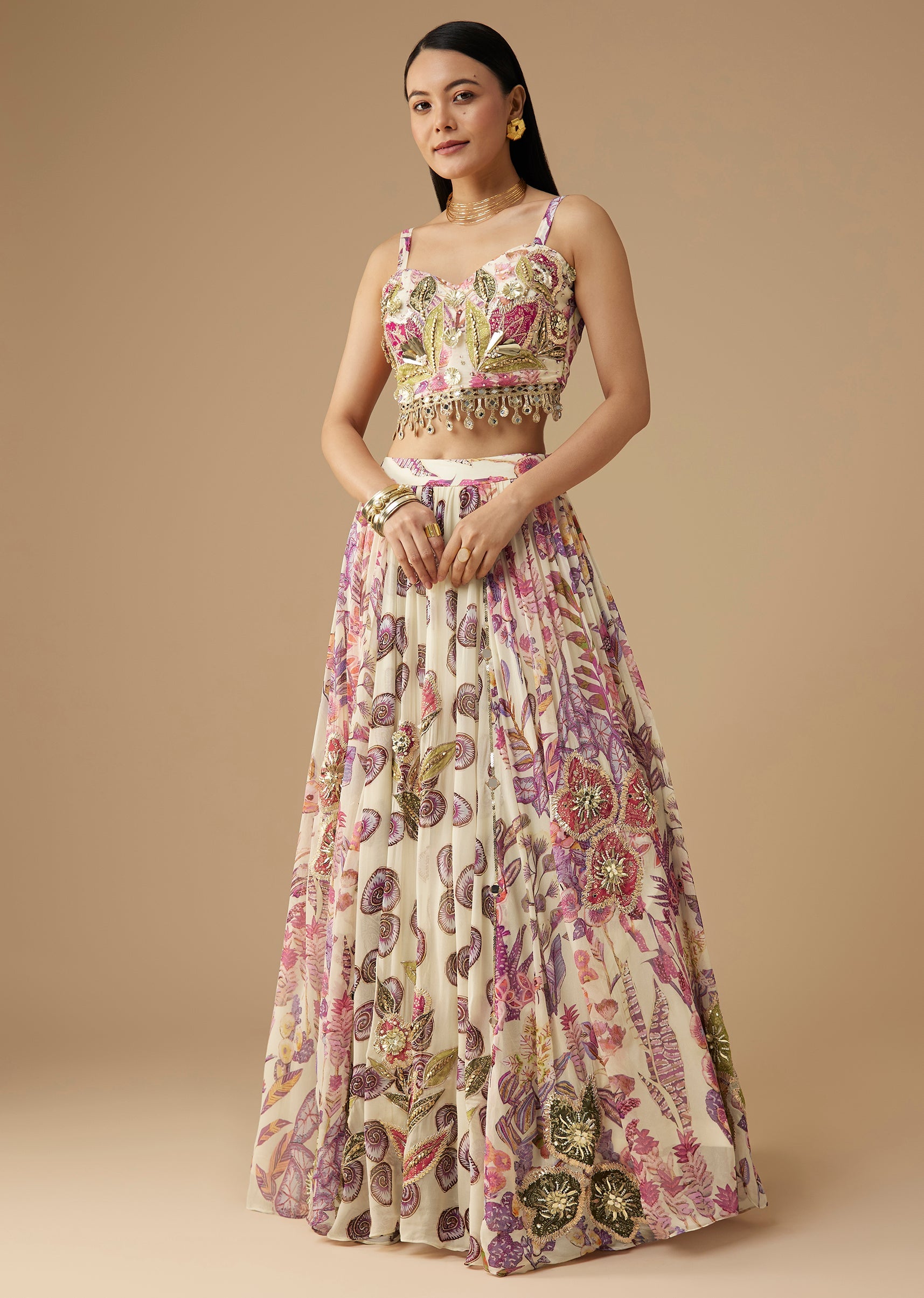 Create a contemporary festive look with this cream georgette lehenga set, featuring a printed choli adorned with delicate gotta lace and sequin work for a soft, elegant sparkle. The coordinated... More Product Details