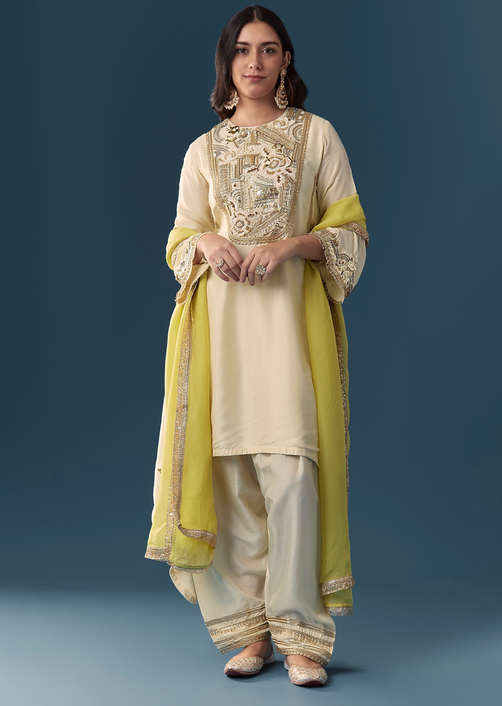 Cream Green Ombre Dupatta Kurta Set With Pant