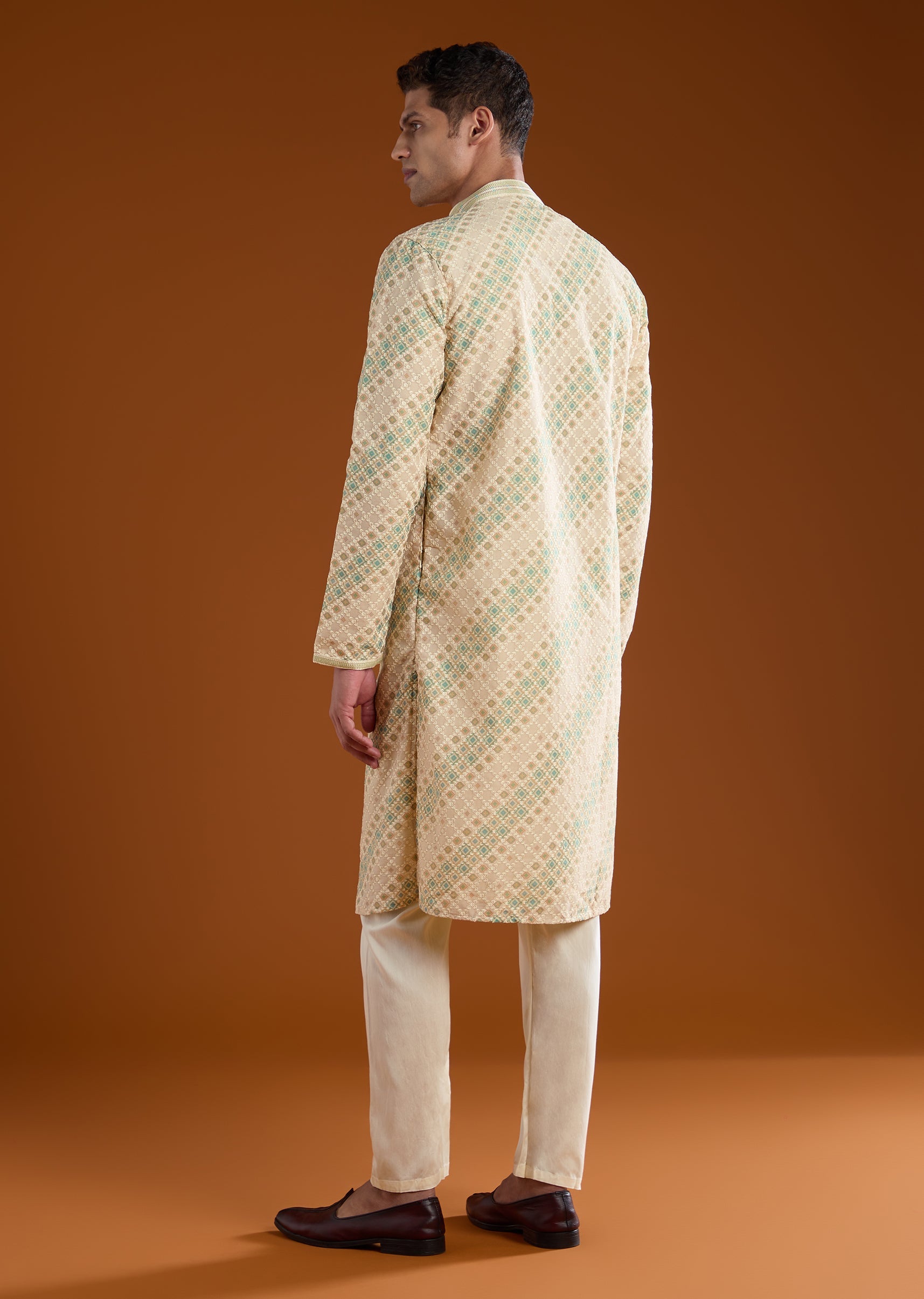 Add refined charm to your festive wardrobe with this jacquard kurta set featuring elegant resham thread work that enhances its rich woven texture. The full sleeve kurta is designed with... More Product Details