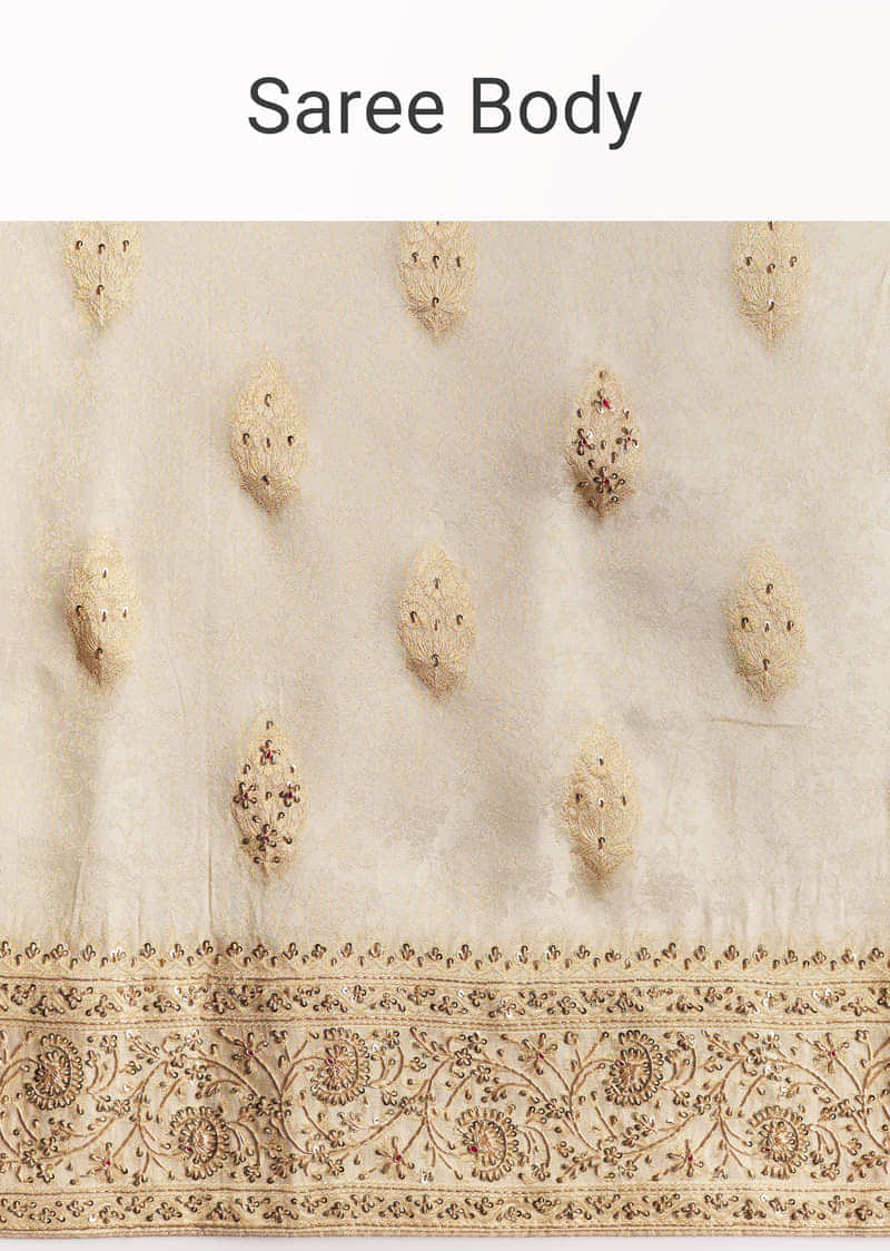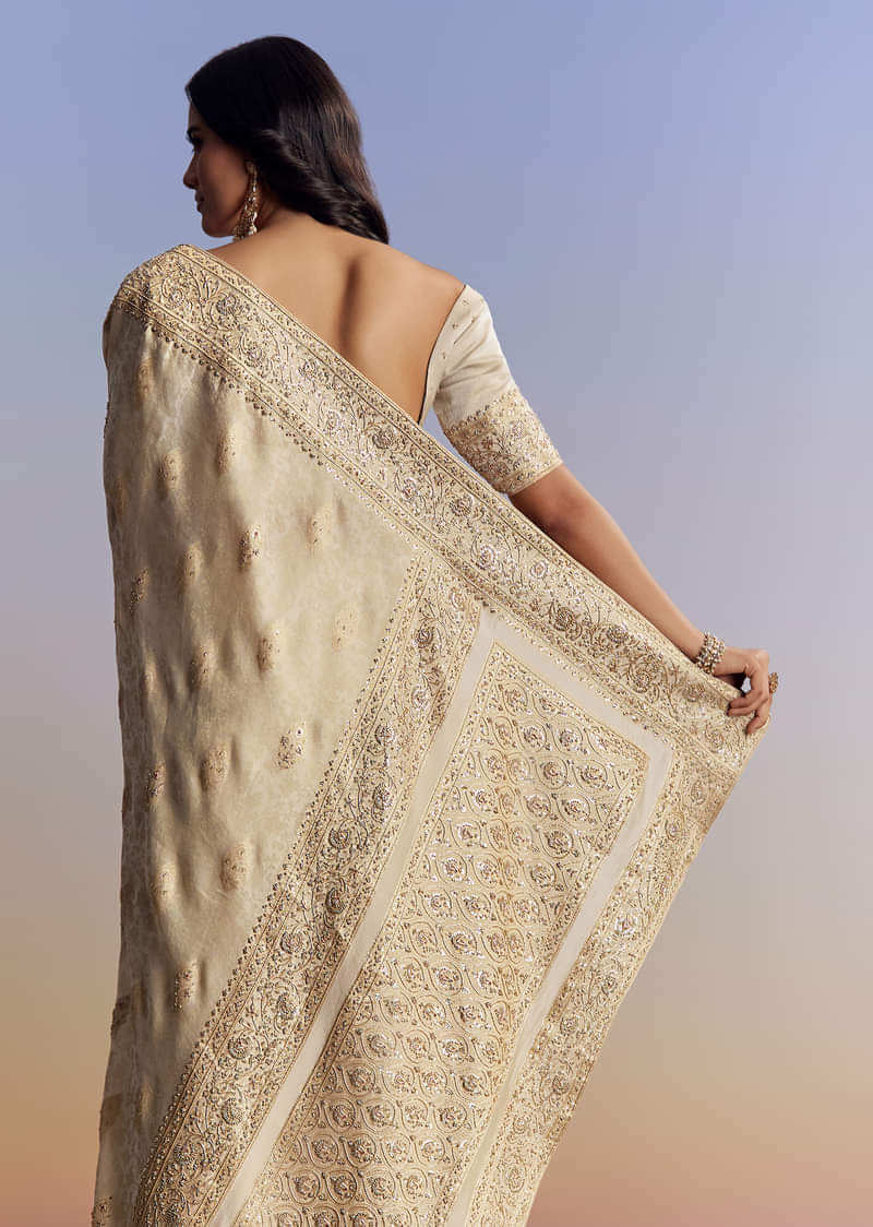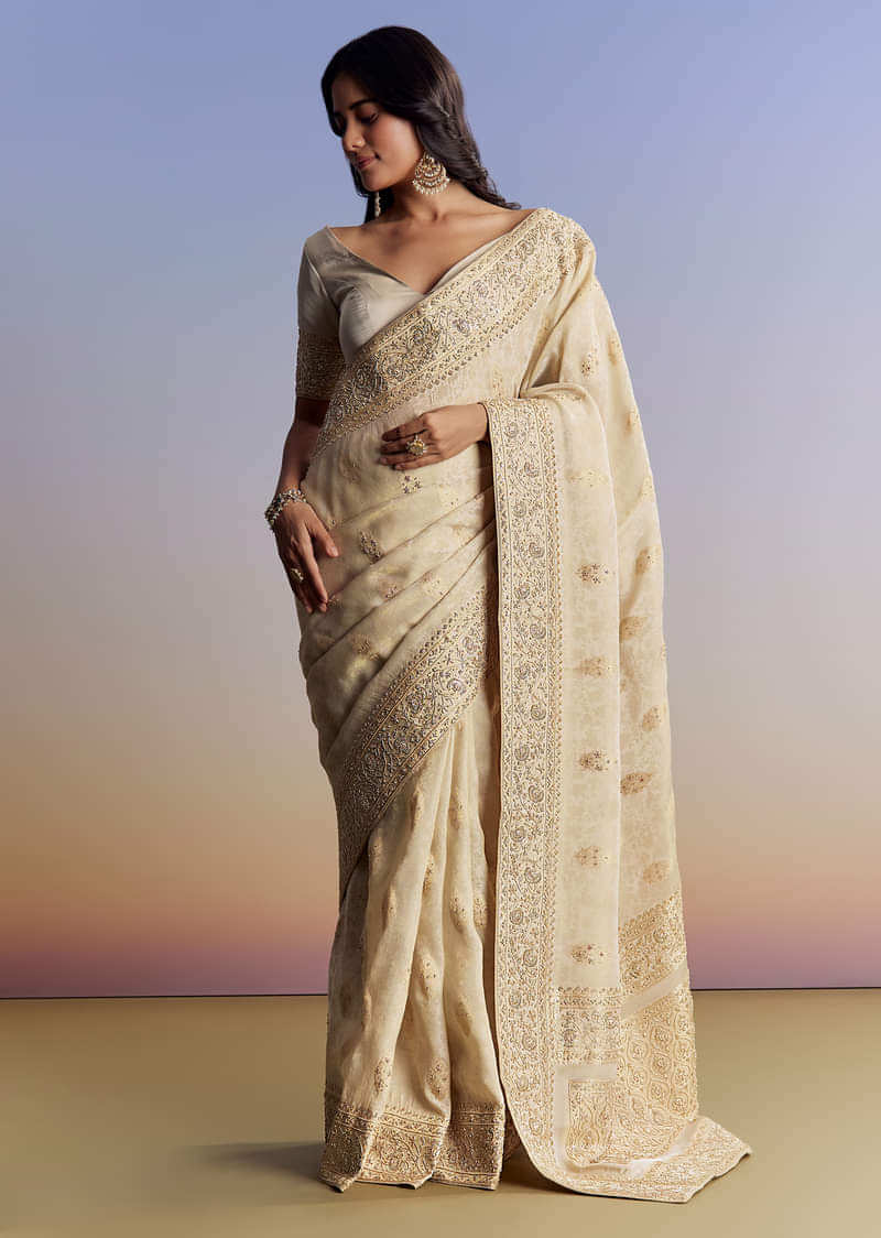 Cream Jacquard Silk Saree With Zari Brocade And Zardosi Embellished Pallu