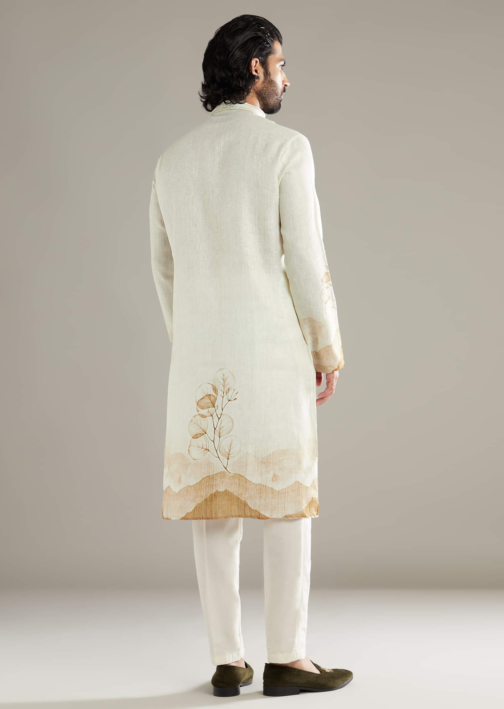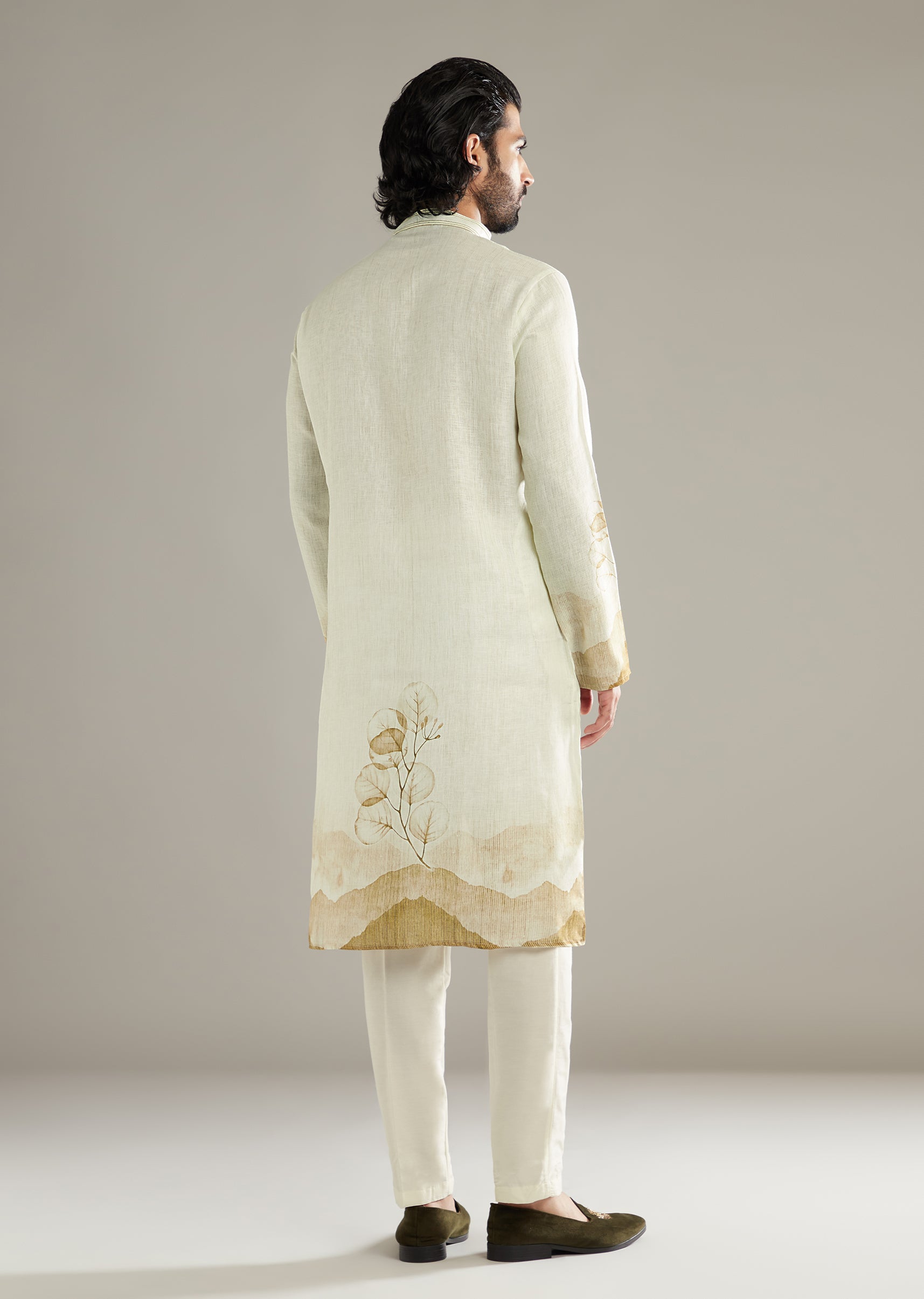 Laid-back polish comes easy in this cream linen blend men’s kurta set, where a soft floral print sits on a clean, versatile base. The fabric breathes well and keeps its... More Product Details