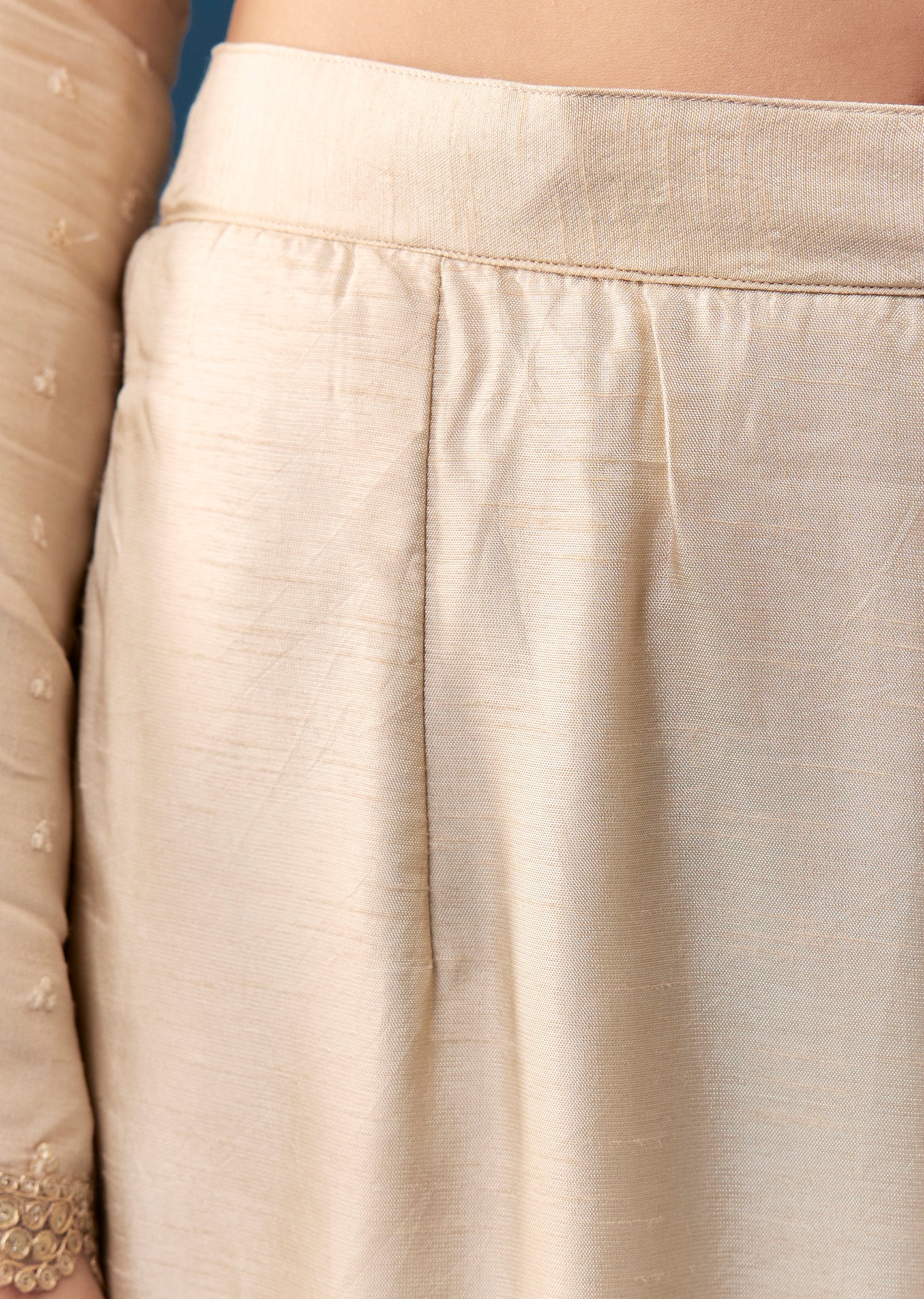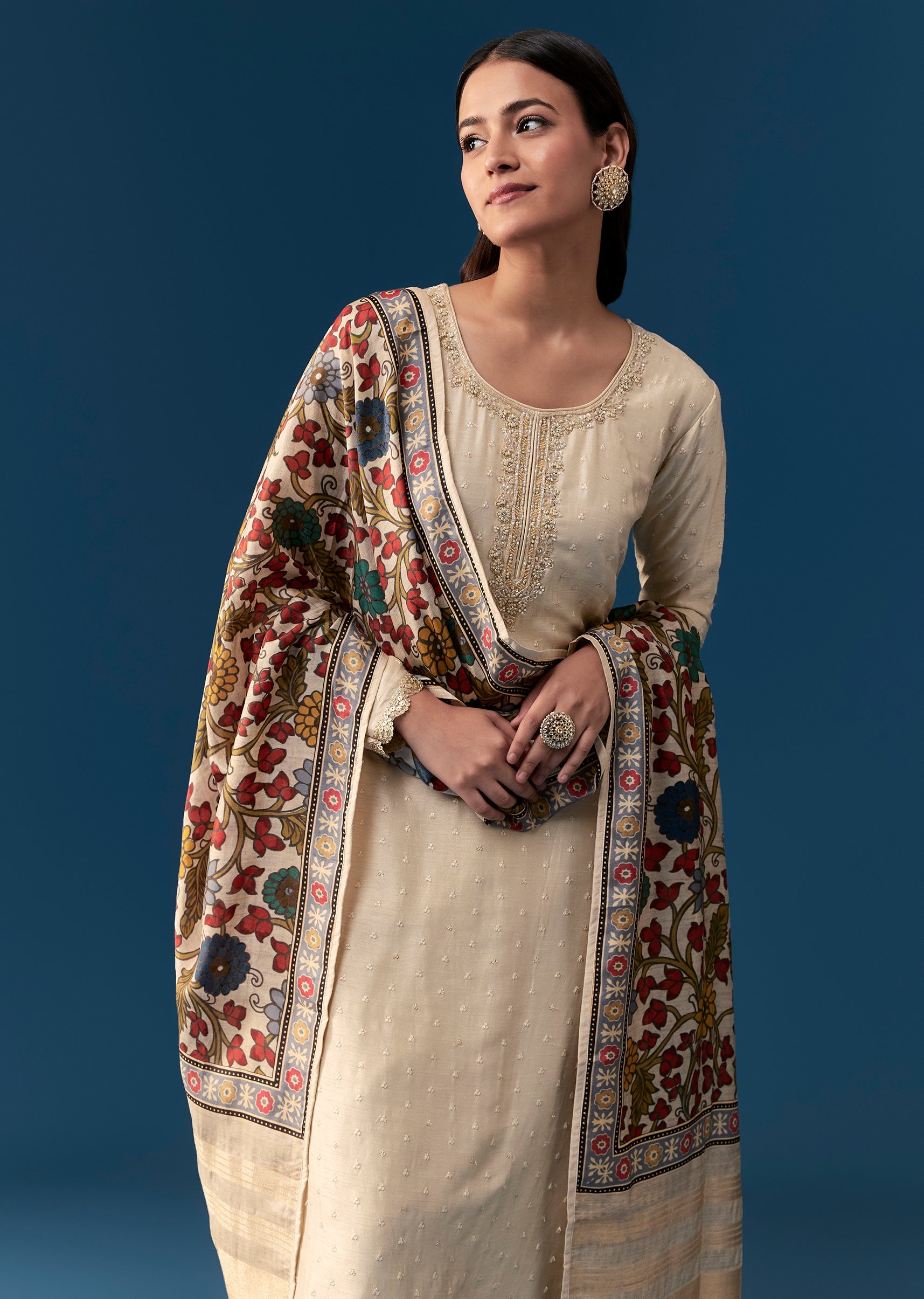 Exude timeless elegance with this cream kurta set adorned with intricate resham embroidery all over the kurta. The neckline is enhanced with delicate cut dana and moti work, adding a... More Product Details