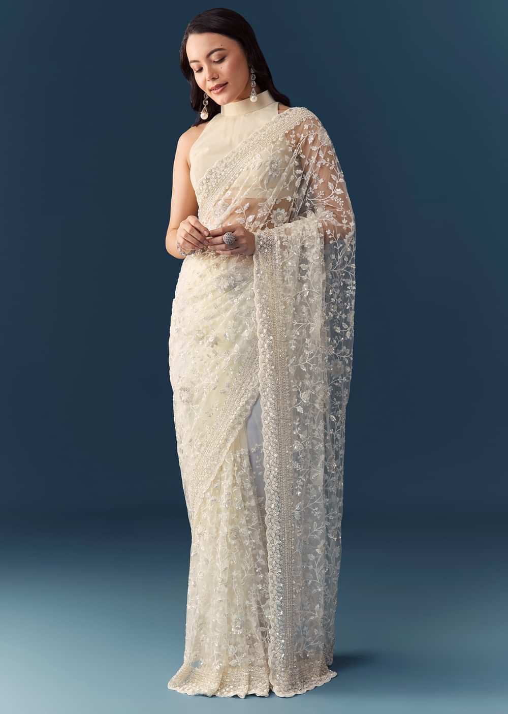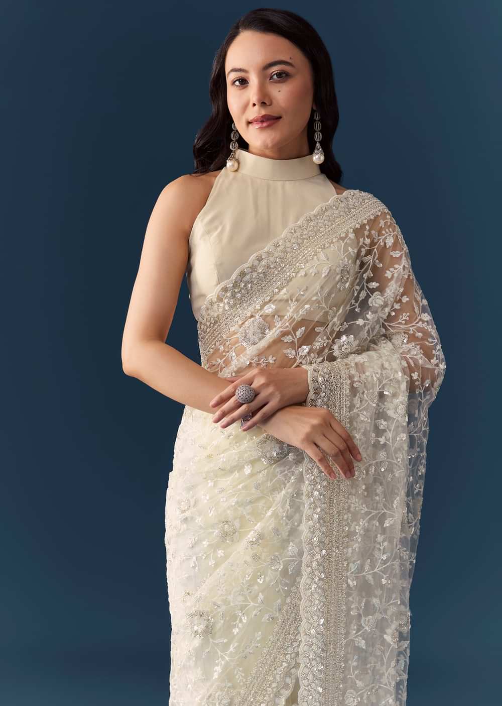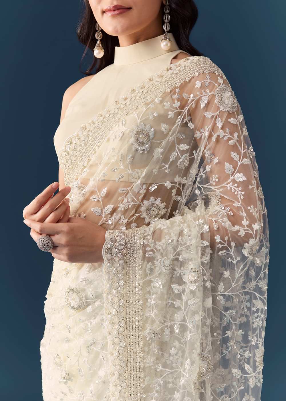 Cream Net Jaal Embellished Saree with Unstitched Blouse