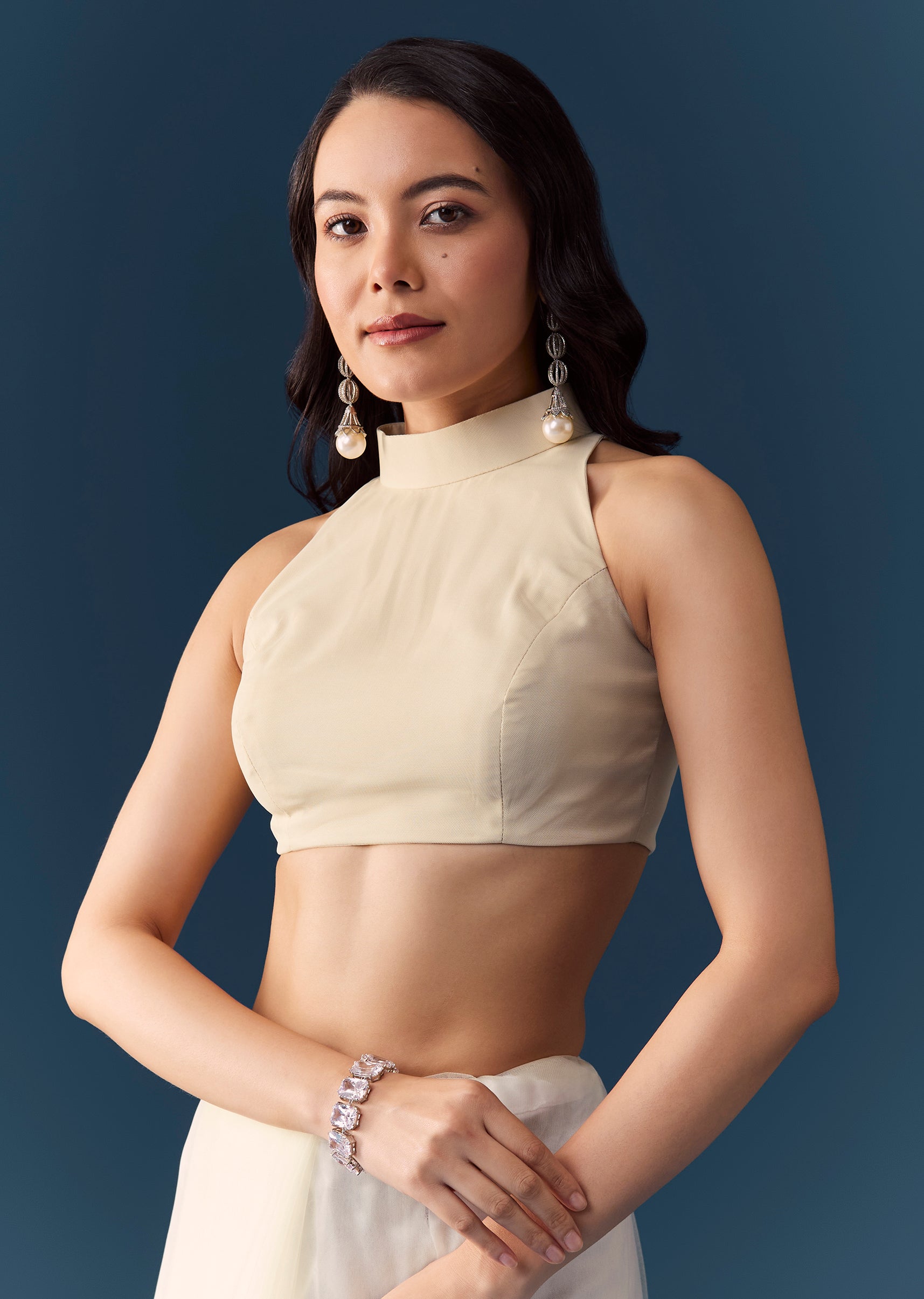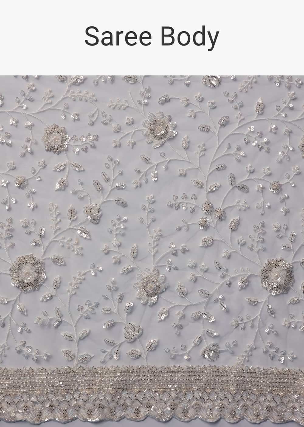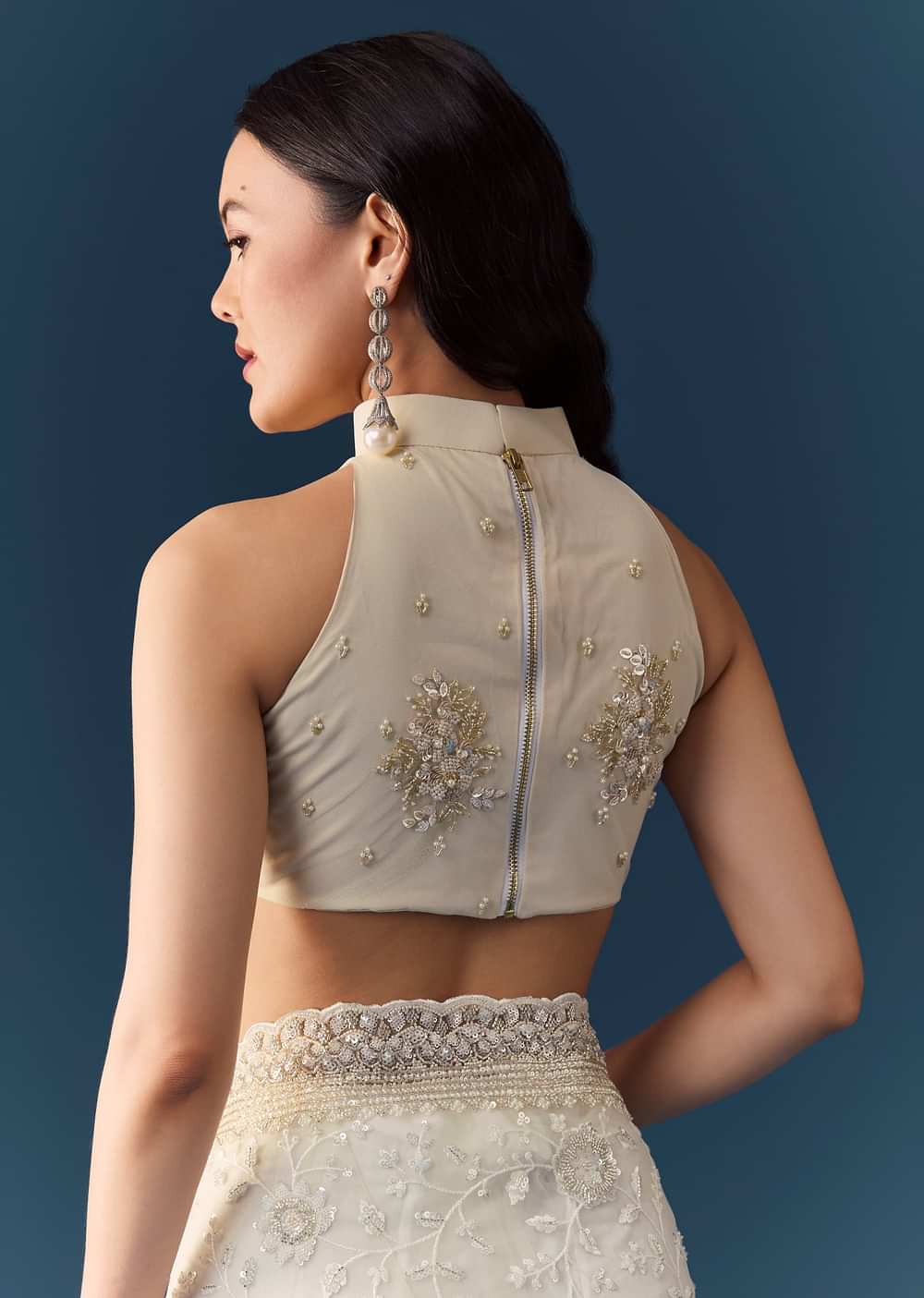Cream Net Jaal Embellished Saree with Unstitched Blouse