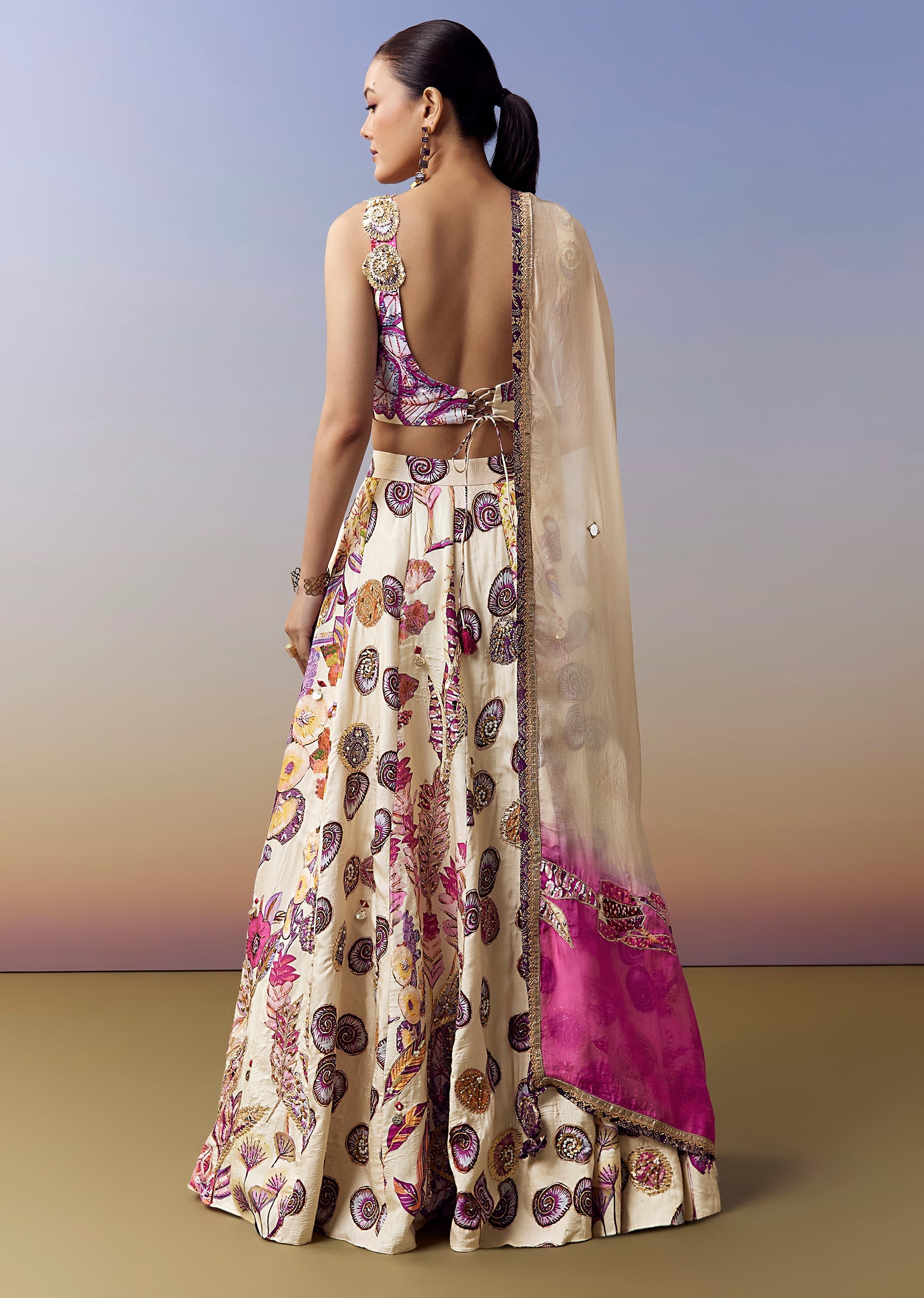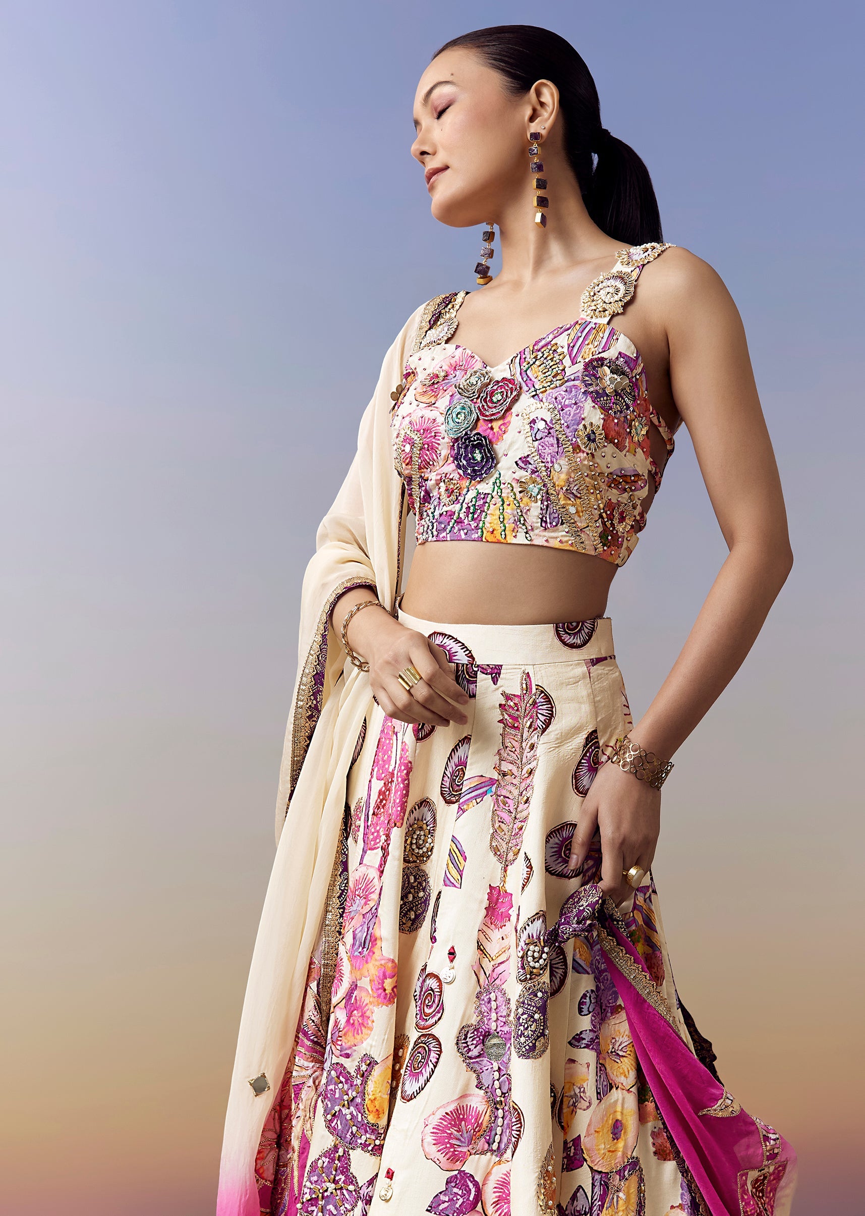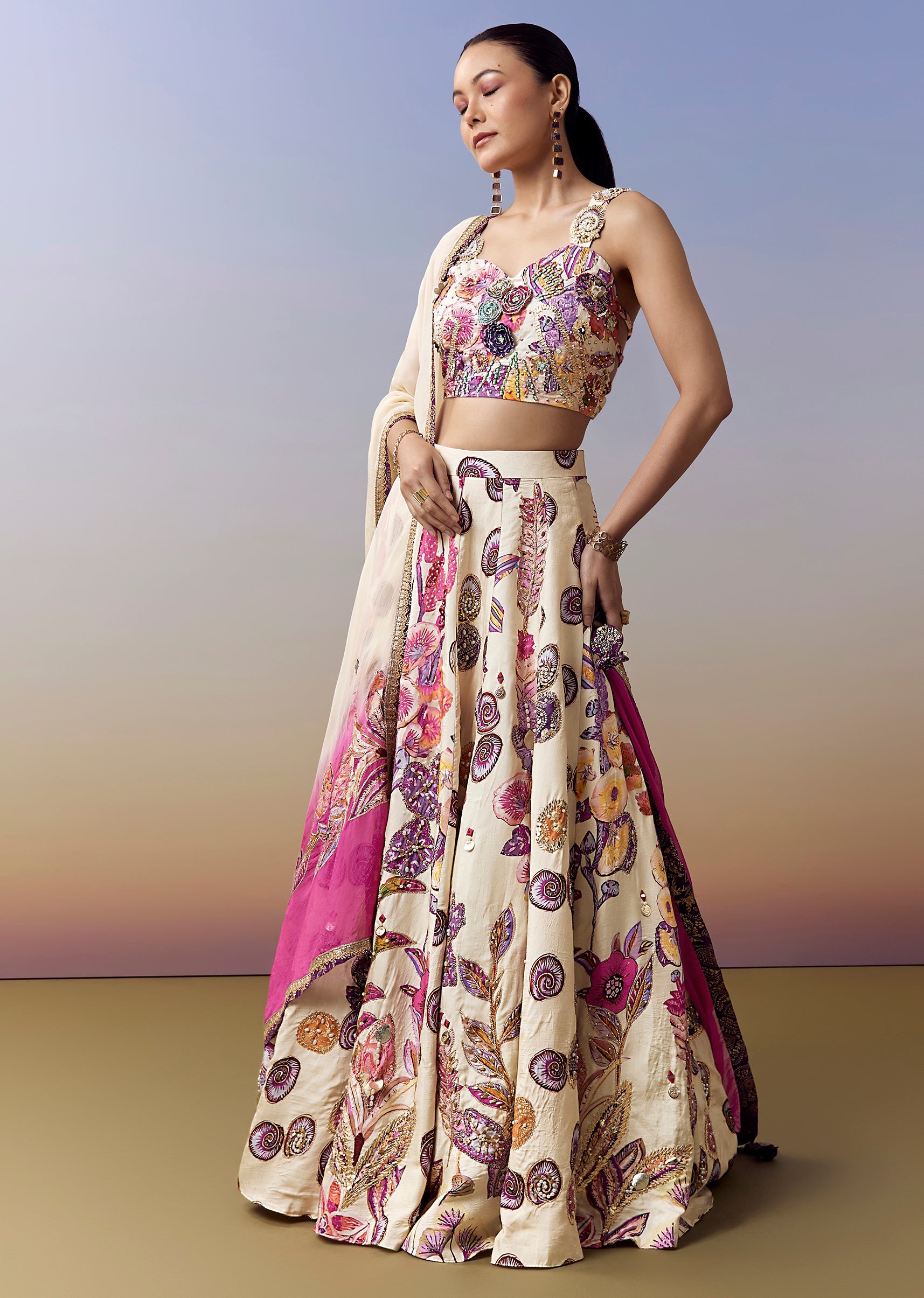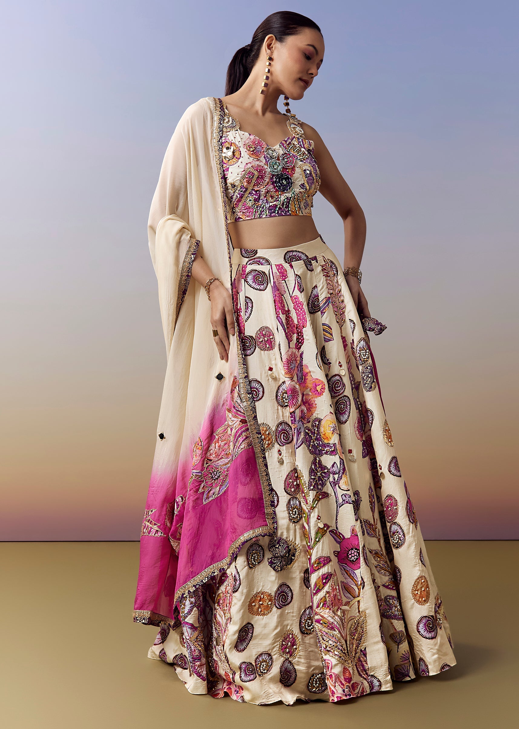A soft pastel dream, this cream lehenga is perfect for mehendi, haldi, and sangeet celebrations. The multi-hued circular lehenga features pronged detailing enriched with gotta, moti, and mirror work for a festive shimmer. The silk base is elevated with intricate embroidery, while the ombré dupatta adds a fresh, playful contrast. The sleeveless sweetheart-neckline choli completes the look with elegant charm and effortless grace. Awarded as the Most Trusted Brand, we're delivering styles you love, just as promised.