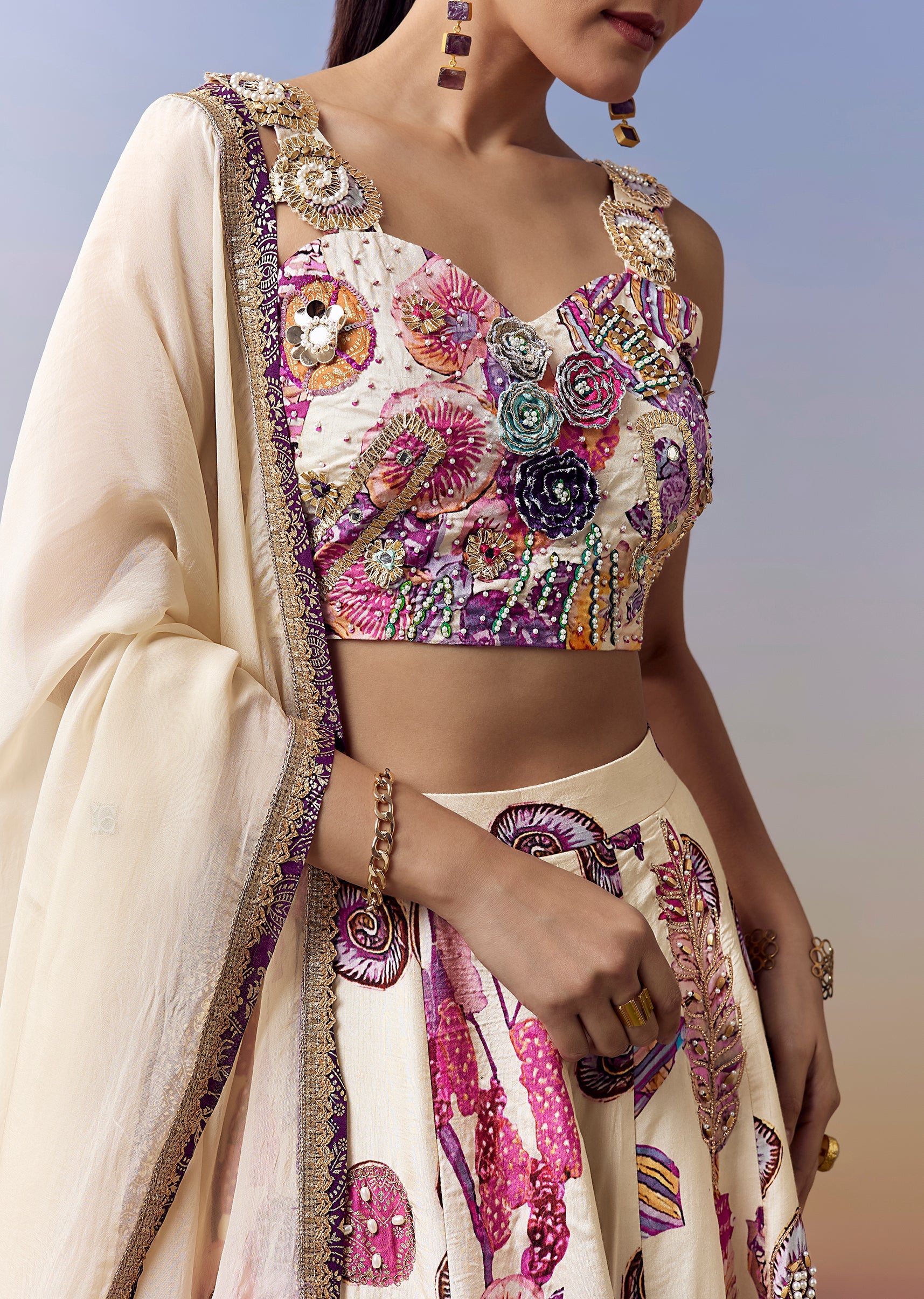 A soft pastel dream, this cream lehenga is perfect for mehendi, haldi, and sangeet celebrations. The multi-hued circular lehenga features pronged detailing enriched with gotta, moti, and mirror work for... More Product Details