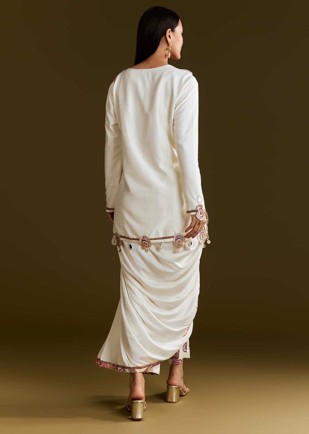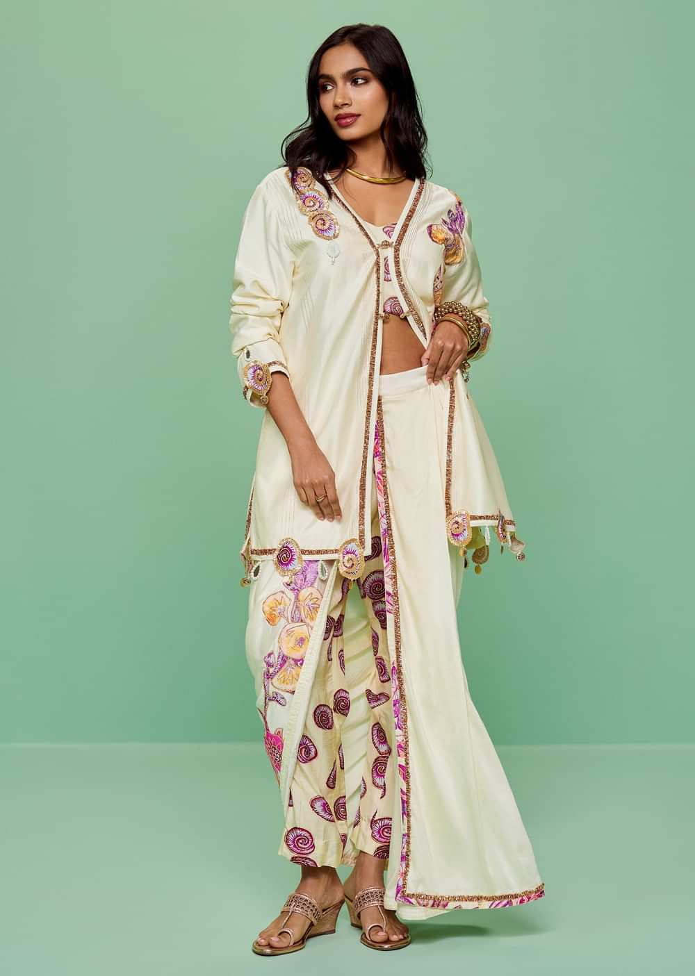 Cream Printed Croptop Set With Gotta Work Jacket And Dhoti Skirt
