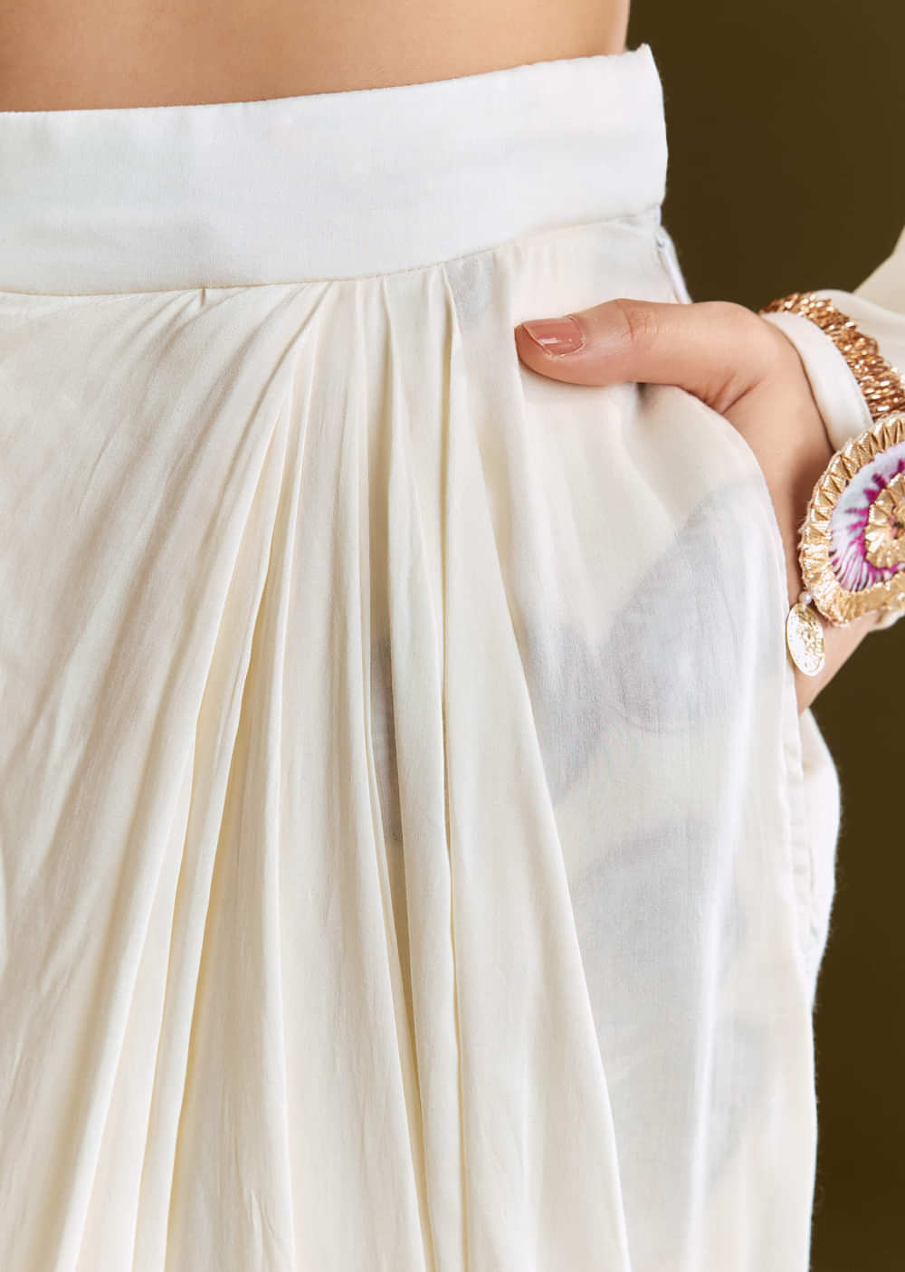 This printed cream ensemble fuses a stylish croptop, a gotta work jacket, and dhoti-style skirt—a perfect party starter with traditional flair. Awarded as the Most Trusted Brand, we're delivering styles you love, just as promised.