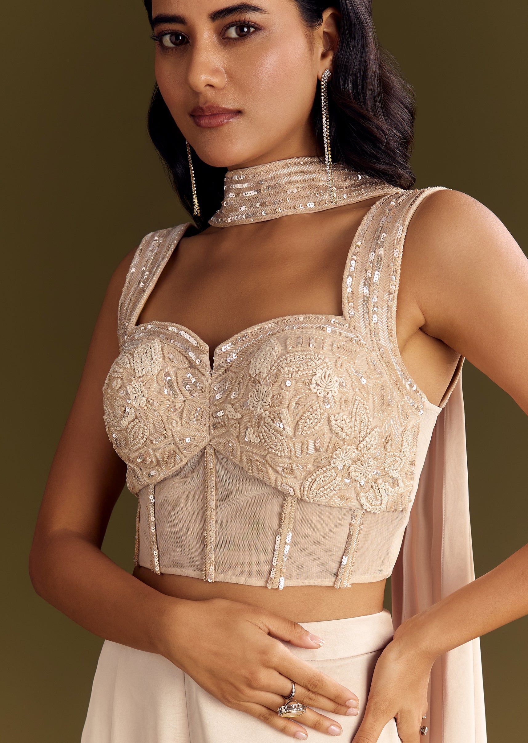 Cream Satin Bustier Palazzo Suit With Choker Dupatta