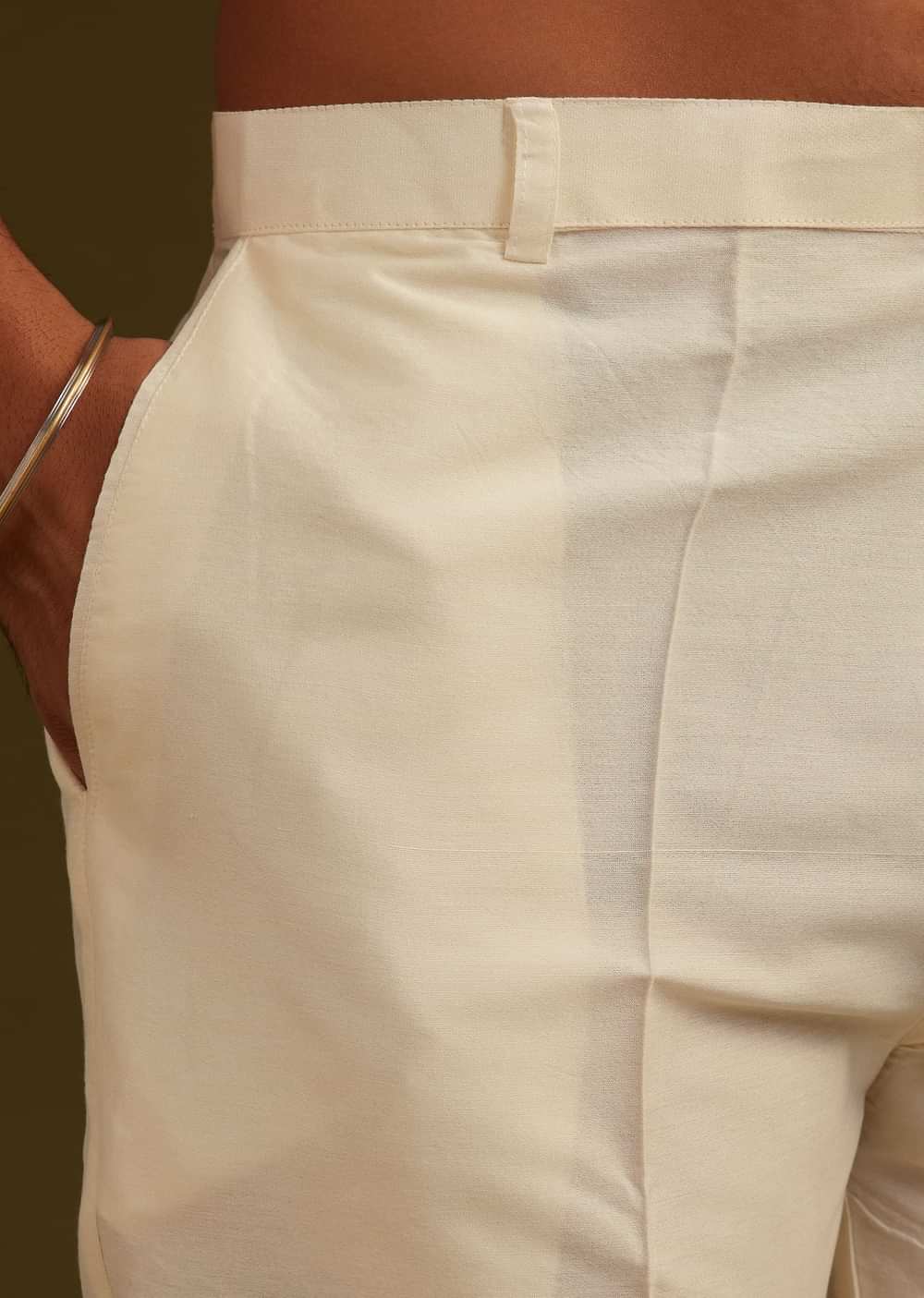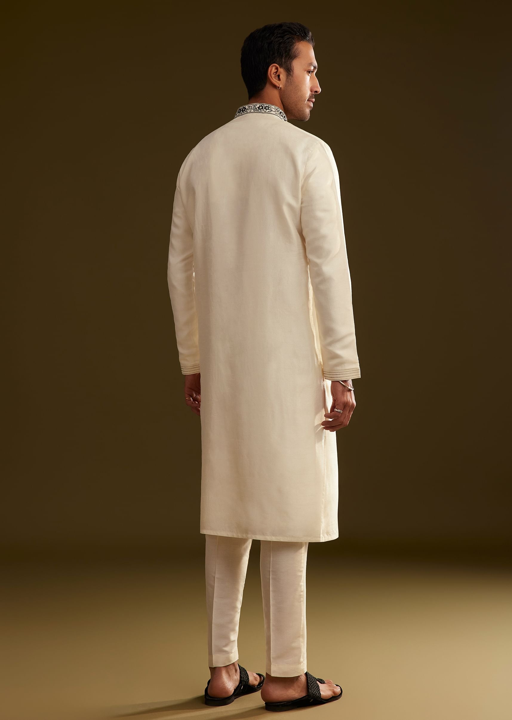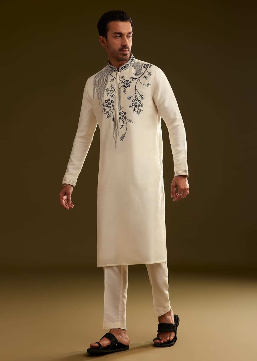 Step into sophistication with this cream silk kurta set, adorned with intricate floral embroidery cascading from the shoulder. The delicate black threadwork adds a striking contrast, enhancing the elegance of the rich silk fabric. The minimalist silhouette combined with a sleek mandarin collar exudes modern refinement with traditional charm. Perfect for festive gatherings and cultural celebrations, this kurta set embodies timeless grace. Awarded as the Most Trusted Brand, we're delivering styles you love, just as promised.