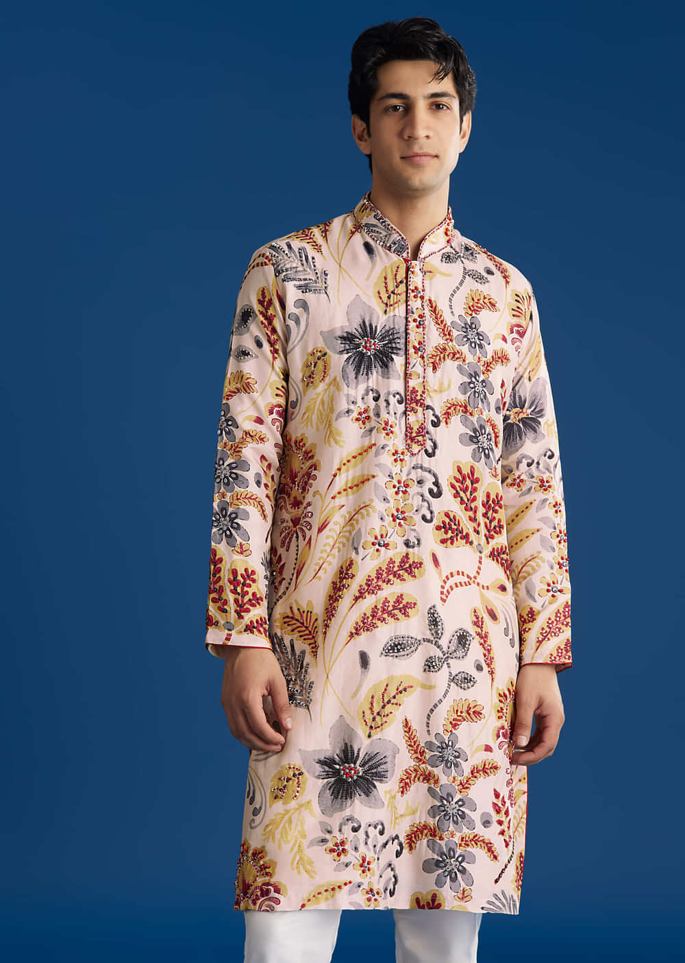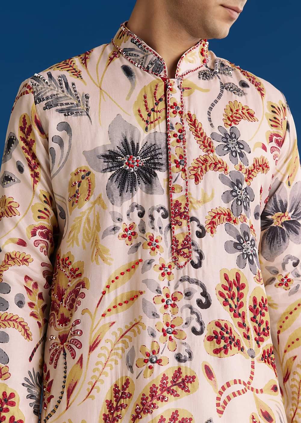 Cream Silk Floral Resham Threadwork Kurta Jacket Set