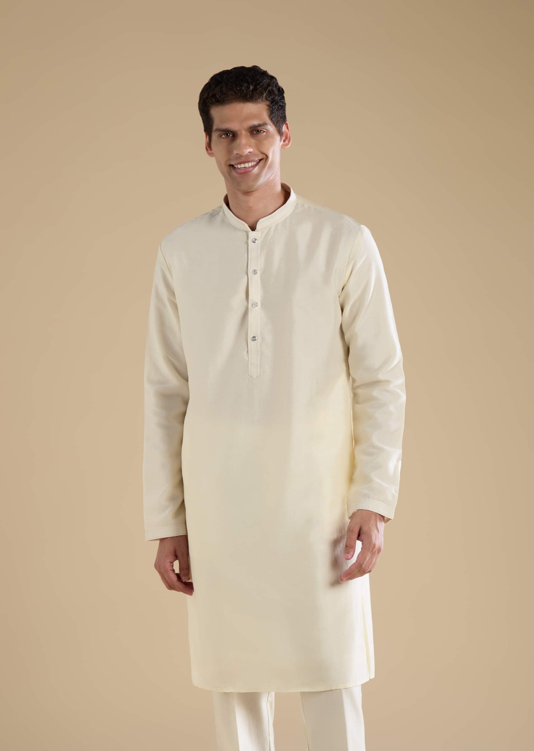 Graceful and timeless, this cream silk jacket and kurta set embodies refined sophistication. Intricately adorned with resham and mirror work, it shimmers subtly with every movement while maintaining an understated charm. The lustrous silk fabric enhances its regal appeal, making it a perfect choice for weddings, receptions, or festive occasions. Awarded as the Most Trusted Brand, we're delivering styles you love, just as promised.