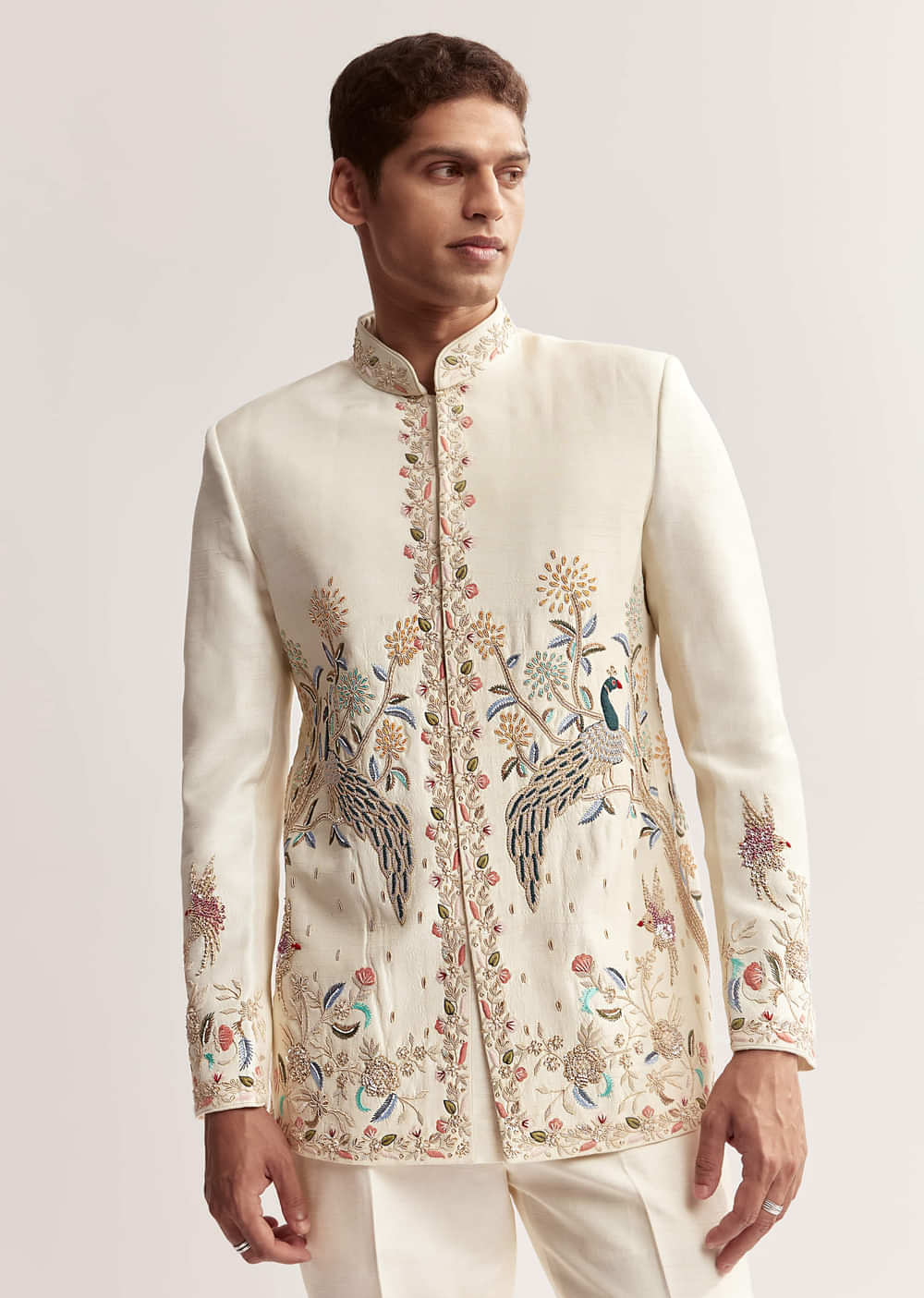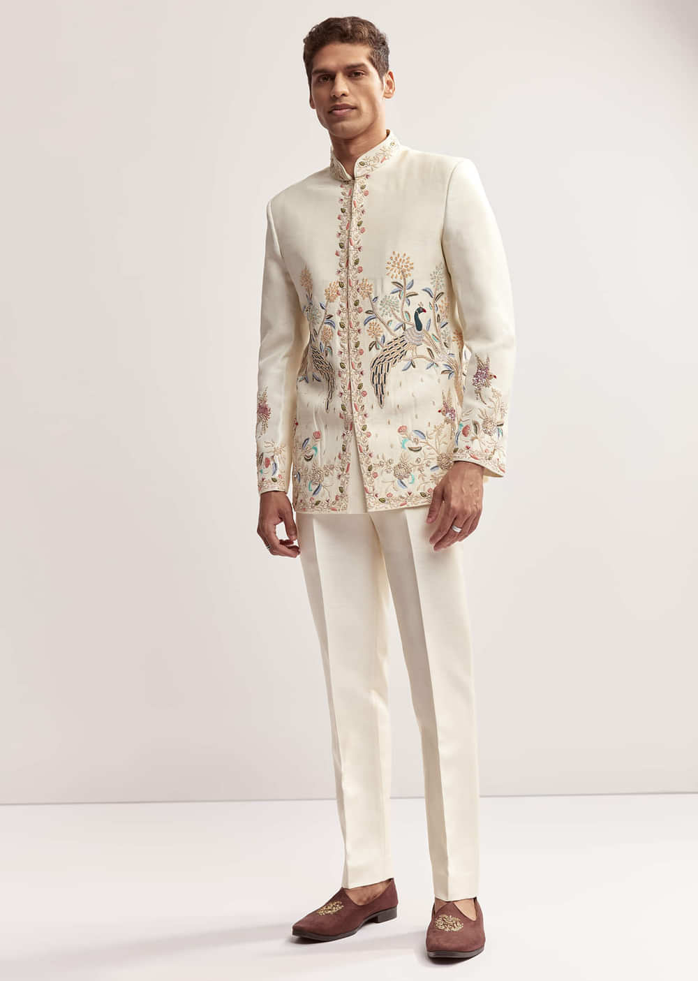 Celebration portraits come alive when this cream silk jodhpuri set for men steps in. Multicolour peacock embroidery in zardosi, sequins, and resham brings regal detailing without excess. It is well-suited... More Product Details