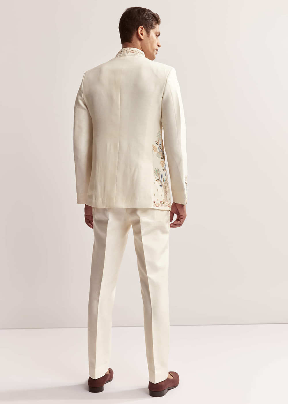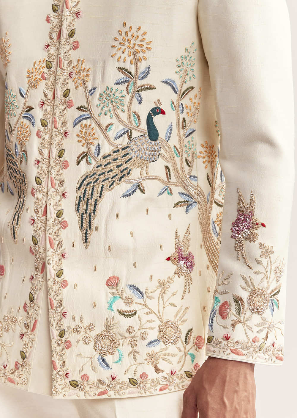 Cream Silk Jodhpuri Set For Men With Multicolour Peacock Embroidery